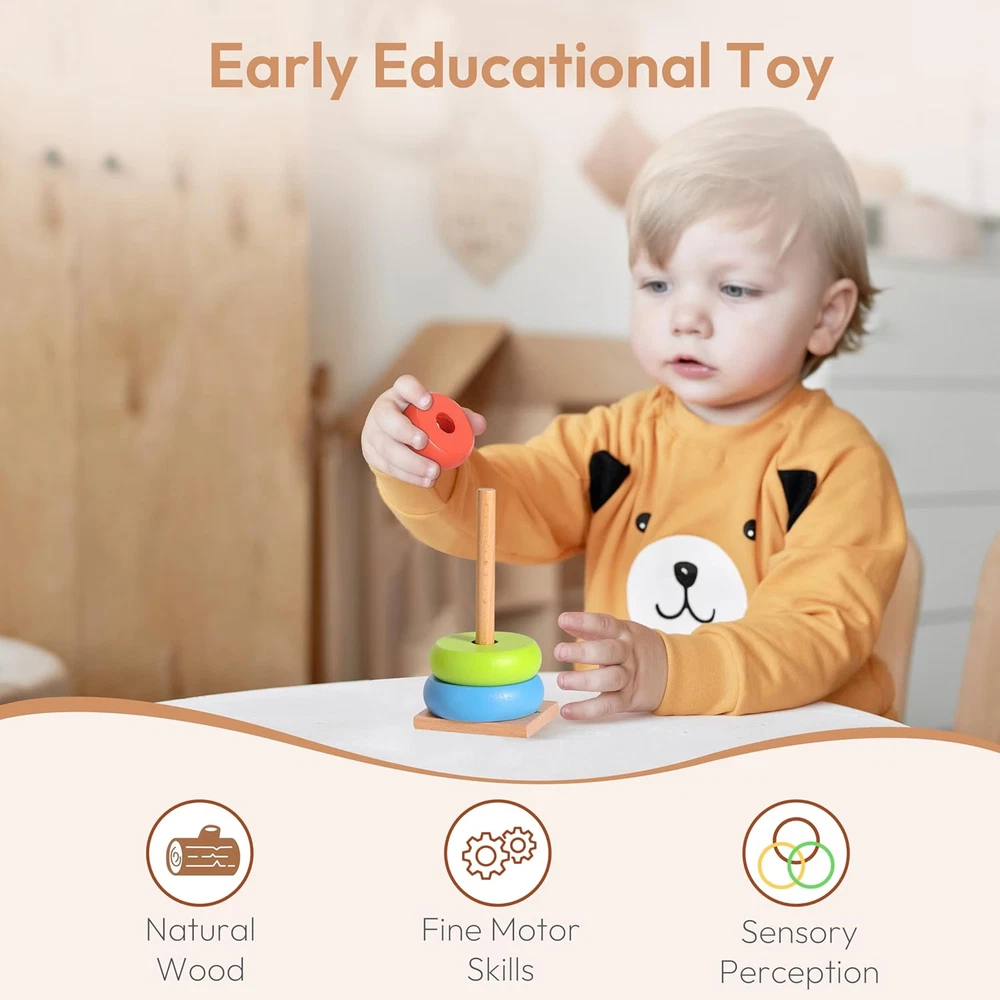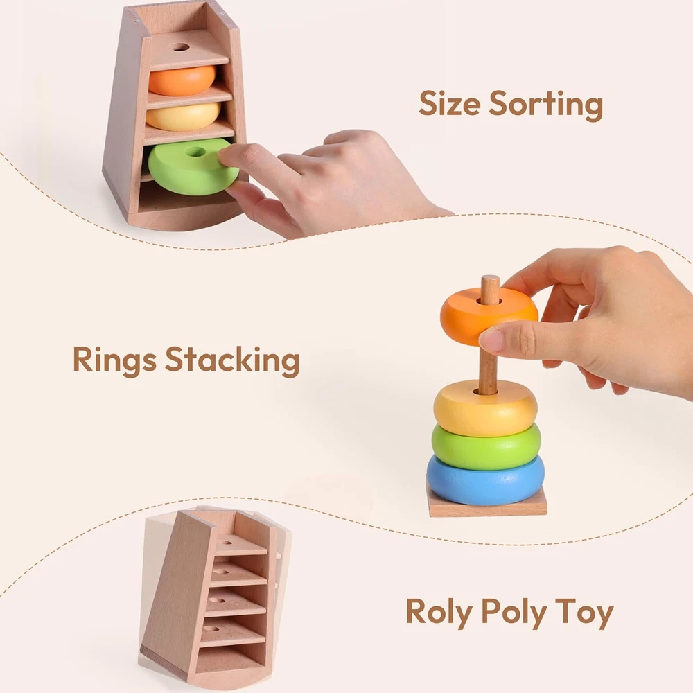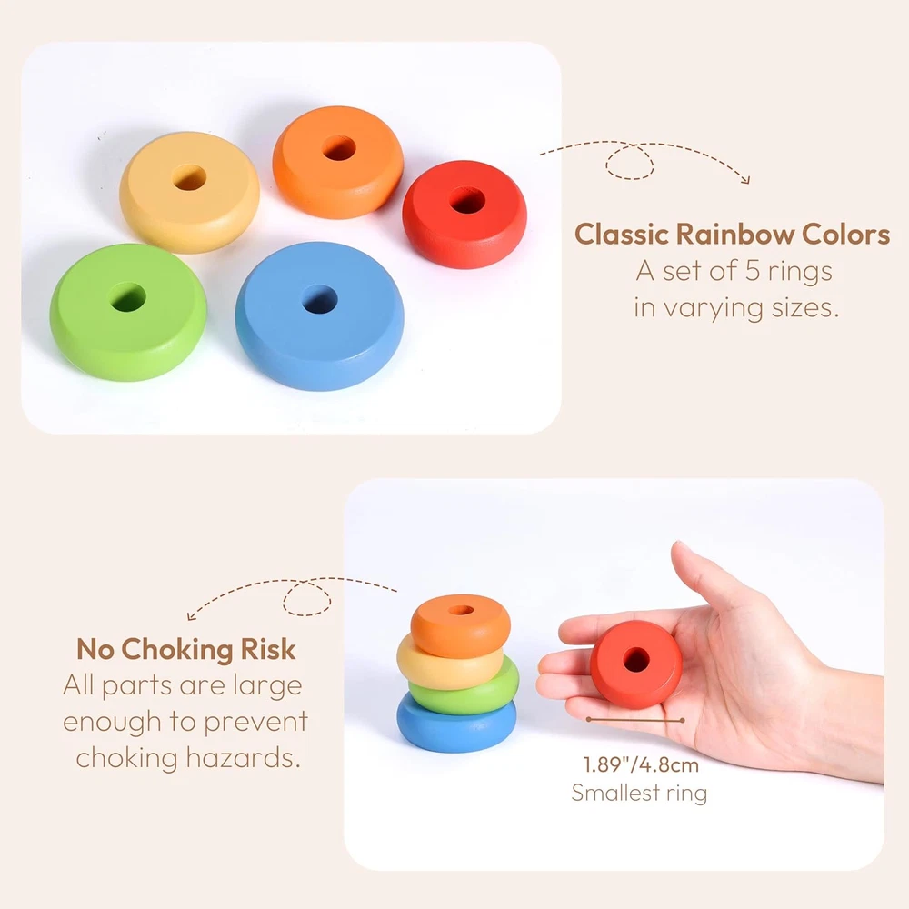 Montessori Size Sorting Toy: This baby stacking toy offers sorting and stacking modes of play. Children learn to distinguish sizes by placing different-sized rainbow rings into corresponding slots. They can also flip the top board upside down to play stacking games on a flat surface. This toy is designed to develop children's fine motor skills and sensory abilities Rich Color Recognition: This rainbow stacker features 5 different colored rings, which not only help children recognize and differentiate colors but also come with a wobbling base that adds to the fun of play. This wooden stacking toy encourages children to actively explore and discover, enhancing their cognitive and motor skills, making learning both enjoyable and effective Safe Materials: This wooden Montessori toy is made from natural beech wood, with a smooth surface coated in safe water-based paint, ensuring safety and durability during play. The smallest ring has a diameter of 1.89 inches, meeting safety standards and posing no risk of swallowing or choking Easy to Carry: This stacking rings baby toy is compact and portable, coming with a excellent canvas bag, making it suitable for travel and outings. Whether at home, in the car, or on vacation, children can enjoy the fun and educational opportunities this toy provides, ensuring continuous engagement and entertainment Educational Toy for Toddlers: This unique Montessori baby toy can greatly help children develop hand-eye coordination and cognitive development. It is very suitable as a holiday such as a birthday, Christmas for children aged 18+ months, to express your love to your baby, grandson, or friends. Children will be very happy and play to their heart's content, and adults and children can spend unforgettable time together Product Description