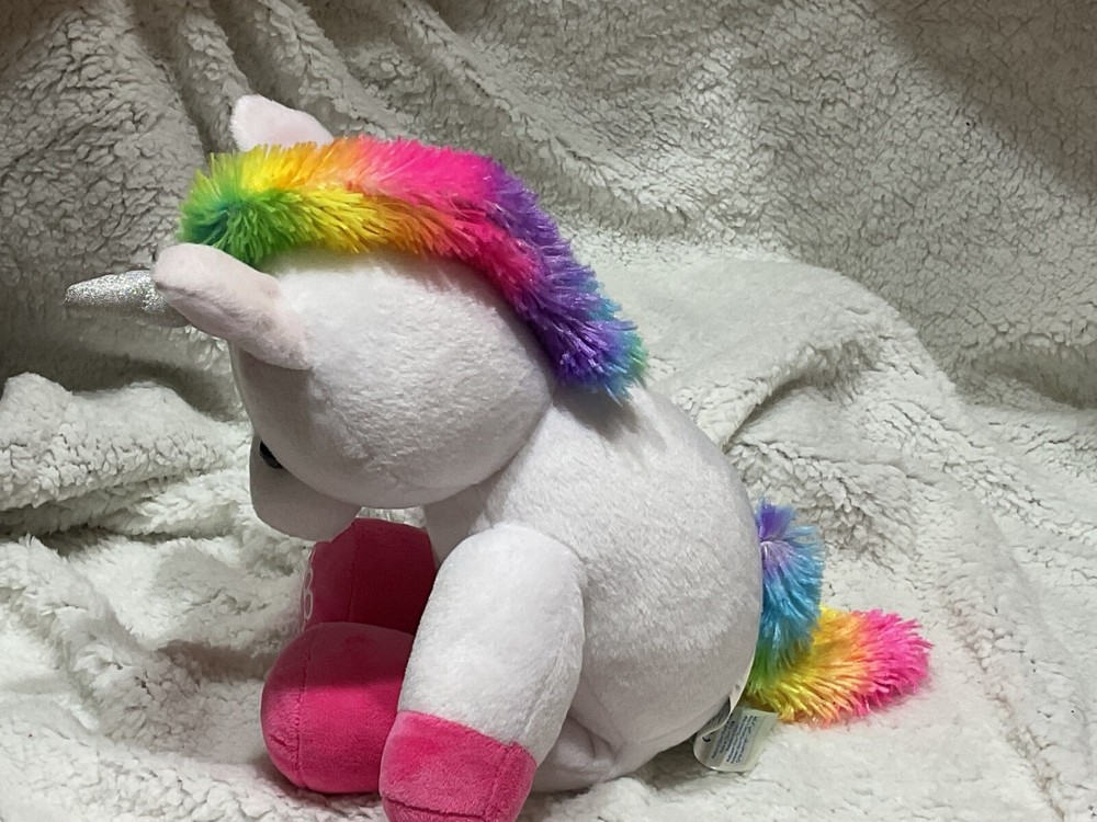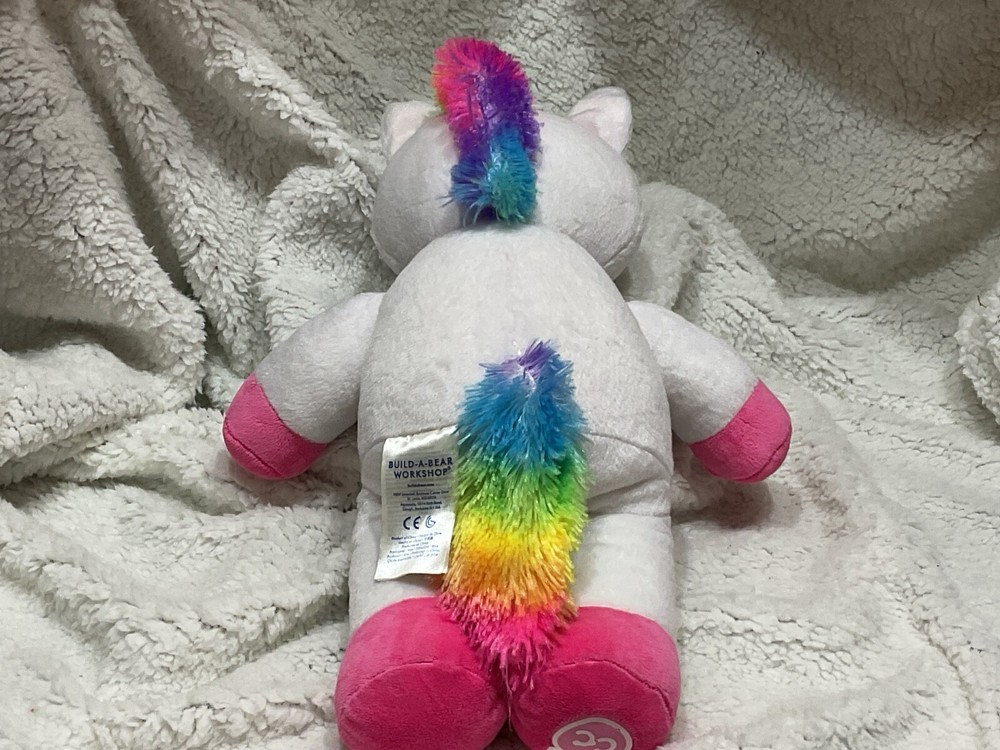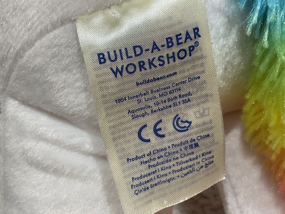 The Build-A-Bear Rainbow Unicorn Condo Cub White 2019 is a 15-inch plush bear with a blue eye color, featuring a rainbow unicorn character design. This exclusive Condo Cub includes a dress made of polyester material and is part of the Rainbow collection by Build-A-Bear Workshop. With a unicorn theme and manufactured in the USA, this original plush bear is a perfect addition for all occasions for children who love colorful and magical creatures.
