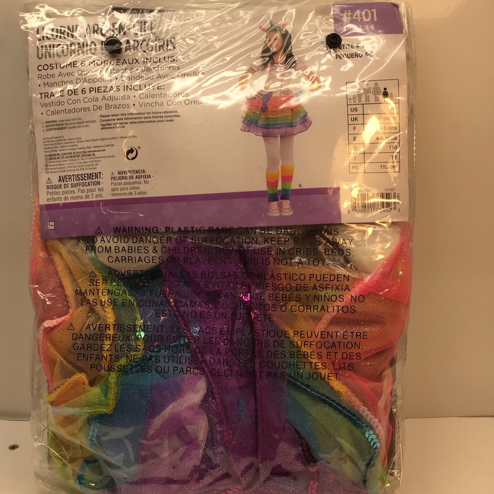 The Rainbow Unicorn Halloween Costume is a vibrant and fun outfit perfect for young girls looking to dress up for Halloween. The 6-piece set includes a colorful rainbow unicorn design, making it easy to transform into a magical and whimsical creature. With a size small, this costume is sure to fit just right for a comfortable and festive look. Perfect for Halloween parties or trick-or-treating, this costume will bring joy and smiles to any young girl's face. New in package