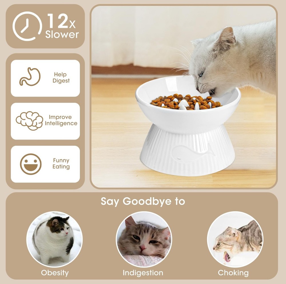 Ceramic Cat Slow Feeders Slow Down Eating with Upgraded Ridges. Fast eating may swallow large amounts of food and air into the stomach, which can lead to choking, vomiting and other indigestion. This obstacle ridges are designed higher and irregular, which can effectively train your puppy and kitty to eat slowly. Help improve pets' digestion, prevent bloat, choking and obesity. Raised Stand for Neck & Joint Protection. This raised slow feeder cat bowls increases the height of feeding station to 4.33", so that pets no longer have to strain unnaturally to eat from ground level, which makes it easy to swallow and reduce strain on your pet's neck and joints. Safe Ceramic & Easy to Clean and Reheat. The veterinarian recommends using a ceramic bowl than plastic one. Our cat slow feeder wet food bowl is made of high-temperature fired ceramics, free of BPA,lead or cadmium. Besides, porcelain finish is not easy to breed bad things, which prevents pet's black chin and feline acne. The smooth surface is easy to clean in dishwasher and warm up homemade food in microwave. Spillage-Proof Flat Opening with Higher Edge. If you are fed up with cleaning messy floor for you pet every day, our slow eating cat bowl is better than any tilted ones. designs this cat food bowl slow feeder with flat opening and higher wall to prevent food spillage. It can hold different sizes of pet food bought or made by yourself. Henceforth, you don't need to worry about your crazy eater messing up the floor every day. Prevent Moving or Tipping with One-piece Design & Weighted Base. Unlike those with separated stand, our one-unit design with wider and weighted ceramic base can prevent raised cat slow feeder bowl from moving around or tipping over when eating. It reduces the mess and scratches on the floor. Besides, you don't have to waste time to assemble or disassemble for daily refilling and cleaning. For medium and large cats, and small-size dogs. Capacity:1.7 cups (13 ounce) for wet food, 1 cup for dry food. Note: The height 4.33" does not work for kitten or small-size cat.