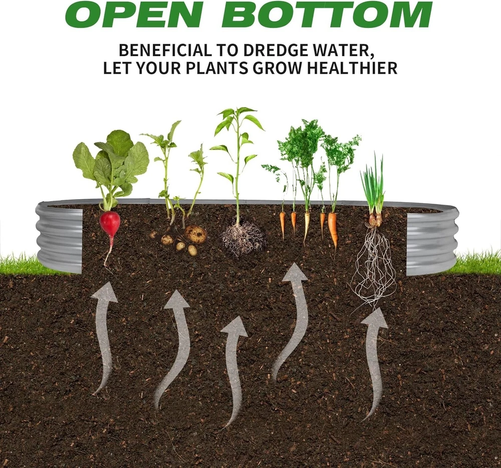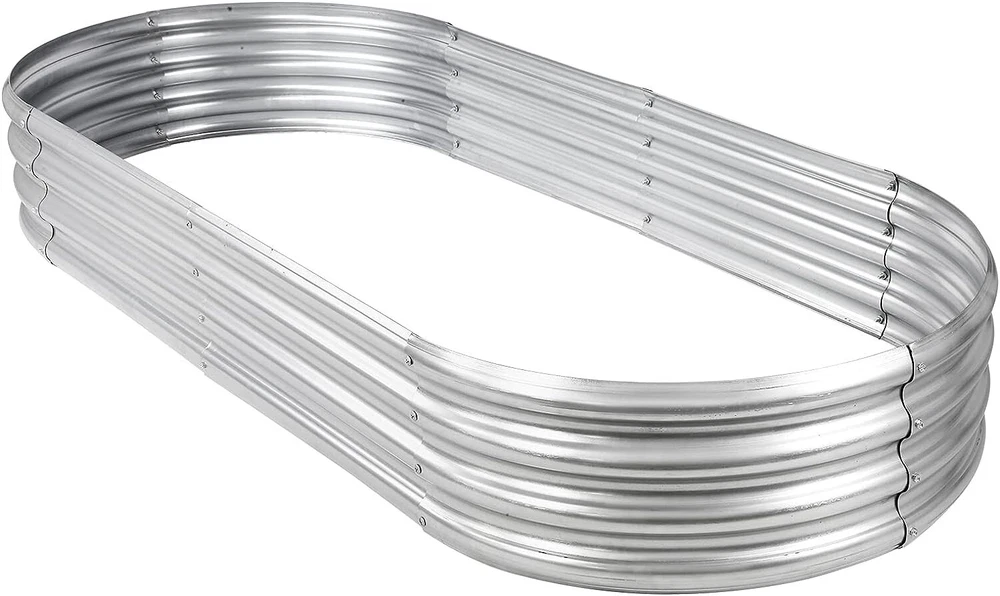Raised Garden Bed Galvanized Planter Box Outdoor, Oval Large Rot-Resistant Metal Garden Bed Planter for Vegetables Flower Herb Silver Size: 60×29×11 in, 68 gallons of soil required. Built to Last: Our raised garden beds outdoor are made of galvanized metal sheet, double-layer anti-corrosion galvanizing and oval structure design. Compared with the ordinary rectangular elevated garden bed with a thickness of , it will be the right choice for you. Open Bottom: This galvanized planter is designed with an open base, which can effectively avoid water accumulation and decay, protect the roots of plants, and allow the roots to better absorb nutrients. Easy to Assemble: The raised garden bed is very easy and quick to put together, even if you're older. Necessary hardware and instruction are included. satisfaction: 30 days free return, one satisfaction.