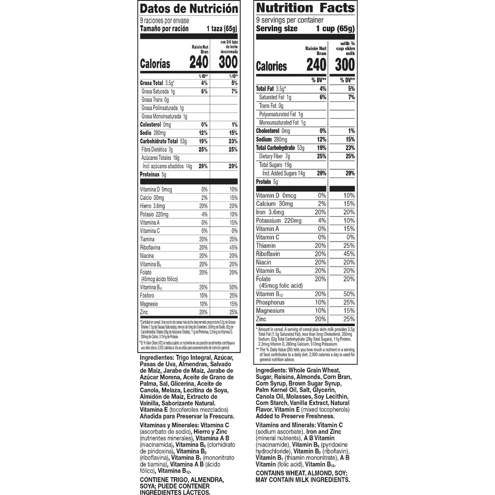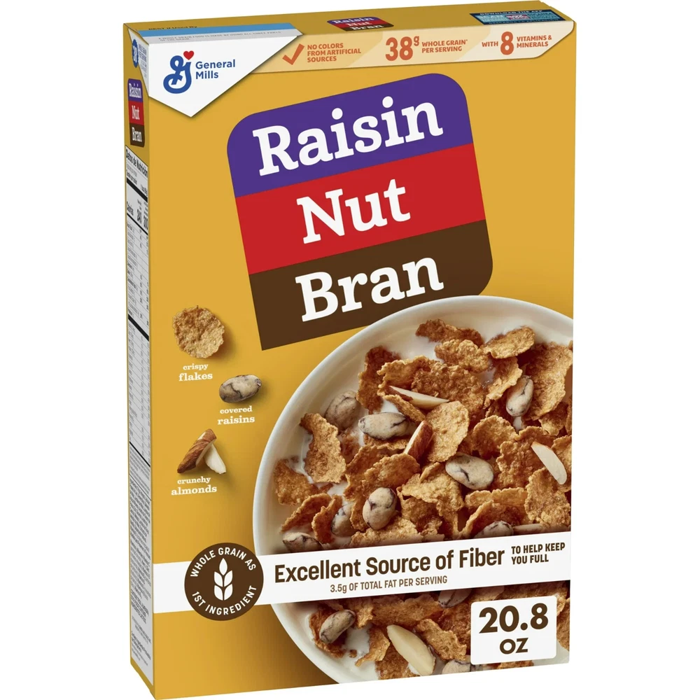 Raisin Nut Bran Cereal is raisin the bar on breakfast with a unique combination of tastes and textures that's simply a cut above the rest. Every bowlful brings crispy flakes, crunchy almonds, and sweet covered raisins for a wholesome and tasty start to any day. Raisin Nut Bran is a deliciously crafted cereal that delivers sustained energy from whole grain to take on even your busiest mornings. It's also an excellent source of fiber to help keep you full (7g fiber and 3.5g total fat per serving). Serve this mix of wheat and bran cereal flakes, raisins, and almonds with cold milk as a quick and easy breakfast that satisfies. Sprinkle this breakfast cereal with whole grains over yogurt for a crispy bite between meals. Or add some to trail mix recipes and healthy cereal bars for on the go snacks you can feel good about. Whether you reach for Raisin Nut Bran as your go-to fiber cereal, whole grain breakfast food, or ingredient in healthy snacks recipes, General Mills breakfast cereals spread goodness from tots to grown-ups. FRUIT AND NUT CEREAL: Crispy flakes, crunchy almonds, and sweet covered raisins create a unique combination of tastes and textures WHOLE GRAIN 1st: Whole grain is the first ingredient. Contains 38g whole grain per serving (at least 48g recommended daily) HIGH FIBER CEREAL: An excellent source of fiber to help keep you full (7g fiber and 3.5g total fat per serving) HEALTHY SNACK: Enjoy a bowl as a snack, or add this cereal to homemade healthy cereal bars, trail mix, or other on the go snacks CONTAINS one 20.8 oz cereal box of General Mills Raisin Nut Bran Cereal BOX TOPS FOR EDUCATION: Raisin Nut Bran is proud to support schools, teachers and students as an official participating Box Tops product Why Choose Raisin Nut Bran Cereal? Unique Flavor & Texture : Enjoy the perfect combination of crispy flakes, crunchy almonds, and sweet covered raisins in every bite. Sustained Energy : Crafted with whole grains to give you lasting energy, perfect for powering through busy mornings. High in Fiber : With 7g of fiber and only 3.5g of fat per serving, it helps keep you full and satisfied. Whole Grain First : Contains 38g of whole grains per serving (at least 48g recommended daily), providing essential nutrients. Versatile & Delicious : Ideal for breakfast, snack time, or as an ingredient in trail mix, homemade cereal bars, or yogurt. Supports Education : Every box helps support schools, teachers, and students through Box Tops for Education. Raisin Nut Bran Cereal is more than just a great breakfast option – it’s a delicious, healthy choice that keeps you full, energized, and ready to take on the day. Packed with fiber and whole grains, it’s perfect for those looking to enjoy a balanced, nutritious meal or snack. Whether you’re starting your day with a bowl, mixing it into a recipe, or snacking on it throughout the day, this cereal offers unmatched taste and convenience. Order now for Free and Fast Shipping! Enjoy the convenience of quick delivery! Get it now with Free Shipping!