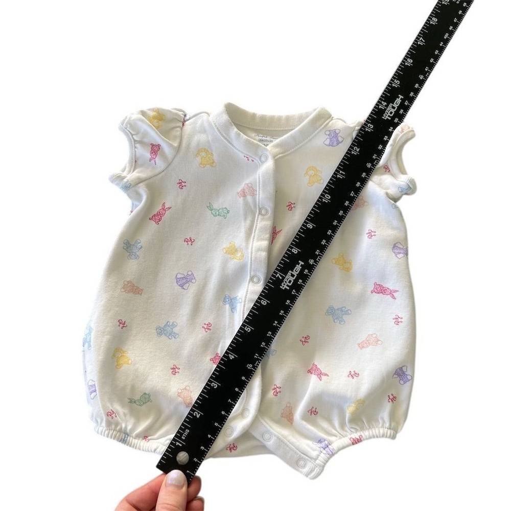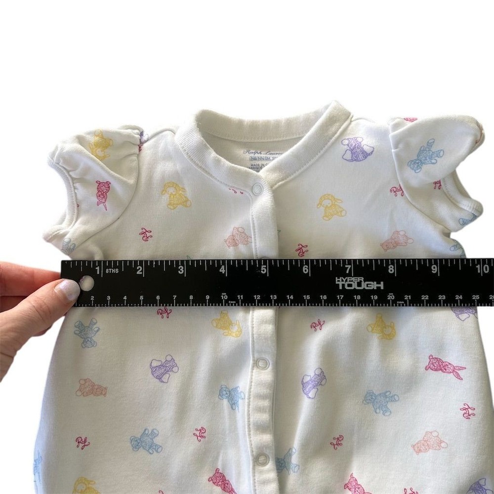 A charming Ralph Lauren baby girls bubble romper in white adorned with a playful print of teddy bears and bunnies in pastel colors. This adorable one-piece features short puffed sleeves and a snap front for easy dressing. Perfect for everyday wear or a special baby shower gift. Measurements: • Chest: 8 in • Length: 15 in Department: Unisex Baby & Toddler Style: Romper Theme: Animals Fabric Type: Knit Set Includes: Bodysuit Pattern: Animal Print Material: Cotton Number of Pieces: 1 Piece Occasion: Casual Features: Breathable Sleeve Length: Short Sleeve Accents: Button, Logo Closure: Button Type: One-Piece Season: Summer, Spring Keywords: Ralph Lauren Baby, Baby Girls Romper, Teddy Bear Print, Bunny Print, Pastel Colors, Puffed Sleeves, Bubble Romper, Infant Clothing, Baby Shower Gift, Everyday Wear, Cute Baby Clothes, Newborn Outfit, Snap Front Romper All items come from a smoke free, pet friendly home. All of items unless NWT or Dry Clean Only are washed with Tide. We try our best to disclose any flaws with items, if we miss something please reach out and let us know. We offer combined shipping on all our items. We do take measurements of our clothing listed for sale. Please compare the measurements to something you already own.