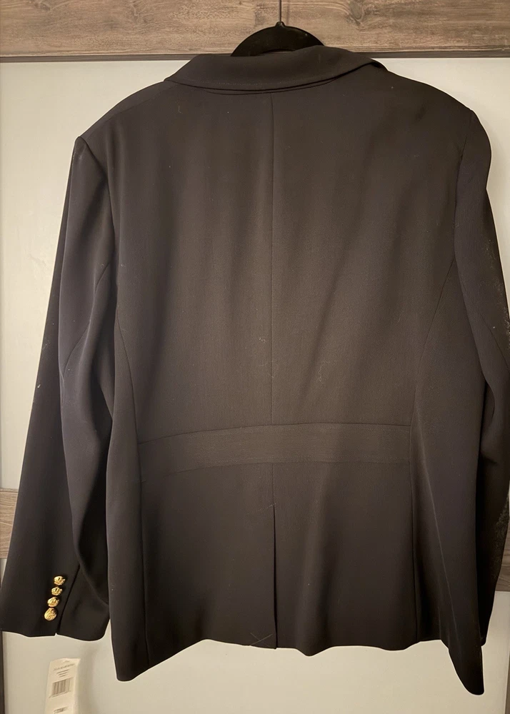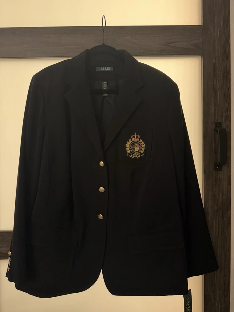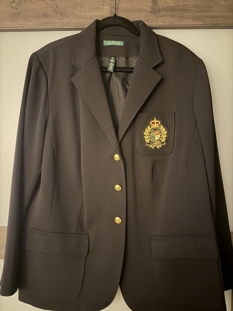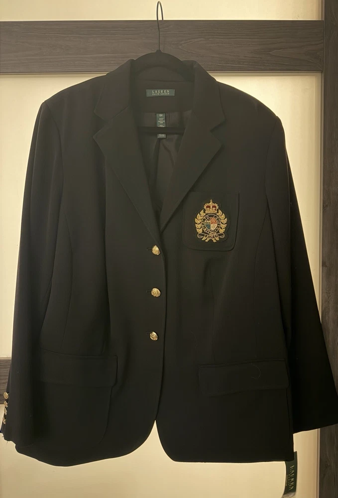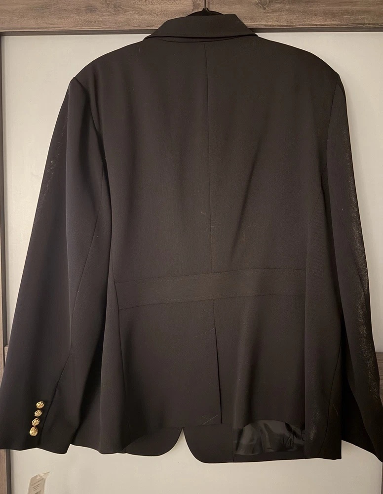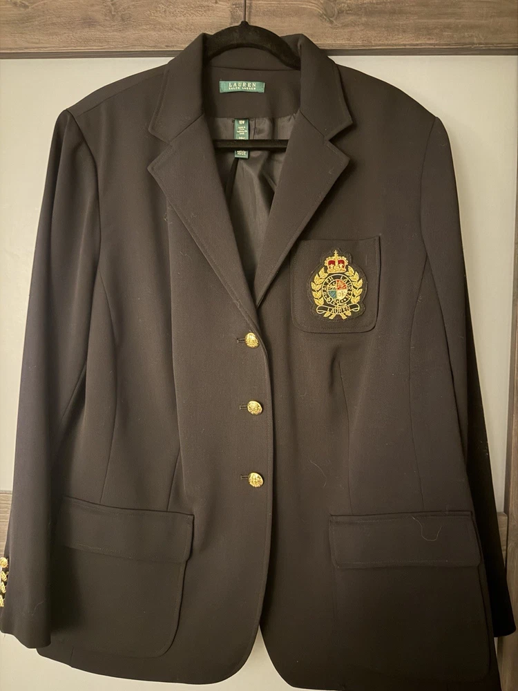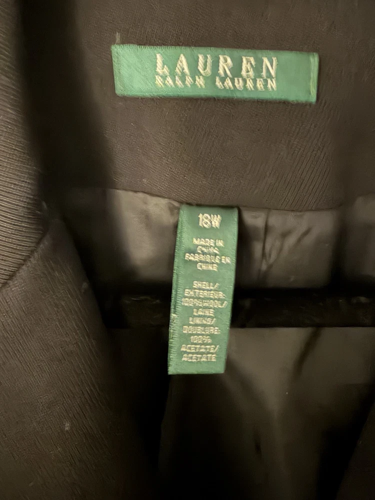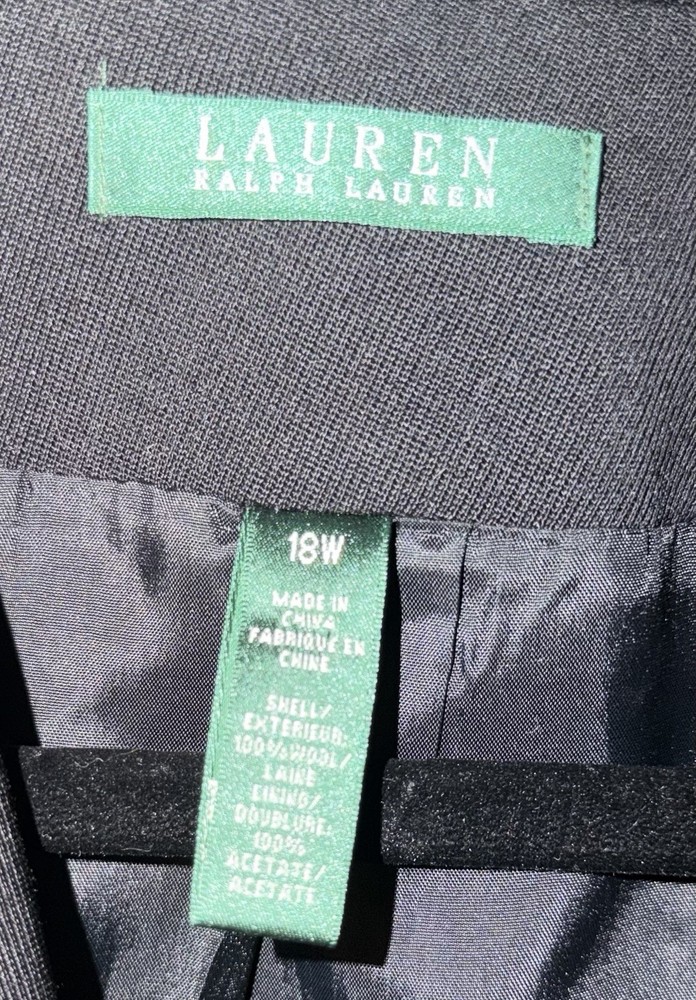 The Ralph Lauren Black Wool Crest Blazer in Women's Size 18W Plus is a classic and stylish piece perfect for a variety of occasions. Made from a fabric of wool this blazer features a four-button sleeve button style, a notch lapel, and is lined with acetate. The black color and solid pattern make it versatile for both formal and casual events, and the designer brand adds a touch of sophistication. With a regular fit and long sleeves, this blazer is a timeless addition to any wardrobe, ideal for those who appreciate preppy academia style.measurements pit to pit 23 inches , length 29 1/2 and sleeve length 25 inches from shoulder to cuff . Beautiful blazer . Perfect w t shirt and jeans and your favorite scarf !!