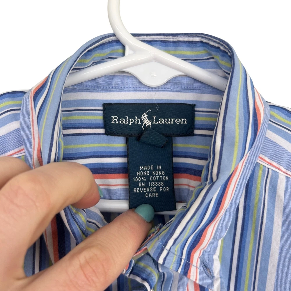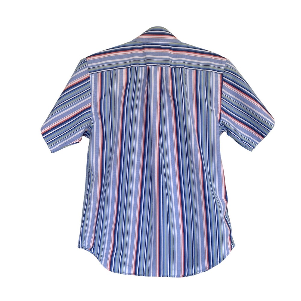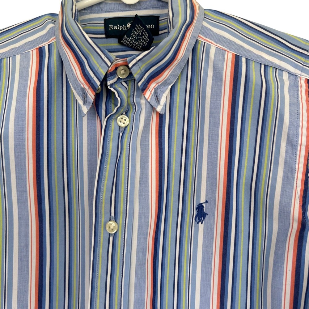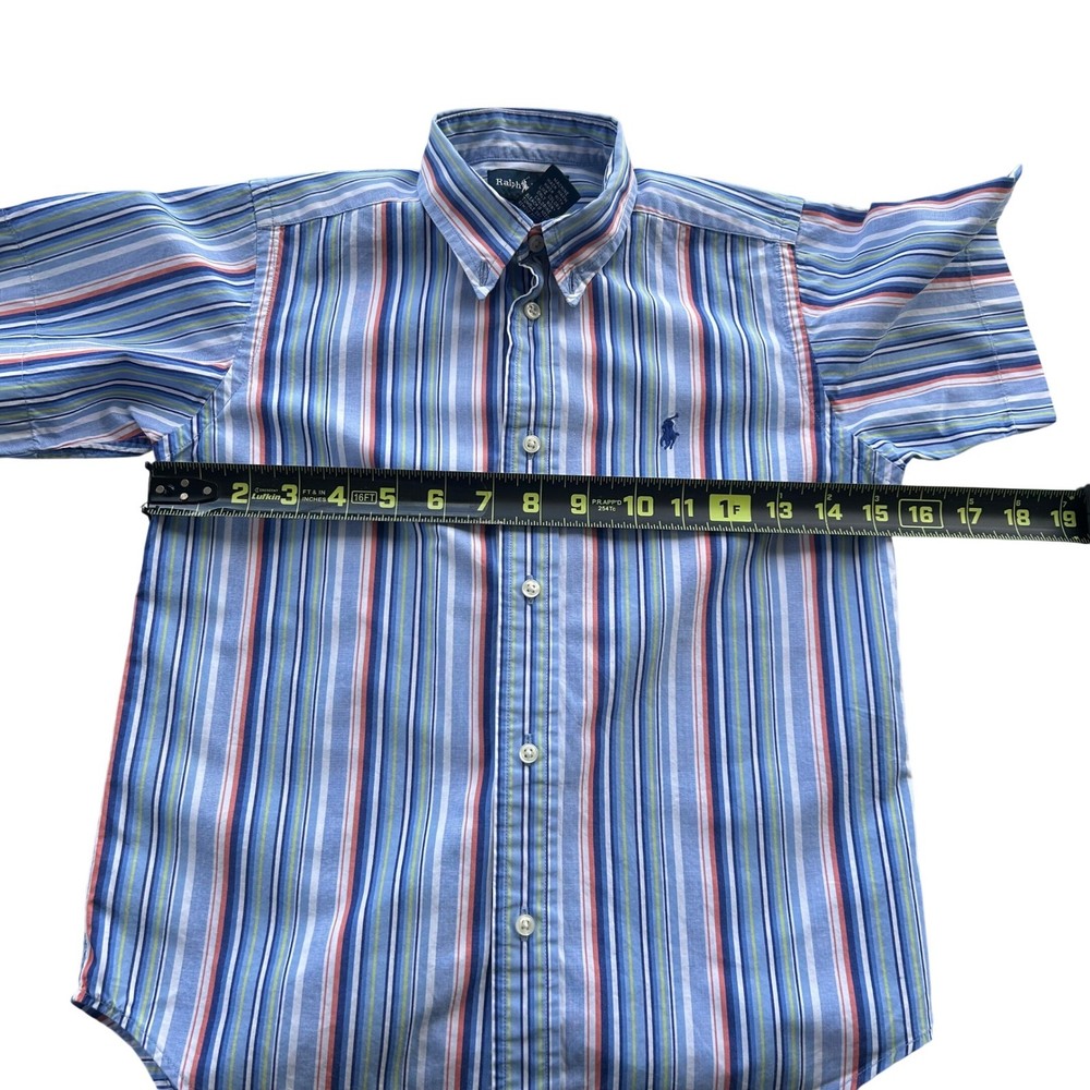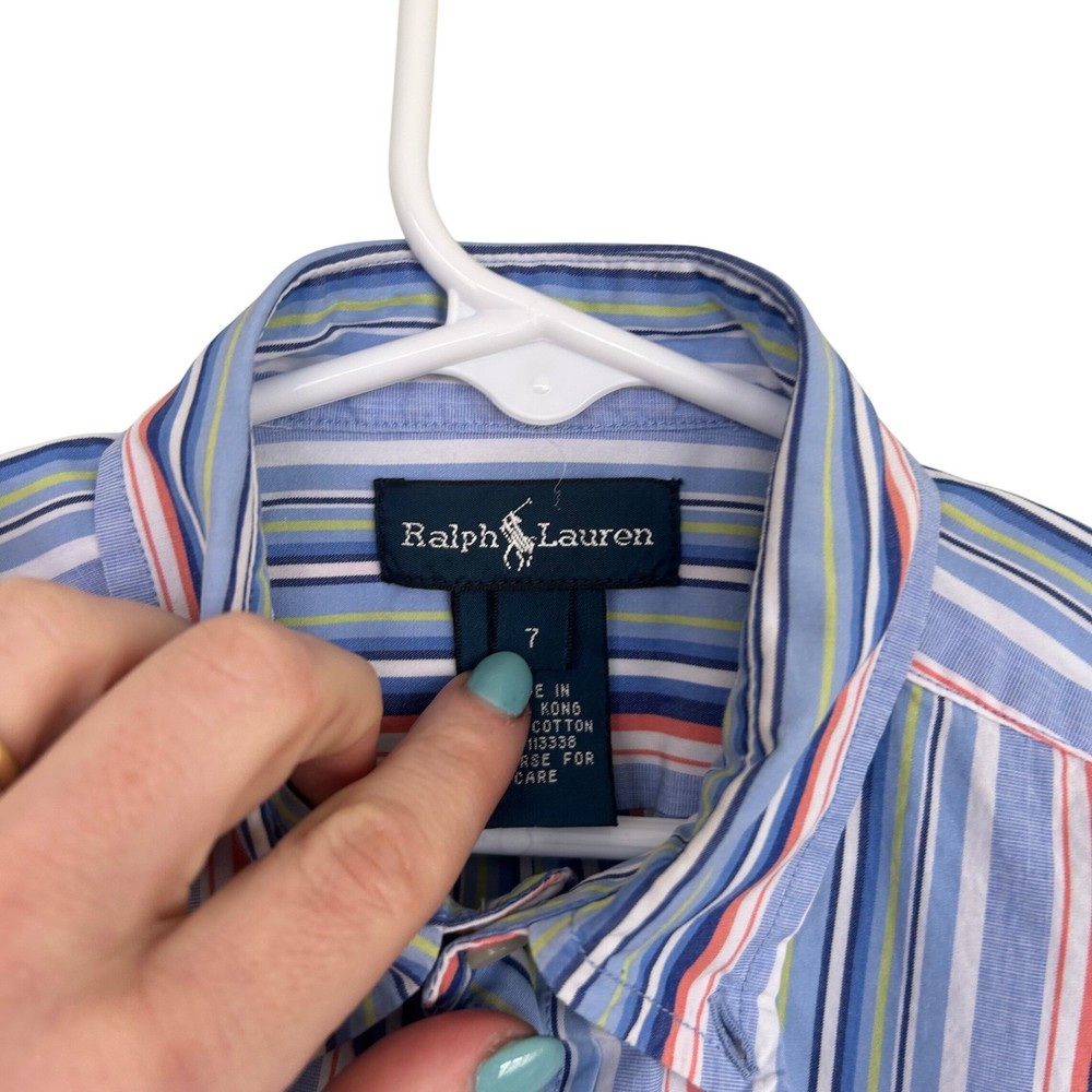 Ralph Lauren button-down shirt features a classic short-sleeve silhouette with a vibrant multi-color vertical stripe pattern in shades of blue, orange, and green. Crafted from soft 100% cotton, it includes a button-down collar and the signature embroidered pony logo on the left chest. This versatile piece is perfect for layering or wearing on its own for a polished, preppy look. The item is in good used condition. Measurements: • Pit to Pit: 15" (30" doubled) Preppy Academia Classic Coastal Summer Casual School Striped Cotton Colorful Rugby Designer Oxford ButtonDown Brand: Ralph Lauren Product Type: Button-Down Shirt Audience: Boys Size: 7 Color: Blue Multi Material: 100% Cotton Pattern: Striped Sleeve Length: Short Sleeve Neckline: Button-Down Collar Closure: Button Features: Embroidered Logo Country of Manufacture: Hong Kong All items come from a smoke free, golden retriever dog friendly home. All of items unless NWT or Dry Clean Only are washed with Tide. We try our best to disclose any flaws with items, if we miss something please reach out and let us know.