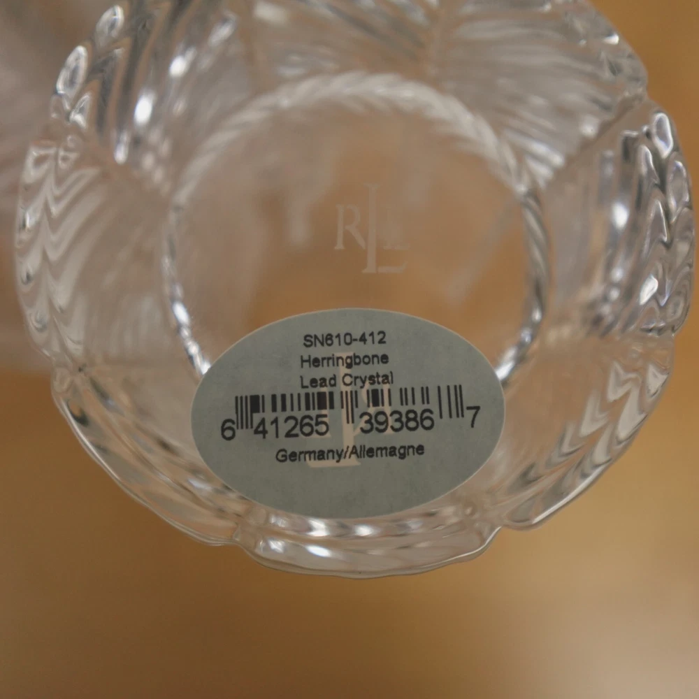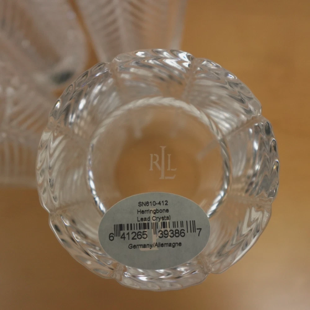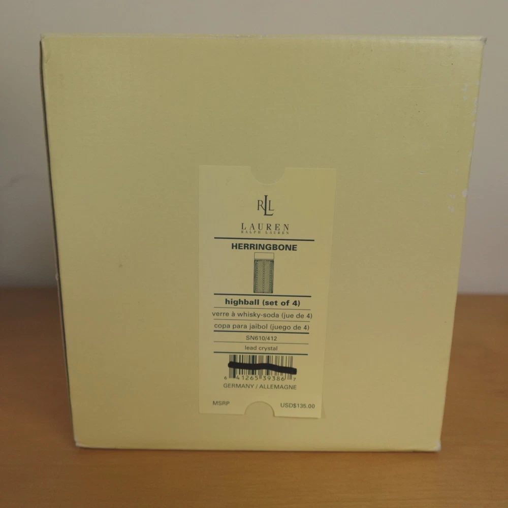 Ralph Lauren Herringbone Glasses Highball Lead Crystal Set of 4 Made in Germany New In Original Box Etched Signed. Never used, discontinued design. Glasses still feature the original sticker on the bottom as pictured. No chips, blemishes, or signs of wear noted, please review all photos. See photos for measurements. If we missed something, don't worry, we offer free returns in original condition. Just indicate, "just didn't like it," for any reason, and we'll pay for the return. Will be professionally packaged for safe delivery. I have 4 additional sets of 4 (16 glasses total), please see my other listings if interested. Thanks for visiting!