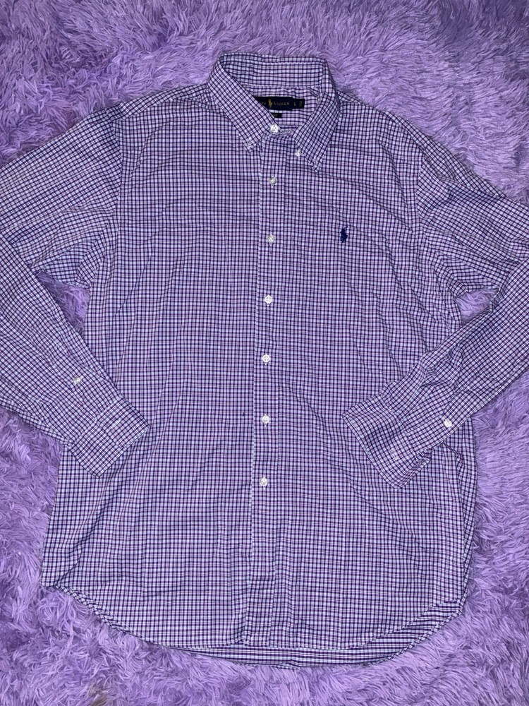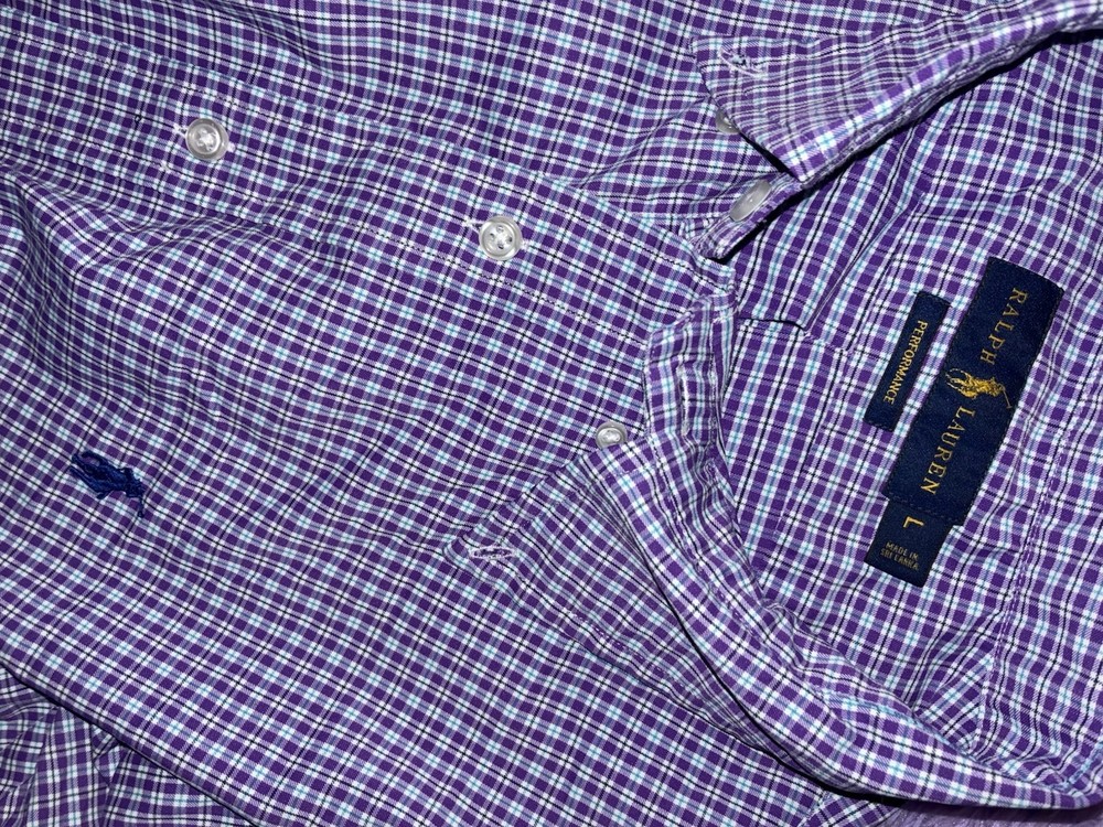 The Ralph Lauren Men's Dress Shirt in size L features a stylish purple and white check pattern with a classic collared neckline and button-down closure. Made from woven fabric, this shirt is designed for a regular fit and comes with the iconic Ralph Lauren logo accents. The long sleeves and barrel cuff style add to the sophistication of this dress shirt, making it a versatile and stylish addition to any man's wardrobe. Would be perfect for Easter! Lightweight material.
