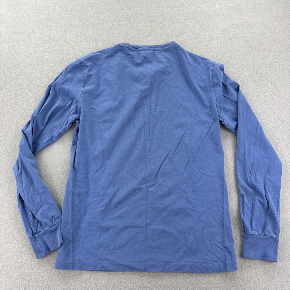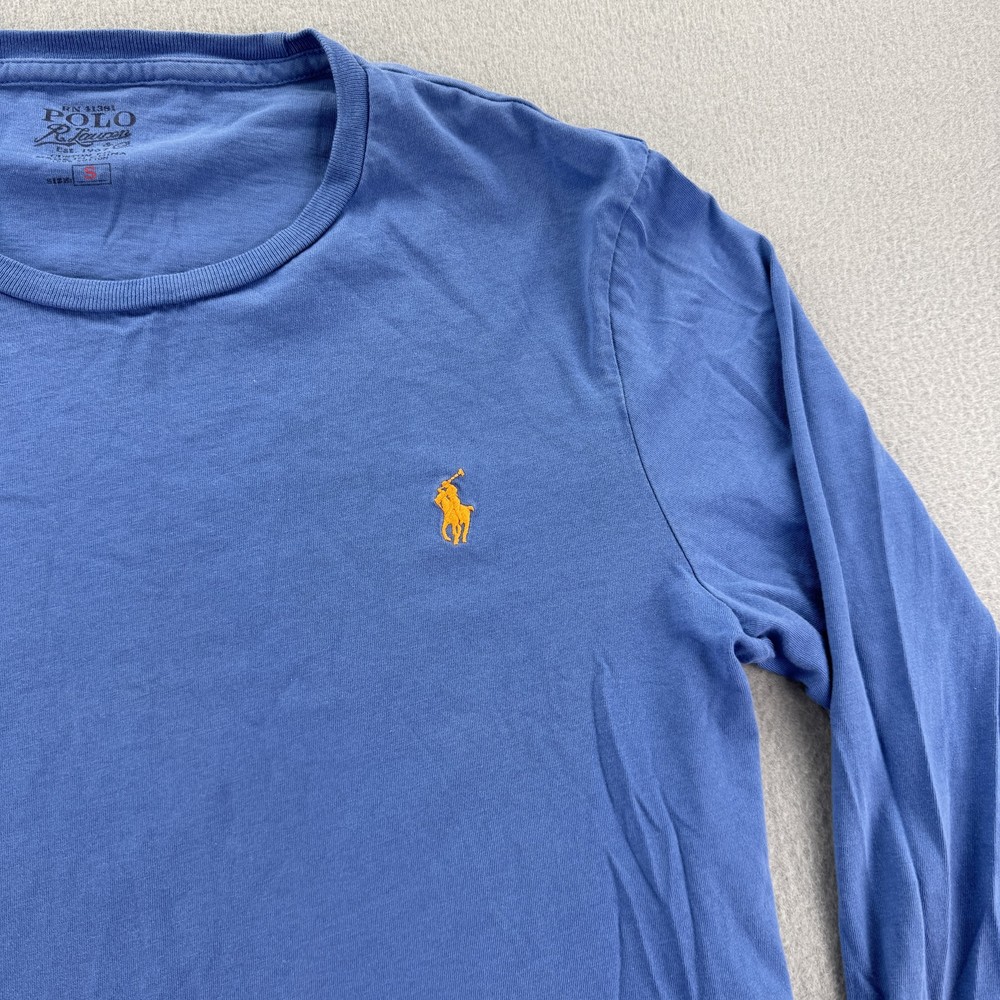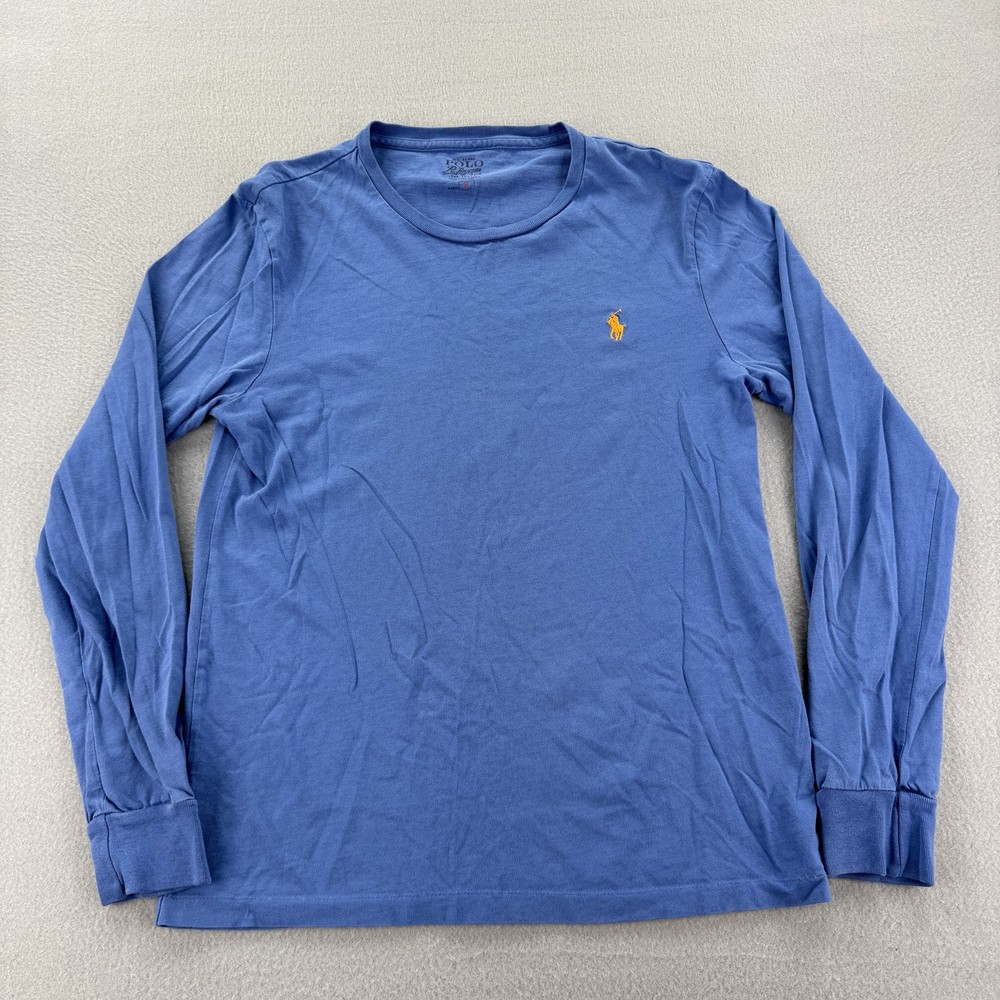 Polo Ralph Lauren Shirt Mens Small Blue Long Sleeve Crewneck Pony Logo Cotton Tee Condition: Fair used condition with visible flaws. There are two small holes on the upper back of the shirt as shown in photos. General wash wear and wrinkling present throughout. Material: 100% cotton Classic blue crewneck long sleeve featuring signature yellow Ralph Lauren pony logo embroidered on the chest Tag size: Small (Mens) Made in China Please see photos for more details, including all tags and close-ups of the flaws. Great casual everyday lightweight shirt, ideal for layering