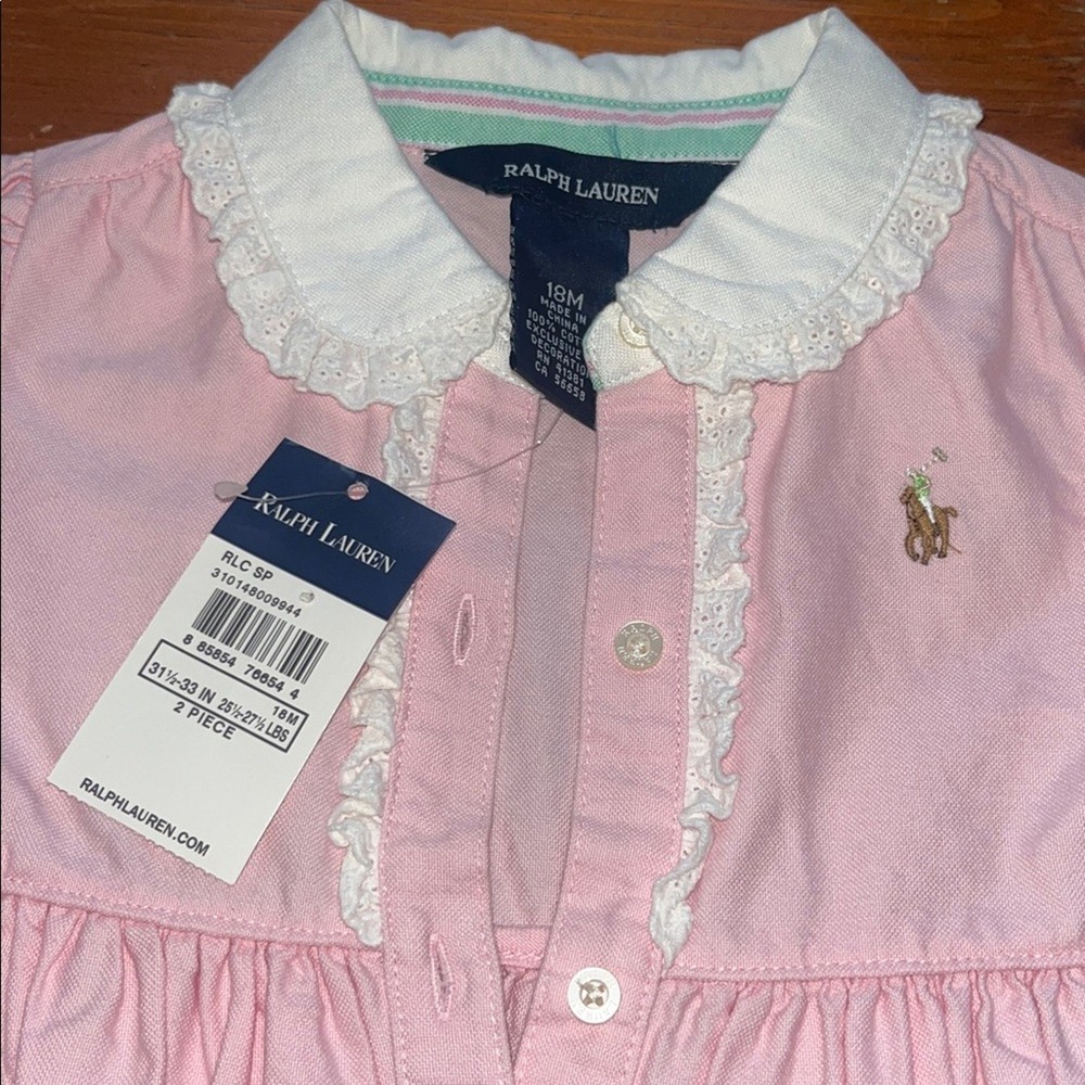Charming pink dress with delicate white lace collar. Embroidered logo detail. NWT Size 18 Months. Bundle and save!
