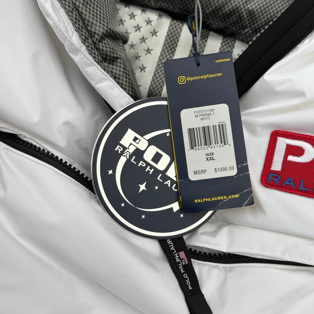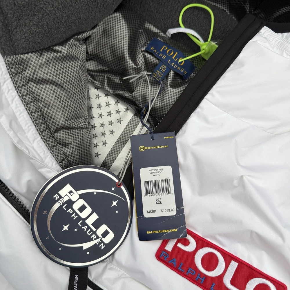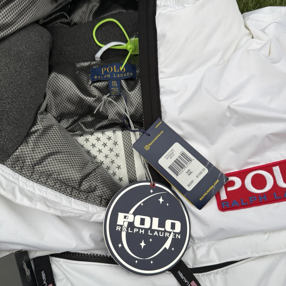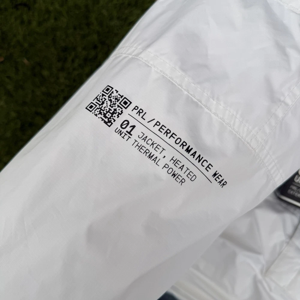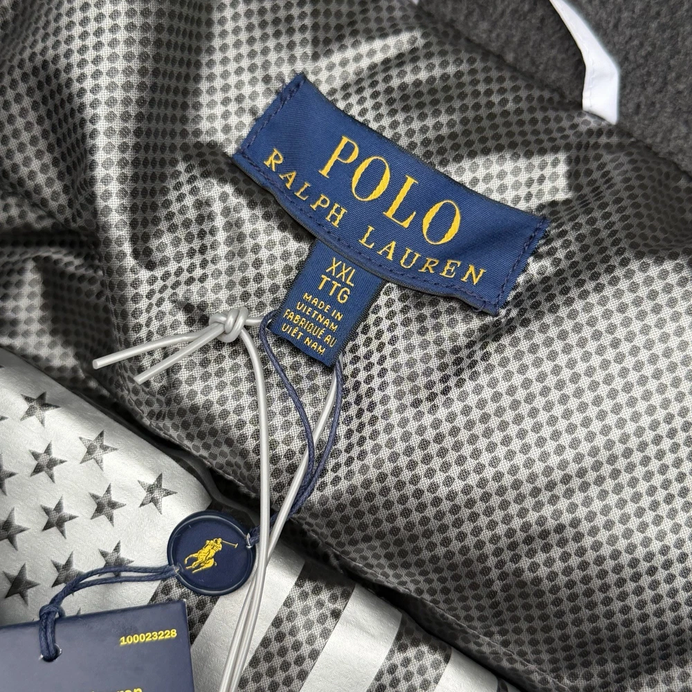 A rare, limited-edition Polo 11 RL Heat jacket, directly inspired by one of Ralph Lauren’s most iconic 1990s designs, combining classic Polo aesthetics with advanced wearable technology. This jacket features RL Heat, Polo Ralph Lauren’s proprietary onboard heating system, using ultra-light, fully flexible carbon and silver ink technology to deliver up to 11 hours of adjustable warmth. Heat levels are controlled in real time via the exclusive RL Heat app (available on iOS and Android) and powered by a Polo-branded Mophie battery, which is included. Filled with ethically sourced 750-fill-power down for natural insulation and finished with a water-repellent ripstop shell, this piece is both functional and collectible. ⸻ Condition • Pre-Owned with original tags • Includes one original Polo-branded Mophie battery pack Details & Features • Limited-edition Polo 11 RL Heat model • RL Heat app–controlled warming system • Up to 11 hours of heat • Water- and wind-repellent • Hood with fleece-lined collar • Half-zip placket with “Polo Ralph Lauren” zip pulls • Long sleeves with neoprene cuffs • American flag patch at left sleeve • “Polo Ralph Lauren” patches at left chest and right sleeve • Kangaroo pocket with zip closures (sides & top) • Neoprene hem • Zip vent along left side • American flag print at interior • Fully lined and filled ⸻ Materials • Shell: 100% polyester • Lining: 100% nylon • Fill: 90% white duck down, 10% white duck feathers • 750 fill power (high-loft, premium insulation) • Spot clean only ⸻ Size & Measurements (lying flat, approx.) • Size: XXL • Shoulder (seam to seam): 24 in • Chest (pit to pit): 31.5 in • Sleeve (shoulder seam to cuff): 27 in • Back length (collar to hem): 32.5 in ⸻ Notes • Ideal for collectors of Ralph Lauren / Polo / RL Heat pieces • Limited production, no longer available in retail • Please review all photos and measurements carefully