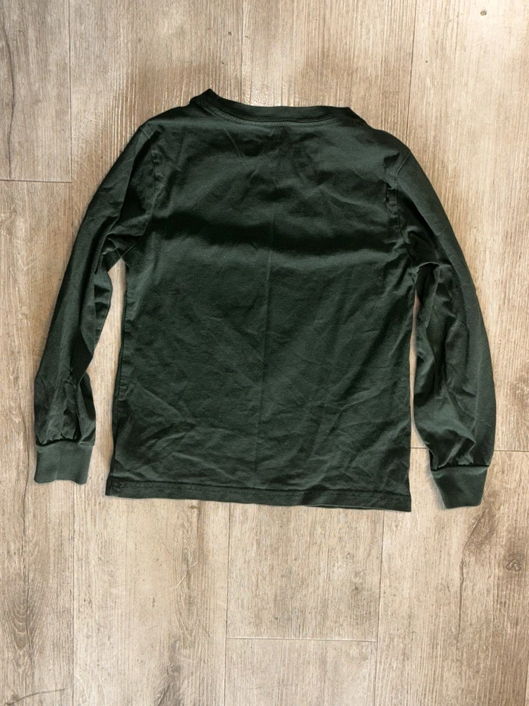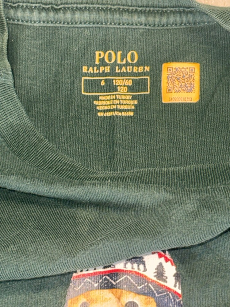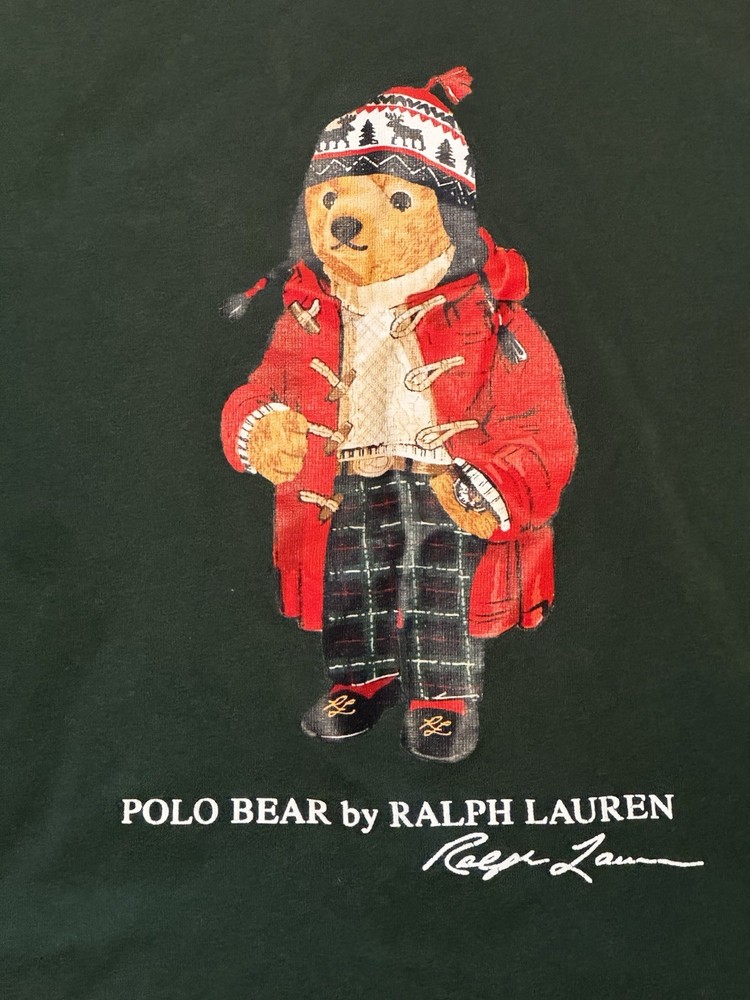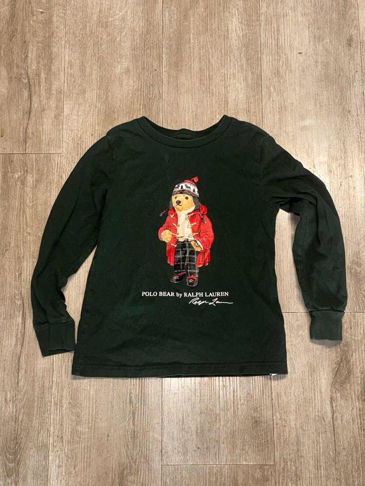 Authentic Polo Bear by Ralph Lauren long sleeve shirt featuring the iconic Polo Bear dressed in a winter/holiday outfit. Classic Ralph Lauren graphic with embroidered-style print on a deep green base. Perfect for fall/winter wear, holiday outfits, or Ralph Lauren collectors. Details: • Brand: Polo Ralph Lauren • Design: Polo Bear graphic • Color: Dark Green • Size: Kids Size 6 (per printed neck tag) • Sleeve: Long sleeve • Made in Turkey Condition: Pre-owned with light general wear. No holes, rips, or major stains noted. Print remains vibrant. Please review all photos for exact condition. Notes: Tag indicates kids sizing. Please reference photos for sizing details. Buyer pays shipping.