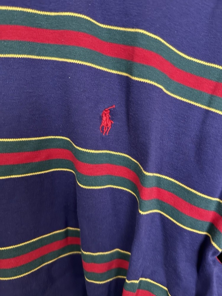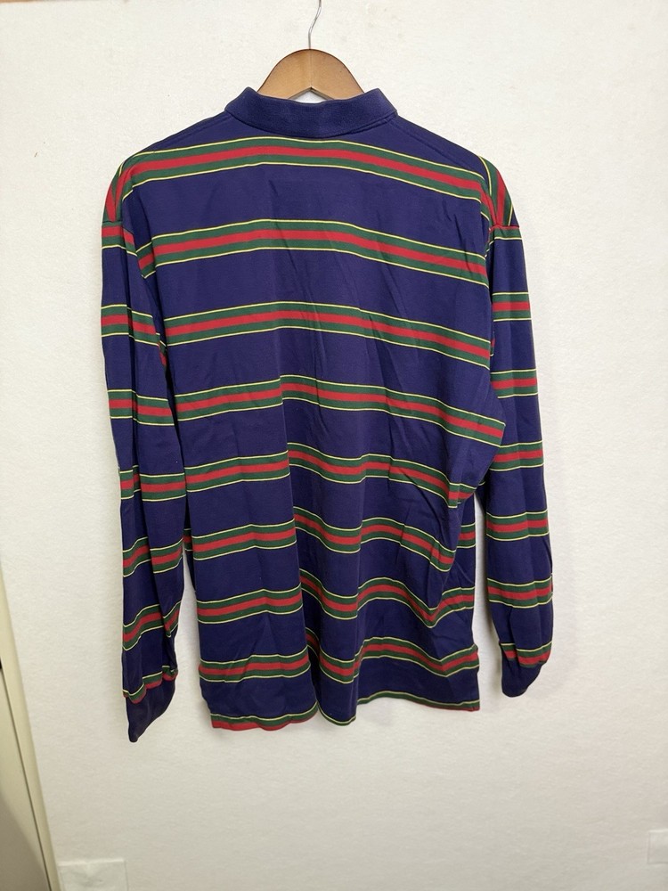 The Ralph Lauren Polo Striped Blue Red Green L/S Shirt in XXL is a vintage piece from the 1990s, made of 100% cotton knit fabric with embroidered accents. This classic shirt features a multicolor striped pattern, long sleeves, and a turtleneck neckline, making it a versatile and stylish addition to any man's wardrobe. With its regular fit and all-season appeal, this shirt is a timeless piece that can be worn in any season, whether it's winter, summer, fall, or spring. Made in the United States, this Ralph Lauren shirt is a quality and iconic choice for those looking for a vintage touch to their style.