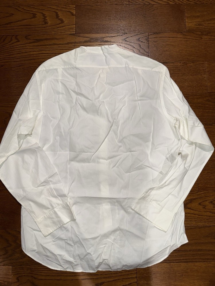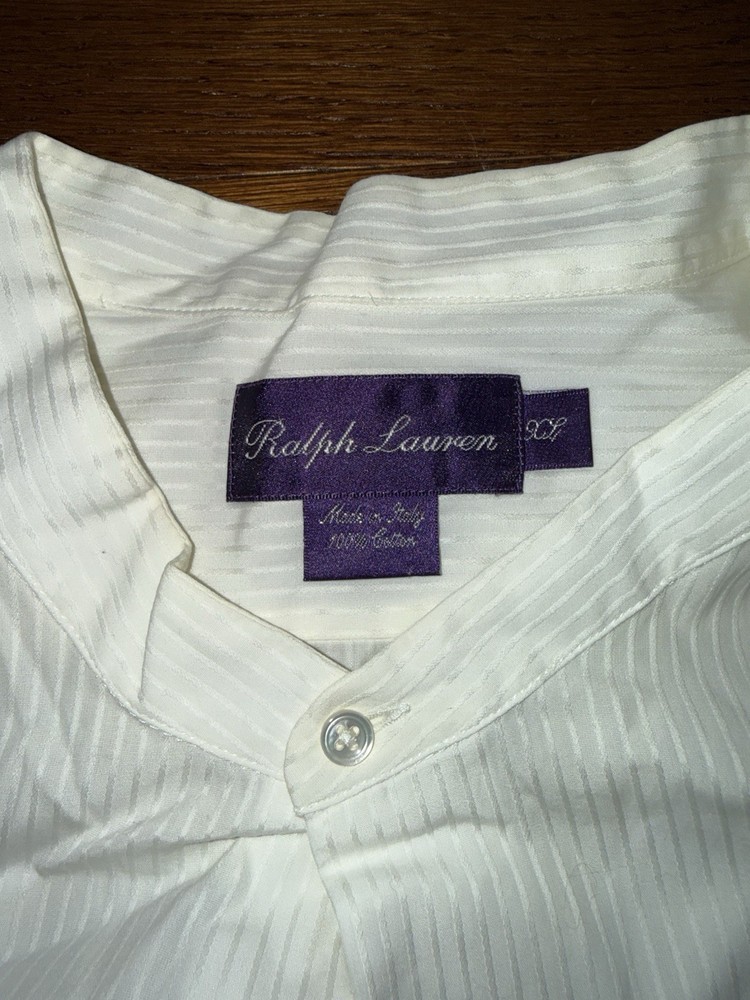 Ralph Lauren Purple Label long sleeve dress shirt. • Size: 39 (approx. Large) • Made in Italy • White with subtle tonal stripe pattern • Button front • Long sleeve • Purple Label luxury line Approximate Measurements (laid flat): • Pit to Pit: approx. 23–24” • Shoulder Width: approx. 19–20” • Sleeve Length: approx. 26–27” • Length (top of shoulder to hem): approx. 31–32” High-end Italian-made Purple Label dress shirt in a classic white tonal stripe. Timeless luxury piece suitable for formal or business wear. Please review measurements carefully to ensure proper fit.