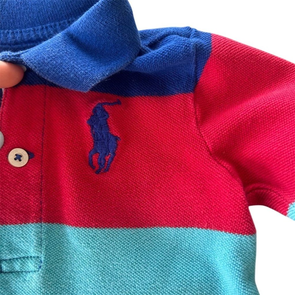 Long-sleeve polo romper features a vibrant multi-color horizontal stripe pattern in primary and pastel tones. Crafted from classic cotton mesh piqué fabric, it includes a two-button placket, ribbed polo collar, and the signature embroidered pony logo on the chest. The one-piece design is finished with ribbed cuffs and snap closures at the base for easy dressing. This item is in good pre-owned condition. Measurements: • Pit to Pit: 10" • Length: 22" • Sleeve Length: 8.5" Rainbow, Preppy, Classic, Nautical, Colorful, Dopamine Dressing, Playwear, Baby Shower Gift, Designer, Pique, Striped, Primary Colors, Long Sleeve Brand: Ralph Lauren Product Type: Romper Audience: Baby Boys Size: 9M Color: Multicolor Material: 100% Cotton Pattern: Striped Sleeve Length: Long Sleeve Neckline: Collared Closure: Snap/Button Logo: Embroidered Pony All items come from a smoke free, golden retriever dog friendly home. All of items unless NWT or Dry Clean Only are washed with Tide. We try our best to disclose any flaws with items, if we miss something please reach out and let us know.