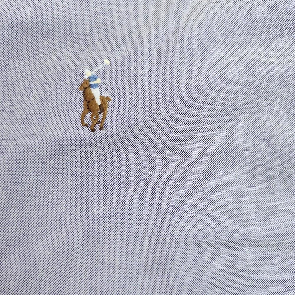 Brand: Ralph Lauren. Style: Mens long sleeve button-down collar oxford dress shirt from the Yarmouth collection. Color: Light blue woven oxford cloth with a finely textured appearance. Size: Mens 16.5 neck with 36/37 sleeve length, as indicated on the neck size tag. Material: 100% cotton oxford fabric; detailed fiber content and care instructions appear on the interior label. Country of origin: Made in Hong Kong, according to the woven neck and interior tags. Branding and labels: Navy woven neck label displaying the Ralph Lauren wordmark and polo rider logo, side tab with size and country information, and separate YARMOUTH 100% COTTON OXFORD label below the collar seam. Front design: Traditional button-front placket with a left chest embroidered polo player logo in multicolor thread. Back design: Solid blue back panel with a center box pleat beneath the yoke for ease of movement. Fit and silhouette: Classic fit oxford shirt with a button-down collar, long sleeves, and a curved shirttail hem designed to be worn tucked in. Features: Woven cotton oxford fabrication, front button closure, button-down collar points, barrel cuffs with adjustable buttons, and signature chest pony logo embroidery. Intended use: Suitable for business and office wear, dress-casual occasions, or layering under sweaters and blazers. Additional details: Shirt is photographed laid flat on a textured surface with a measuring ruler visible in some images for size reference; the final photo shows the garment folded inside a clear poly bag labeled with inventory sticker number 7371 for organizational purposes.