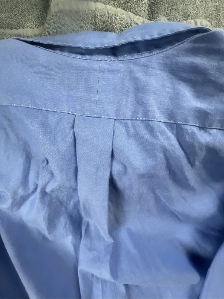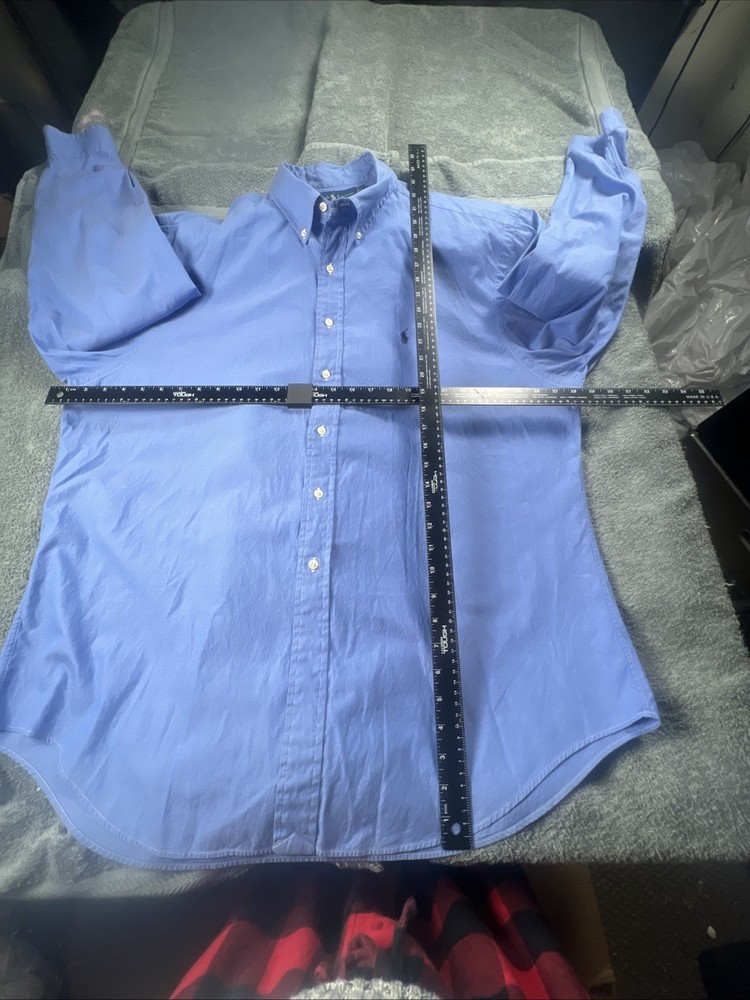 The product is a men's Ralph Lauren Yarmouth button-down dress shirt in size 17.5 and a regular fit. Made from 100% cotton with a blue striped pattern, this classic oxford shirt features a collared neckline and long sleeves with barrel cuffs. Ideal for formal occasions, this shirt exudes timeless style and quality craftsmanship synonymous with the Ralph Lauren brand.