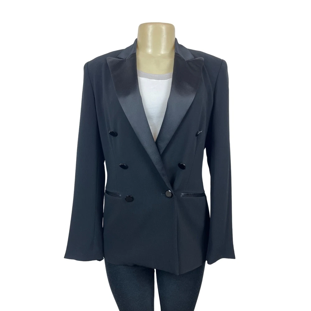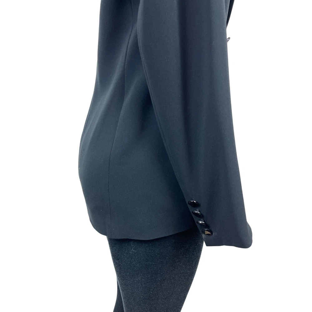 This Ralph Lauren Women's Blazer in black, size 6, showcases a double breasted design with a peak lapel. Made from polyester, it's perfect for both casual and formal occasions. It is in excellent used conditions with no holes, rips, or stains - please see pictures. You can find measurements in the last picture. • Ralph Lauren brand • Women's size 6 • Black color • Double breasted style • Peak lapel • Made from polyester Features: • Blazer Size: Womens 6 Measurements: (Taken Flat) Neck 5 in / 13 cm Shoulders 16 in / 41 cm Chest (armpit to armpit) 16 in / 41 cm Waist 16 in / 41 cm Hips 16 in / 41 cm Sleeve 24 in / 61 cm Arm 5 in / 13 cm Cuff 5 in / 13 cm Length 30 in / 76 cm Condition: Pre-Owned Good Excellent used conditions.