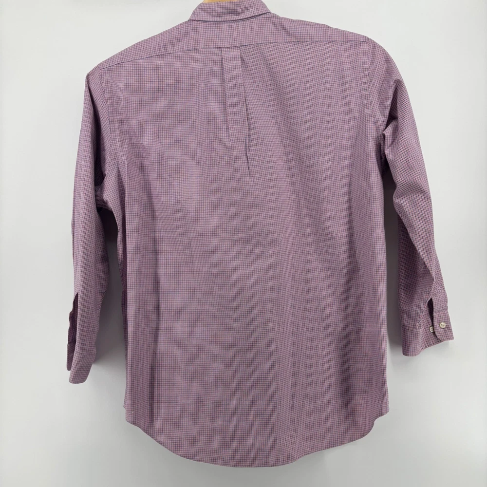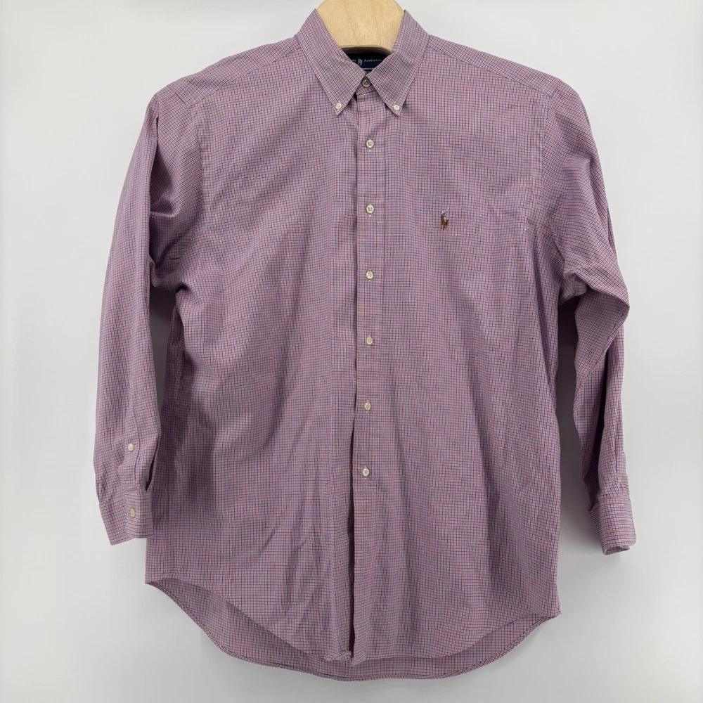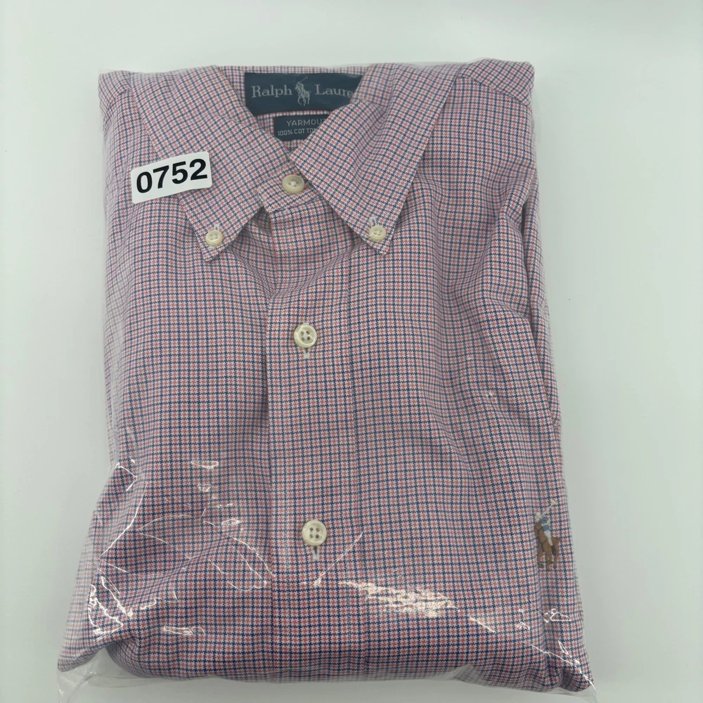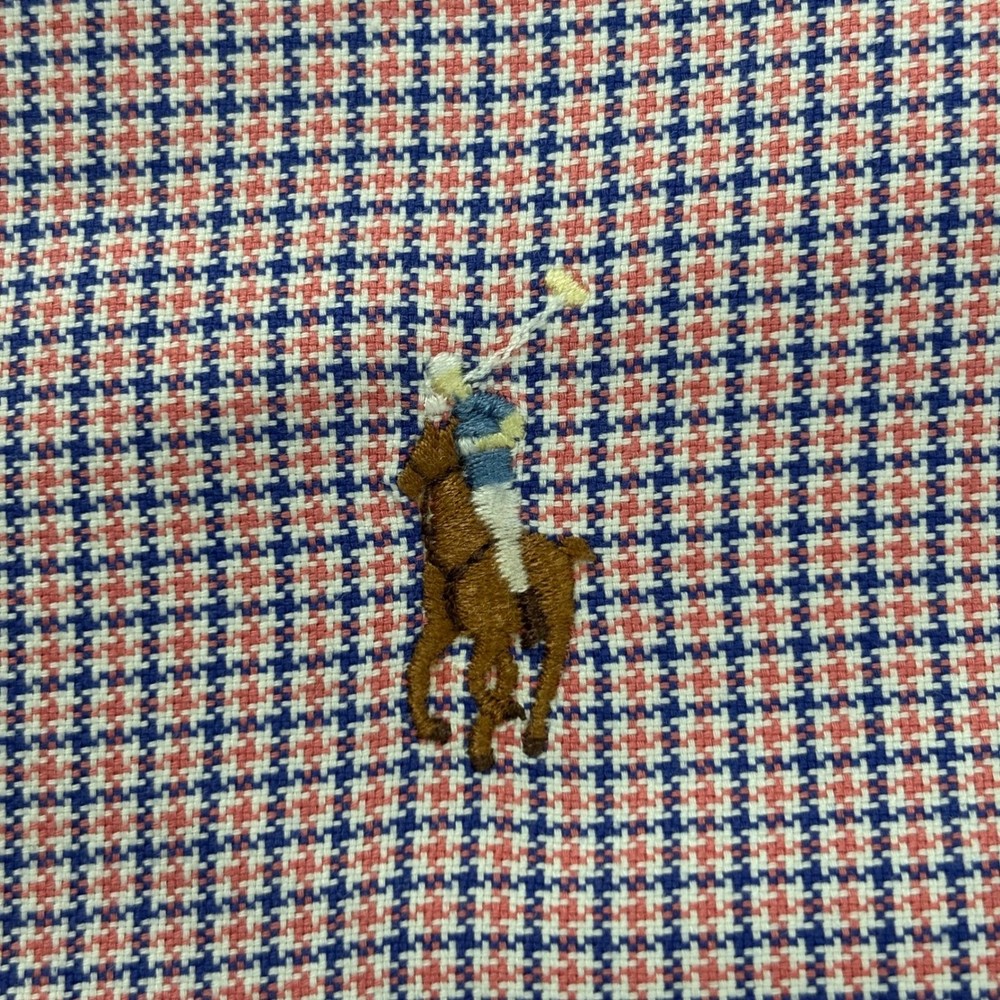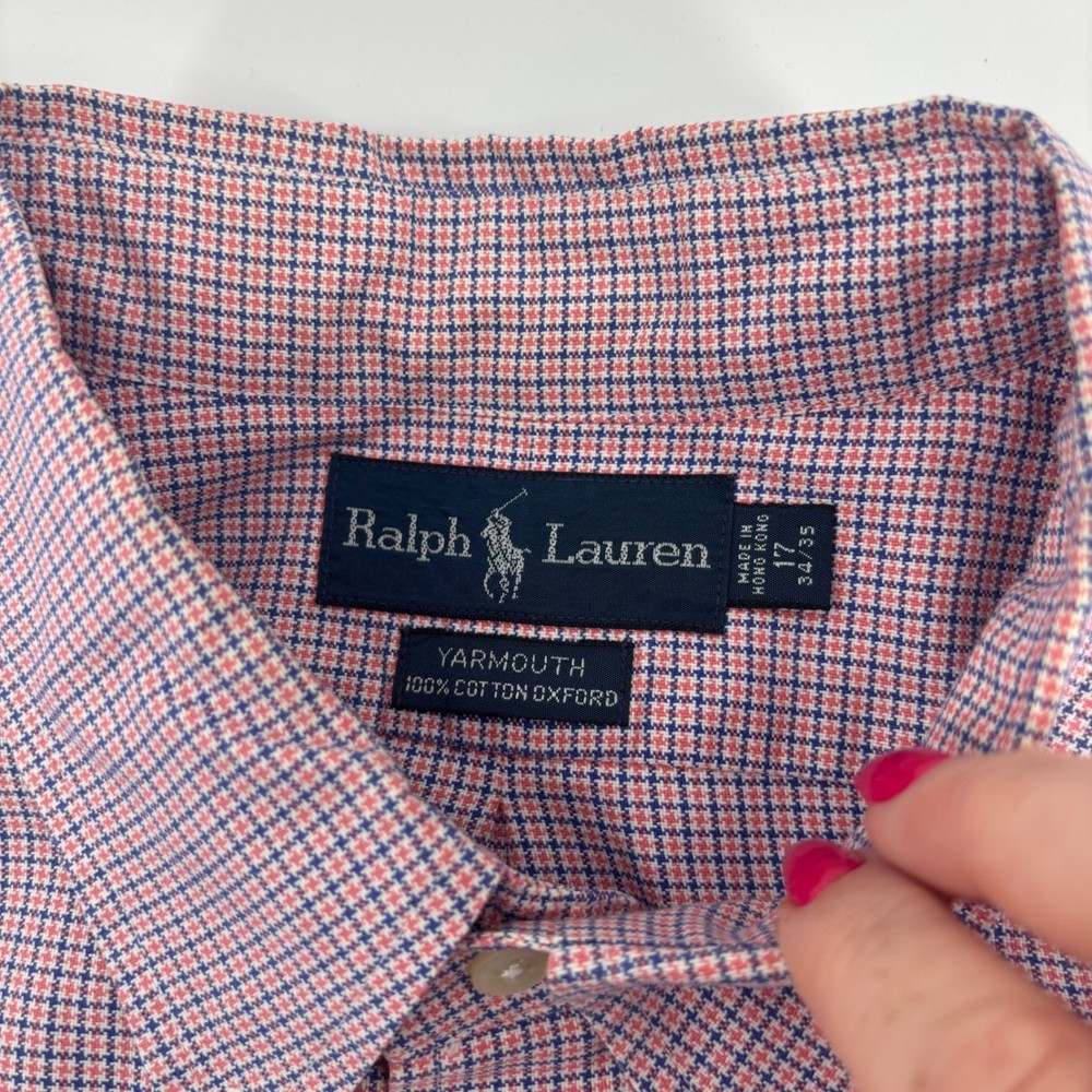Ralph Lauren Yarmouth button-down shirt features a classic 100% cotton oxford weave in a timeless red and blue micro-check pattern. This long-sleeve garment is designed with a button-down collar and a signature multi-colored pony logo embroidered on the chest for a touch of heritage style. The shirt is in excellent pre-owned condition with no visible flaws. Brand: Ralph Lauren Style: Yarmouth Material: 100% Cotton Oxford Pattern: Micro-Check / Gingham Color: Orangey Red, Blue, White Neck Size: 17 Sleeve Length: 34/35 Fit: Classic Collar: Button-Down Cuffs: Adjustable Button Logo: Multi-color Pony Care: Machine Washable Measurements: • Pit to Pit: 26" (52" doubled) • Length: 33.5" Keywords: Preppy, Ivy League, Business Casual, Traditional, Office Wear, Classic Americana, Tattersall, Cotton Oxford, Designer, Heritage, Yarmouth Fit, Large Size, Tall Fit