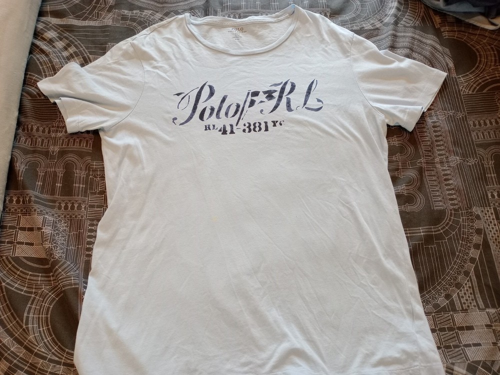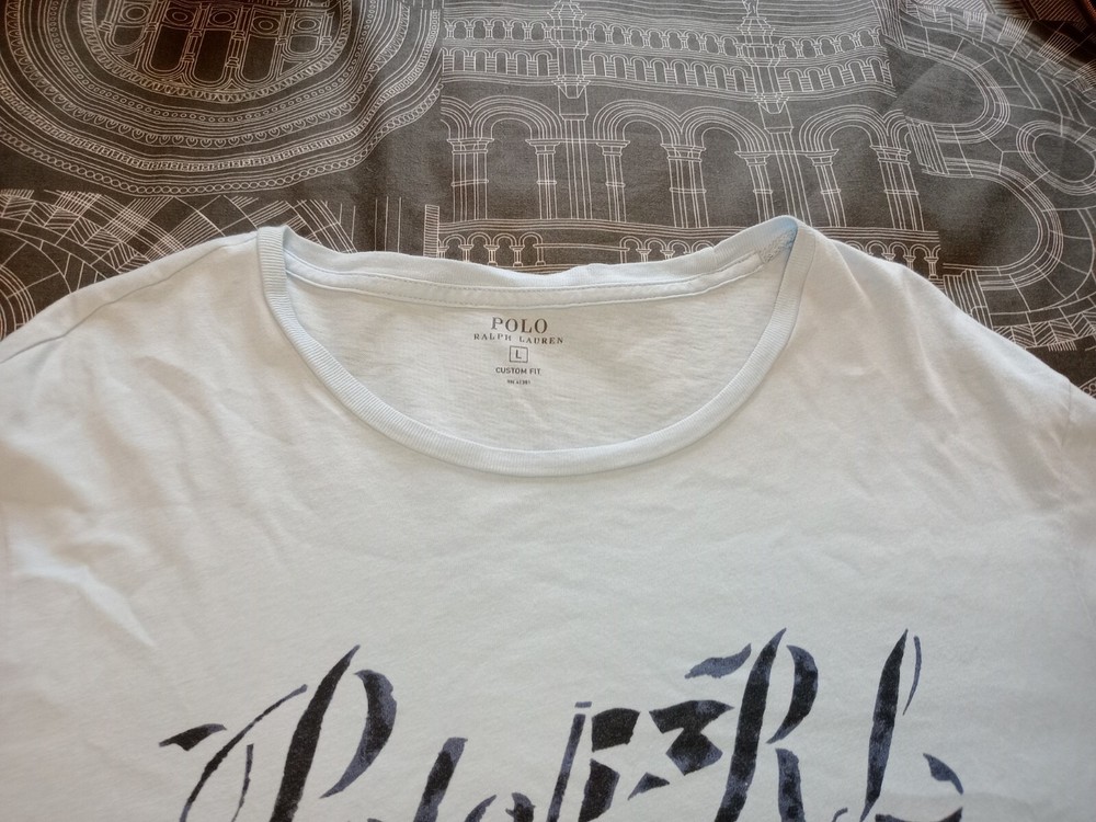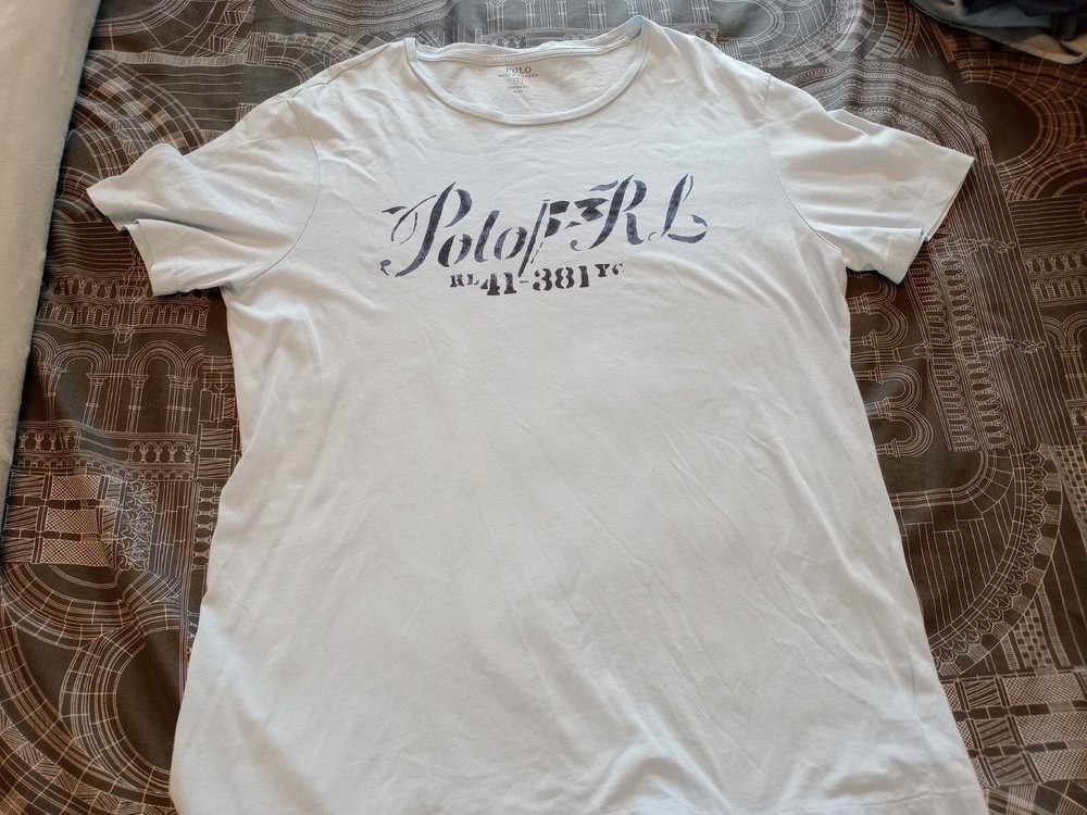 polo Ralph Lauren mens T shirt L 44 inch chest in custom fit in pale blue, polo Ralph Lauren logo on the front, crew neck, tiny fade mark on the front and one on the rear at the bottom, otherwise excellent condition