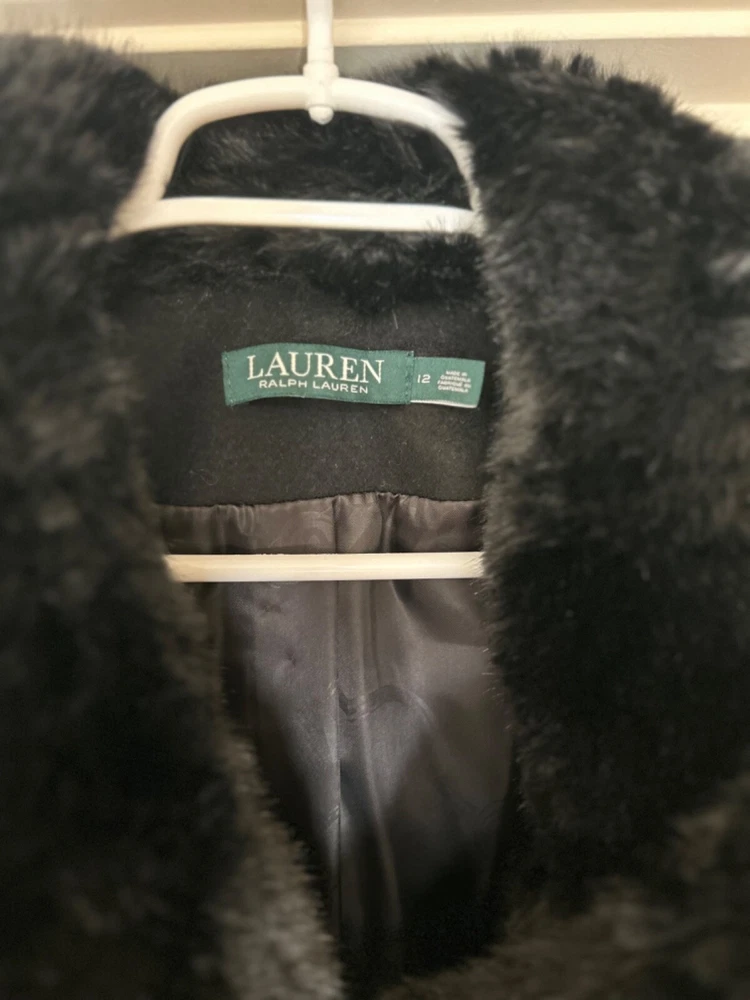 Elevate your style with this stunning full length coat from Lauren Ralph Lauren. Crafted from premium quality wool, this coat is perfect for any formal occasion. The black color and faux collar add a touch of sophistication, while the gold buttons and pockets cuff detail provide a touch of elegance. This designer coat is tailored to fit women's size 12 and is lined with a combination of nylon and polyester for added comfort. The coat's quality and style are perfect for any fashion-conscious woman looking to make a statement.