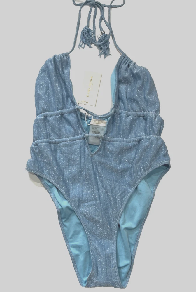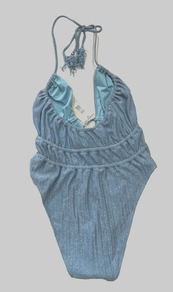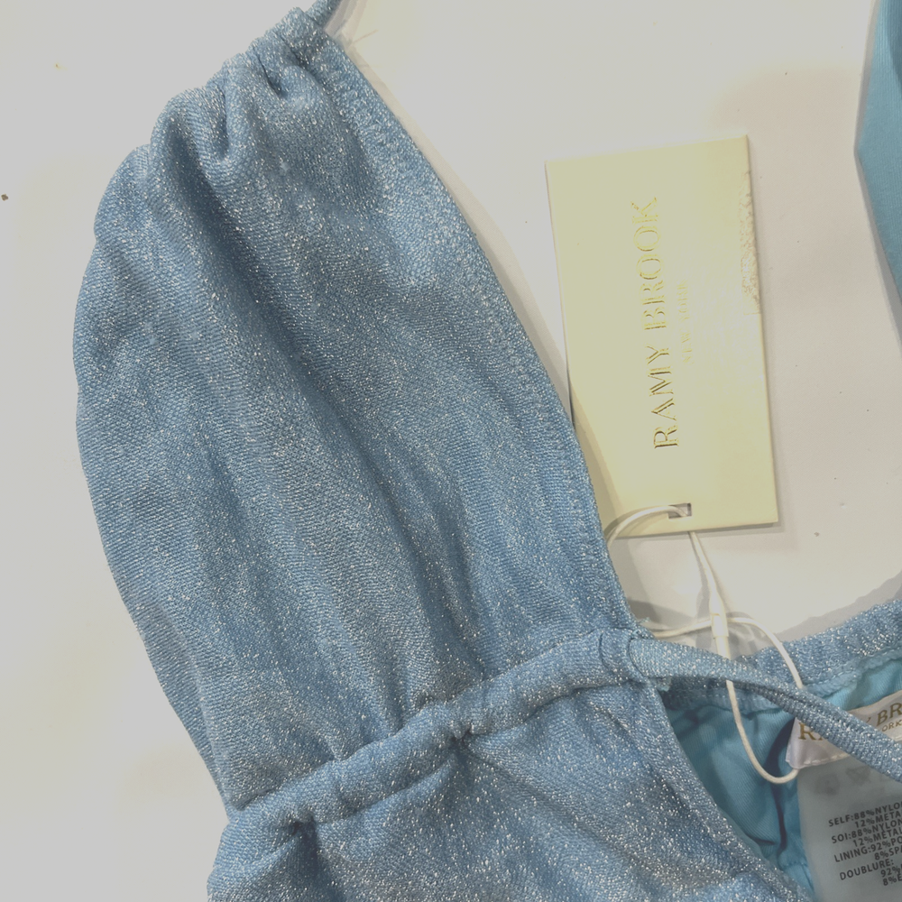 Ramy Brook women's Marta plunge front one piece Swimsuit size: Large color: Blue Elastic top hem with front ties Boned sides A hint of sparkle Shell: 88% nylon/12% metallic Lining: 92% polyester/8% spandex Hand wash retail $238 K92