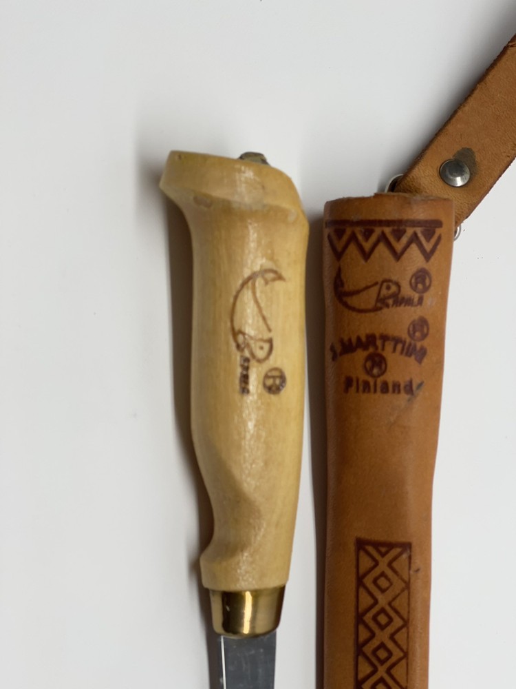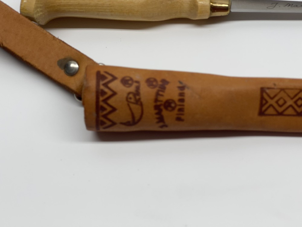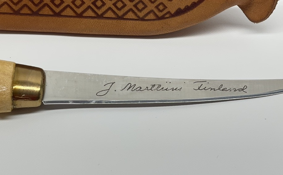 The product is a Rapala J. Marttiini fillet knife made in Finland with a stainless steel blade and a wood handle. It comes with a leather sheath for storage and has a trailing point blade edge. This fillet knife is designed for fishing use and is over 5 inches in length. It features an encapsulated tang for durability and is suitable for both left-handed and right-handed users.