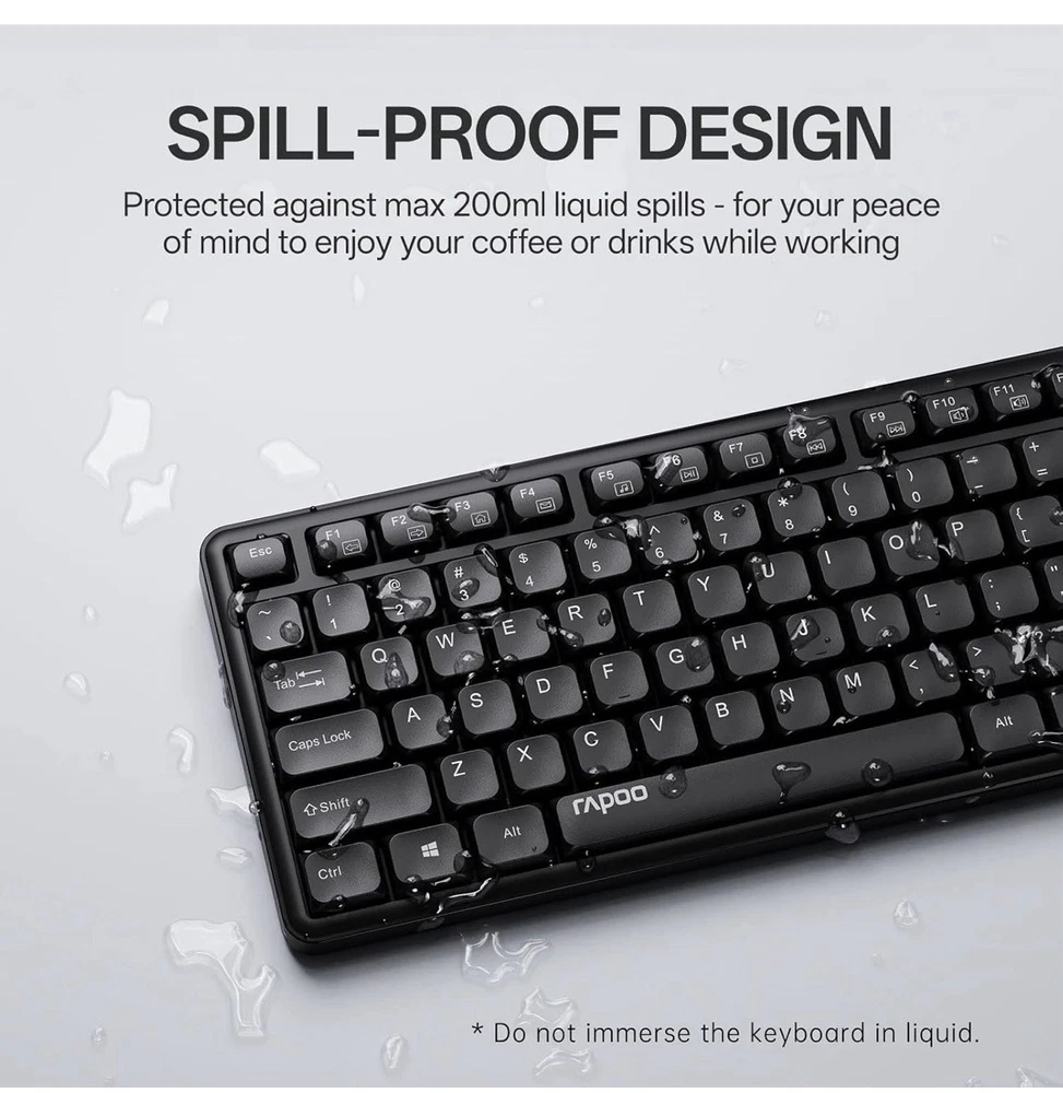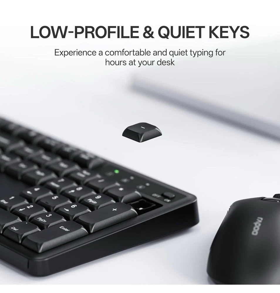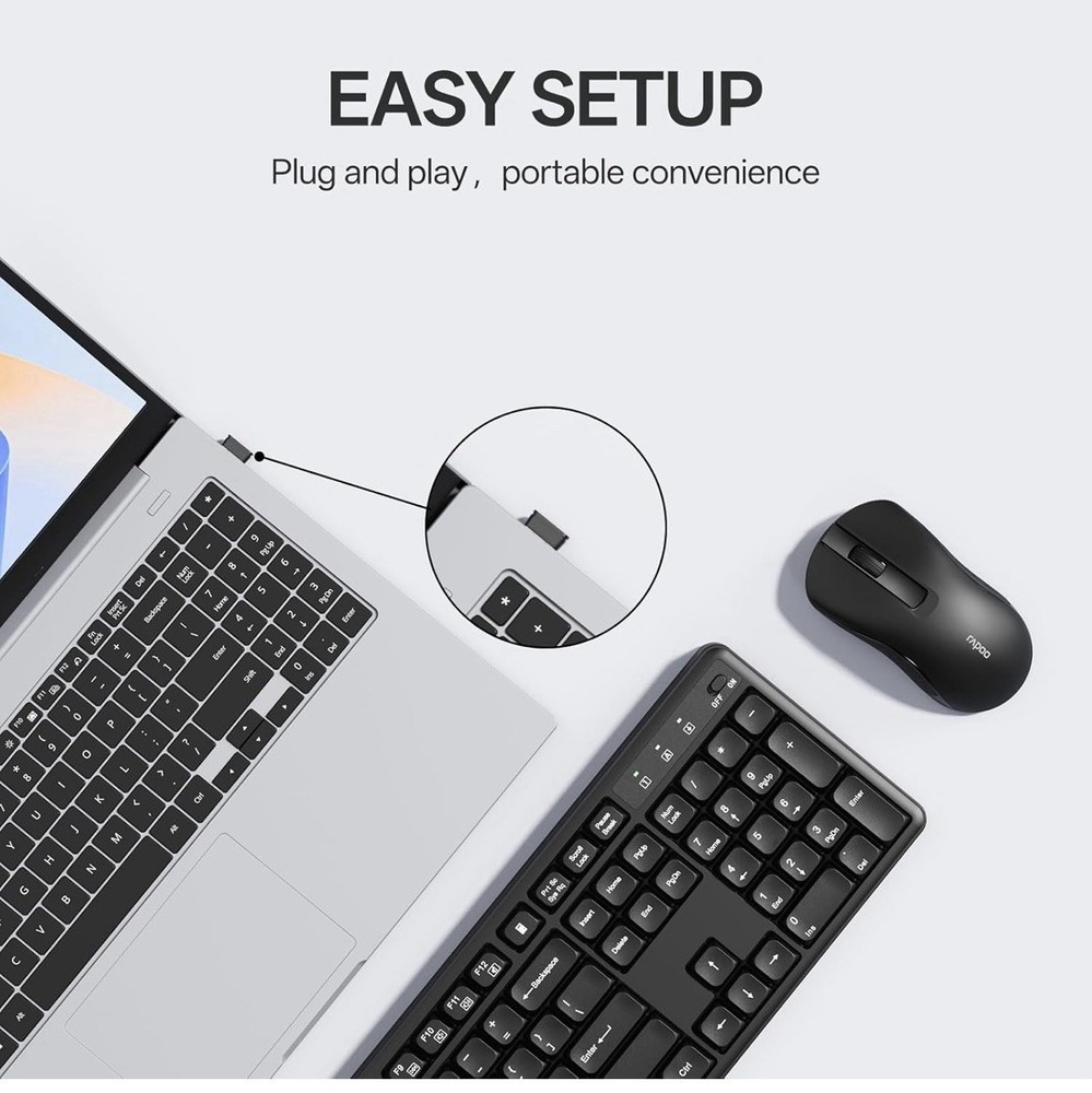 Rapoo X2100 Quiet Wireless Keyboard and Mouse Combo, 2.4GHz USB Receiver, 12 Multimedia Keys, Spill-Proof, Full-Sized, Compatible with PC, Laptop, Black Brand Rapoo Color Black Connectivity Technology Usb Special Feature Classic, Comfortable, Portable, Silent, Waterproof Compatible Devices Laptop, Personal Computer Keyboard Description Multimedia 【Plug and Play】Featuring a reliable 2.4GHz wireless connection up to 33ft, this keyboard and mouse combo provides you a lag-free wireless convenience, comfortable typing experience, and smooth cursor control. 【Quiet Keyboard and Mouse】Reduces 90% of the distractive noise to improve your productivity. The low-profile, concave keys make your fingers immediately feel at home. The ambidextrous, compact mouse allows an easy navigation for both left- and right-handed users. 【Spill-Proof Design】Enjoy your cup of tea while browsing news or emails, the X2100 is well protected against a maximum of 200ml liquid spillage. *Tested under limited conditions, please do not immerse the keyboard in liquid. 【12 Multimedia & Extra Calculator Keys】Convenient and essential hot keys give you instant access to browser (forward, back, homepage), email, and media control (play, pause, skip, volume +/-, mute, etc). What’s more, we also add an extra calculator key to streamline your workflow to next level - waking up the calculator function with one-button click. *Please be noted the browser, email, and media control hotkeys are fully compatible with Windows only. 【Long Battery Life】You can go up to 12 months for the keyboard and mouse without the hassle of changing batteries - like other typical Rapoo products, this quiet wireless keyboard and mouse combo also adapts the latest low-power technology.