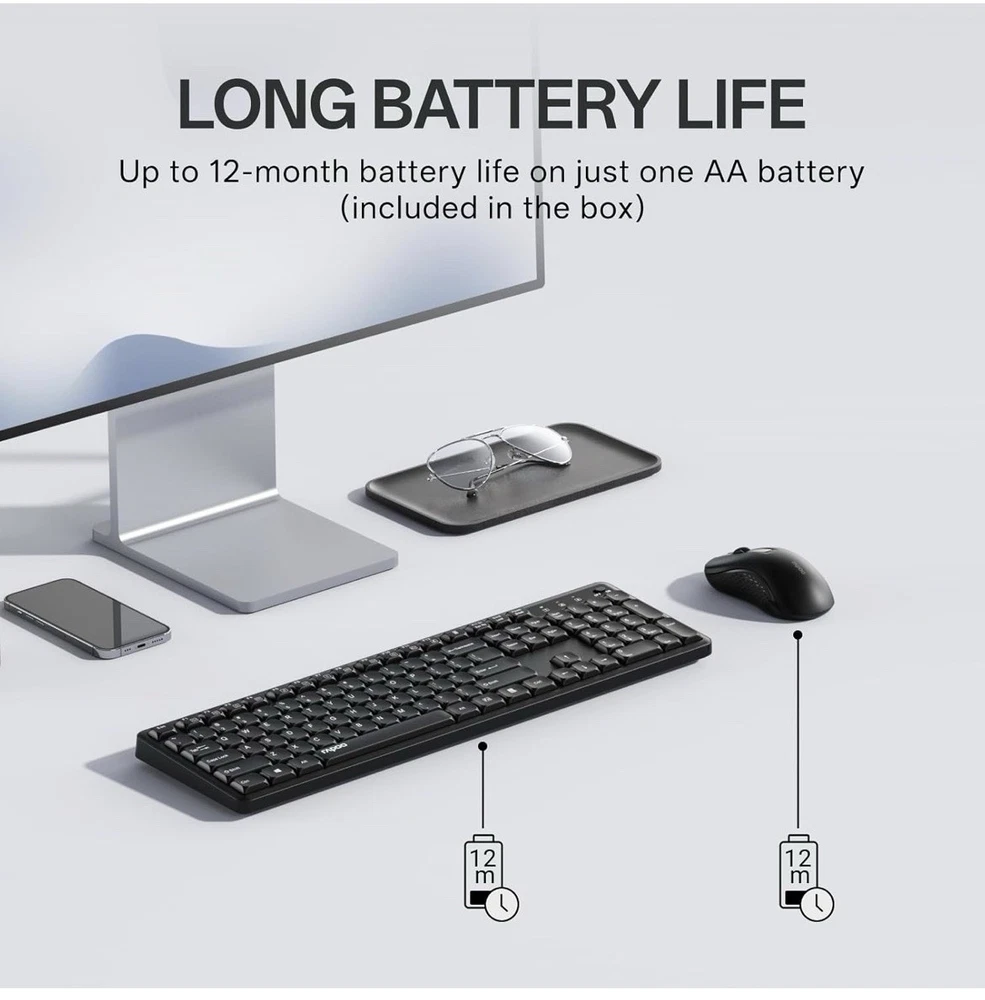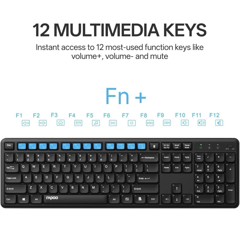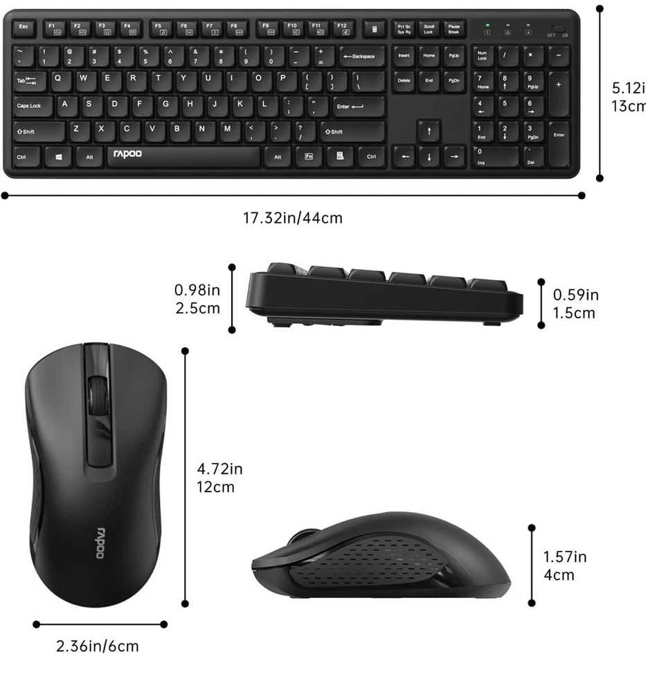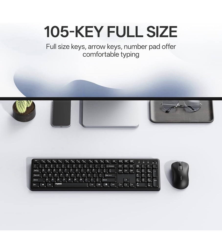Rapoo X2100 Quiet Wireless Keyboard and Mouse Combo, 2.4GHz USB Receiver, 12 Multimedia Keys, Spill-Proof, Full-Sized, Compatible with PC, Laptop, Black Brand Rapoo Color Black Connectivity Technology Usb Special Feature Classic, Comfortable, Portable, Silent, Waterproof Compatible Devices Laptop, Personal Computer Keyboard Description Multimedia 【Plug and Play】Featuring a reliable 2.4GHz wireless connection up to 33ft, this keyboard and mouse combo provides you a lag-free wireless convenience, comfortable typing experience, and smooth cursor control. 【Quiet Keyboard and Mouse】Reduces 90% of the distractive noise to improve your productivity. The low-profile, concave keys make your fingers immediately feel at home. The ambidextrous, compact mouse allows an easy navigation for both left- and right-handed users. 【Spill-Proof Design】Enjoy your cup of tea while browsing news or emails, the X2100 is well protected against a maximum of 200ml liquid spillage. *Tested under limited conditions, please do not immerse the keyboard in liquid. 【12 Multimedia & Extra Calculator Keys】Convenient and essential hot keys give you instant access to browser (forward, back, homepage), email, and media control (play, pause, skip, volume +/-, mute, etc). What’s more, we also add an extra calculator key to streamline your workflow to next level - waking up the calculator function with one-button click. *Please be noted the browser, email, and media control hotkeys are fully compatible with Windows only. 【Long Battery Life】You can go up to 12 months for the keyboard and mouse without the hassle of changing batteries - like other typical Rapoo products, this quiet wireless keyboard and mouse combo also adapts the latest low-power technology.