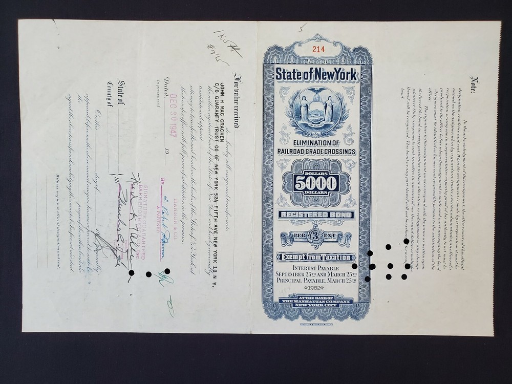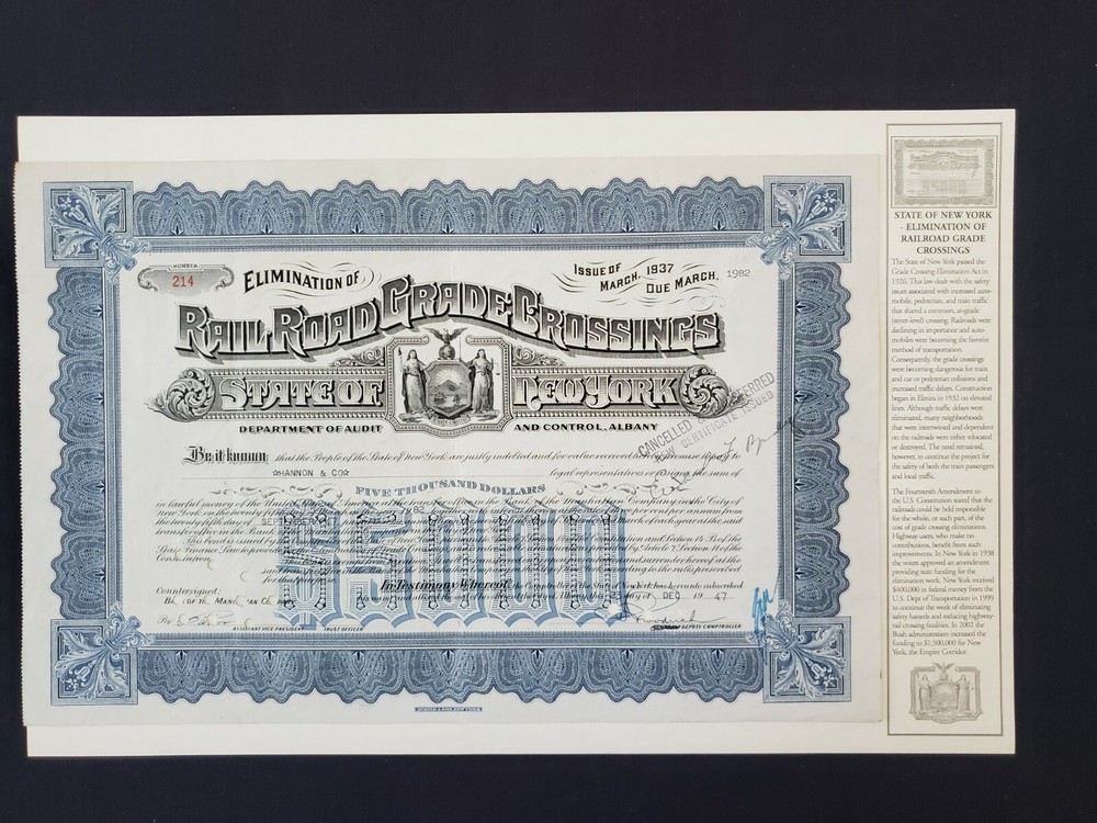 Rare 1947 NY Railroad Grade Crossings $5000 Stock Certificate USA