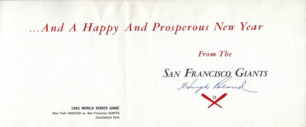 Featured here is a rare 1962 San Francisco Giants Christmas Card, picturing Candlestick Park during the 1962 World Series on the front. The inside is signed by Minor League Manager and Scout Hugh Poland. Poland, who played five major league seasons with four different teams (1943-48), became a minor league manager for the New York Giants (1949-54) before becoming a scout for the team until his death in 1984. Please read condition description, and then ask any other questions you may have. COMBINED SHIPPING ON ALL STORE ITEMS!!!
