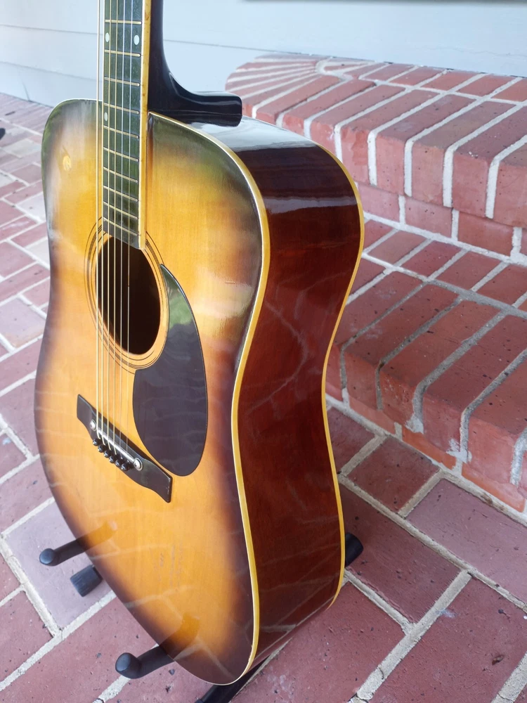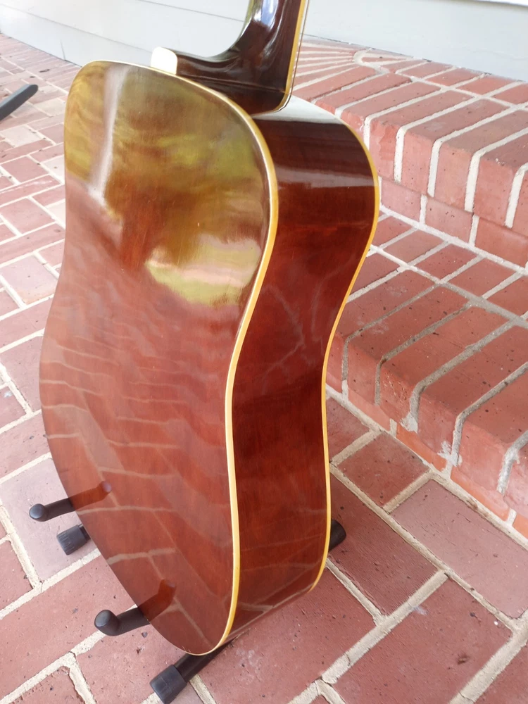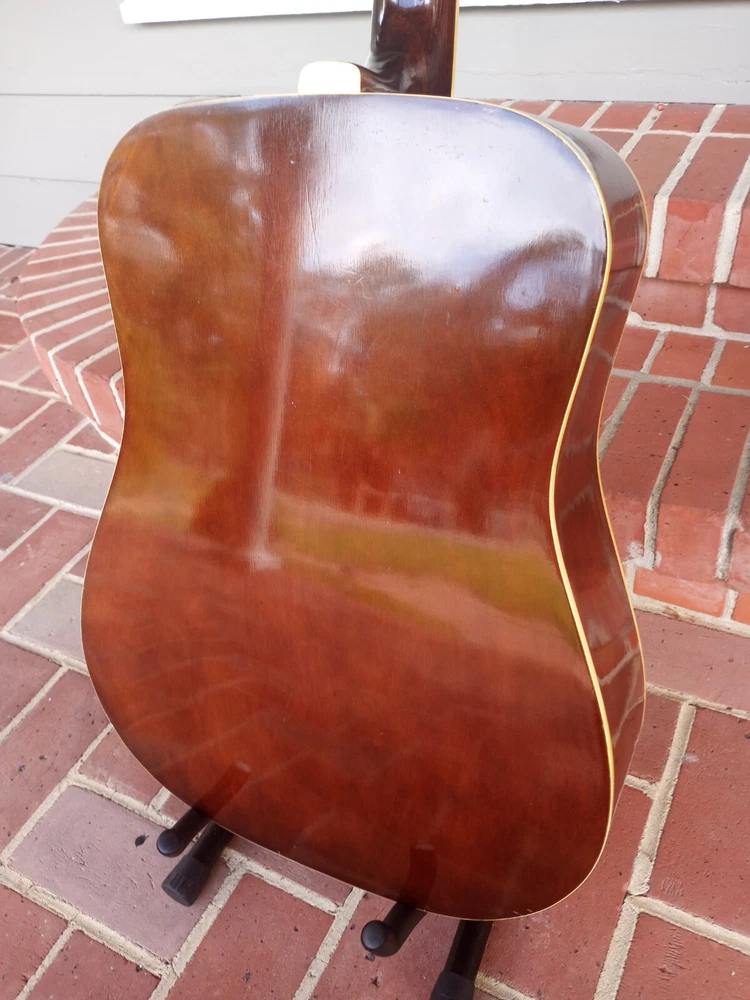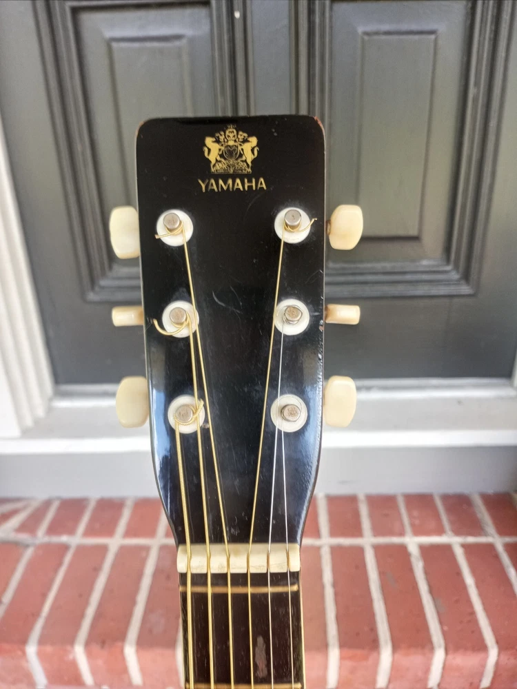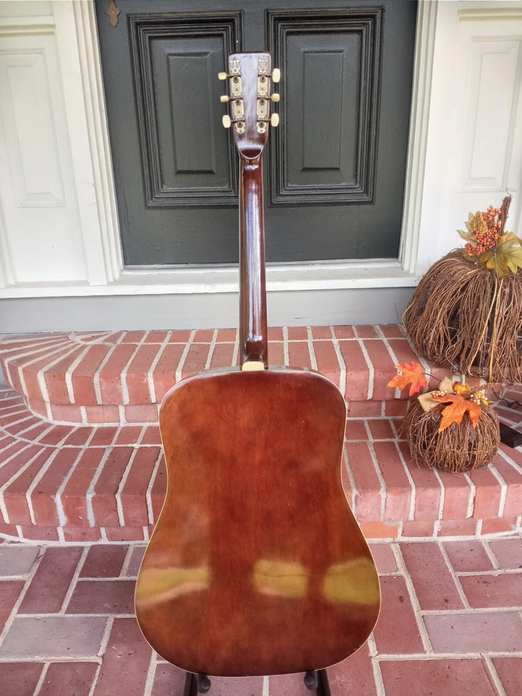 Rare early 1960s Yamaha Youn-Gin Dreadnought. Not alot of info out there on these guitars. What I have read over the years is they were made in 1962/63 for Yamaha by Young-Gin guitars in South Korea. These were supposed to be Yamaha's early entry in budget guitars. Young-Gin guitars has a good reputation in Korea for higher quality budget guitars. However I belive there was no trade agreements with China or Korea at that time and not alot of these guitars made it to the states. If your a Yamaha fan like me this is a nice addtion to your collection that plays and sounds great as well. The guitar it's self is in great structural and mechanical shape with a few cosmetic issuses. Guitar measures at 41" lenght, 12" widest point at top bout and 15 1/2" widest at bottom bout. 4" dept at top and 4 1/2" dept at bottom. 25 1/2" play scale. 20 frets with a zero fret. All smooth on the ends with only lite ware. Neck is thin and taperd making it very fast. Nut size 1 5/8". Just installed new set of D'Addario 12/53s strings. Action is 4.5mm at the 12th fret. No buzzing or dead spots. 3 + 3 open gear tuners are nice quality and hold tune well after new string break in. Very well built high quality binding work front and back of body. Guitar has no wood damage of any kind, No crackes, no seperations, no pull on bridge, No bulging of body. All bracing is tight, no hidden repairs. Bridge is level with no crackes. When I first bought the guitar it had a frat medal gluded to the upper left part of body. When medal was removed it took the finish with it. See last 3 pictures. Guitar also had some sort of message wrote on the front lower right side ( see last 3 pictures ) and looks as if someone tryed to preserve it with some sort of clear coat. Back of guitar has only very lite swirling and lite finish scratches that are hard to see. Over all condition of this 60 year all guitar is very good..Nice collectable and very playable guitar. Does not have case but will use extreme caution when packing for shipment. Happy to answer any questions. Standard shipping is inside 48 states only. UPS ground or FedX home depending on delivery area.