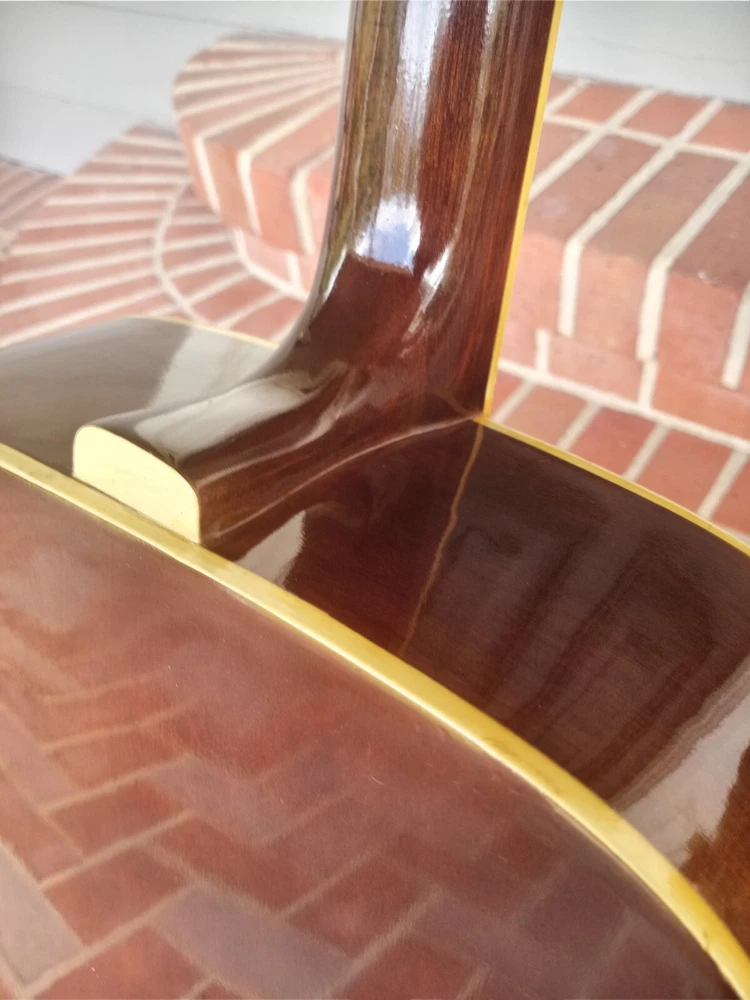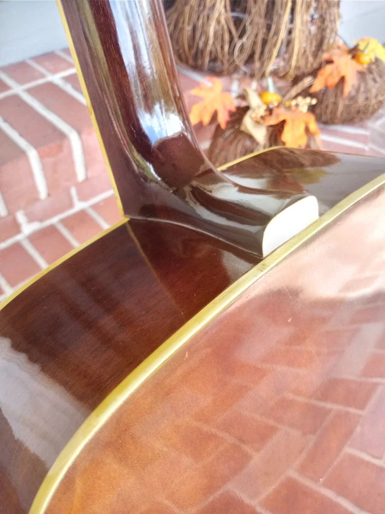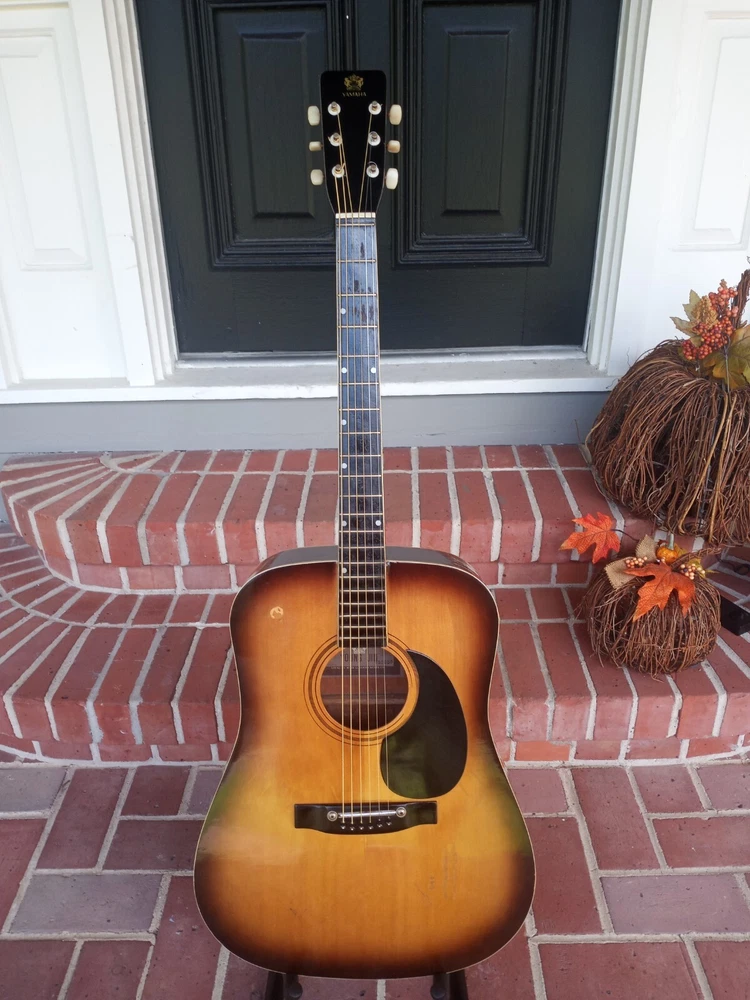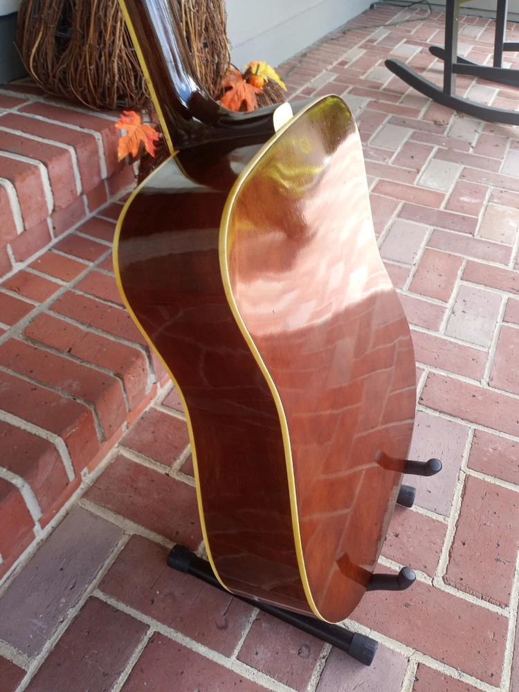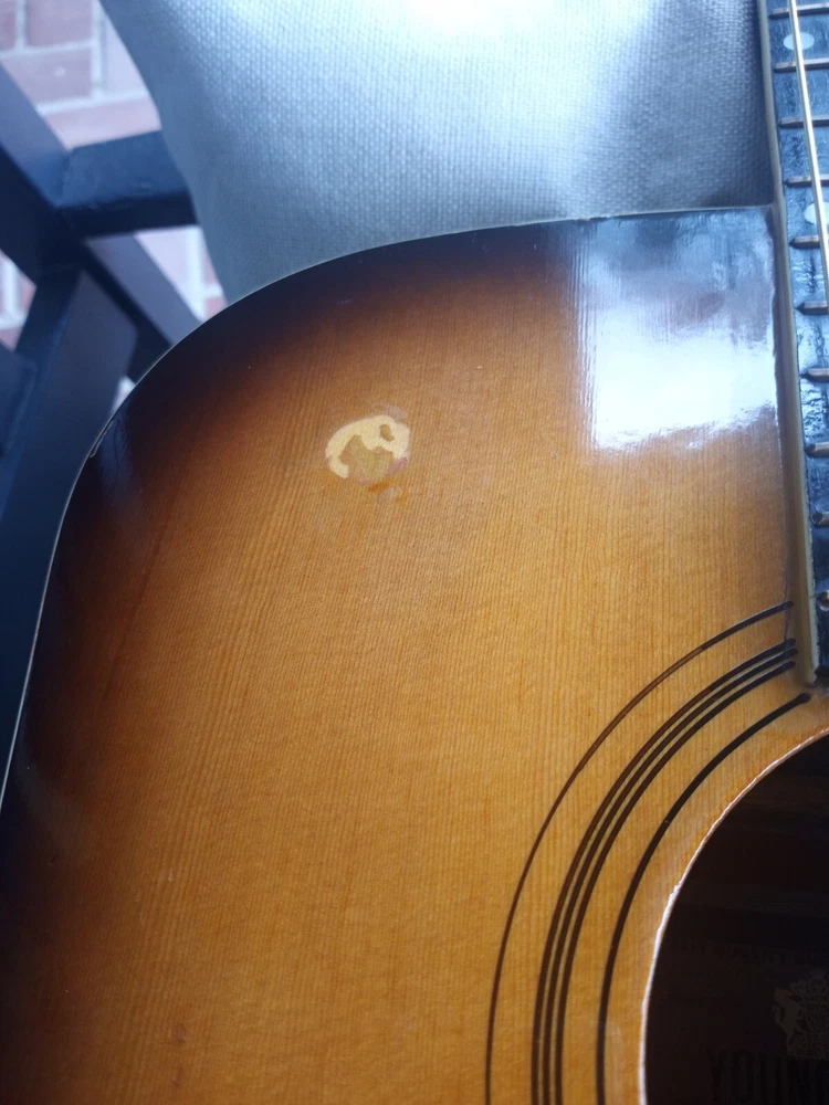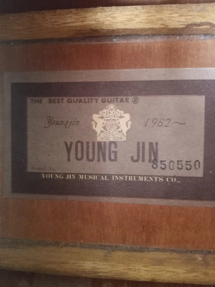 Rare early 1960s Yamaha Youn-Gin Dreadnought. Not alot of info out there on these guitars. What I have read over the years is they were made in 1962/63 for Yamaha by Young-Gin guitars in South Korea. These were supposed to be Yamaha's early entry in budget guitars. Young-Gin guitars has a good reputation in Korea for higher quality budget guitars. However I belive there was no trade agreements with China or Korea at that time and not alot of these guitars made it to the states. If your a Yamaha fan like me this is a nice addtion to your collection that plays and sounds great as well. The guitar it's self is in great structural and mechanical shape with a few cosmetic issuses. Guitar measures at 41" lenght, 12" widest point at top bout and 15 1/2" widest at bottom bout. 4" dept at top and 4 1/2" dept at bottom. 25 1/2" play scale. 20 frets with a zero fret. All smooth on the ends with only lite ware. Neck is thin and taperd making it very fast. Nut size 1 5/8". Just installed new set of D'Addario 12/53s strings. Action is 4.5mm at the 12th fret. No buzzing or dead spots. 3 + 3 open gear tuners are nice quality and hold tune well after new string break in. Very well built high quality binding work front and back of body. Guitar has no wood damage of any kind, No crackes, no seperations, no pull on bridge, No bulging of body. All bracing is tight, no hidden repairs. Bridge is level with no crackes. When I first bought the guitar it had a frat medal gluded to the upper left part of body. When medal was removed it took the finish with it. See last 3 pictures. Guitar also had some sort of message wrote on the front lower right side ( see last 3 pictures ) and looks as if someone tryed to preserve it with some sort of clear coat. Back of guitar has only very lite swirling and lite finish scratches that are hard to see. Over all condition of this 60 year all guitar is very good..Nice collectable and very playable guitar. Does not have case but will use extreme caution when packing for shipment. Happy to answer any questions. Standard shipping is inside 48 states only. UPS ground or FedX home depending on delivery area.