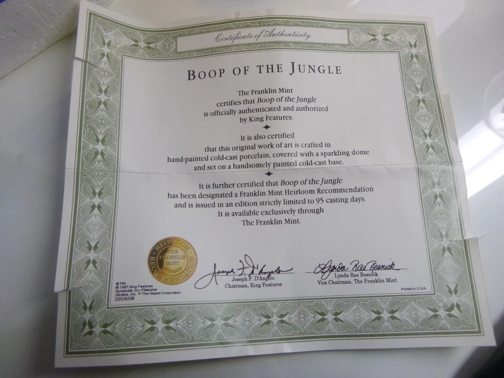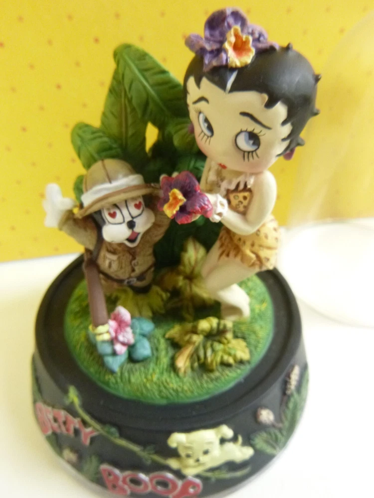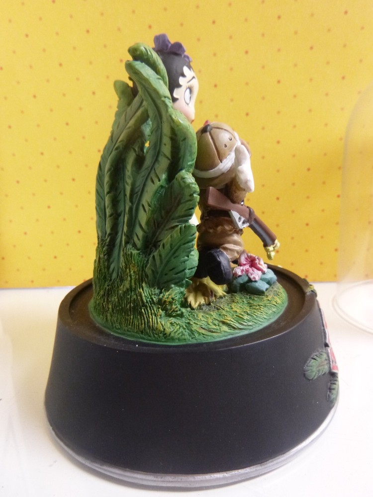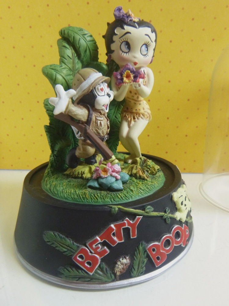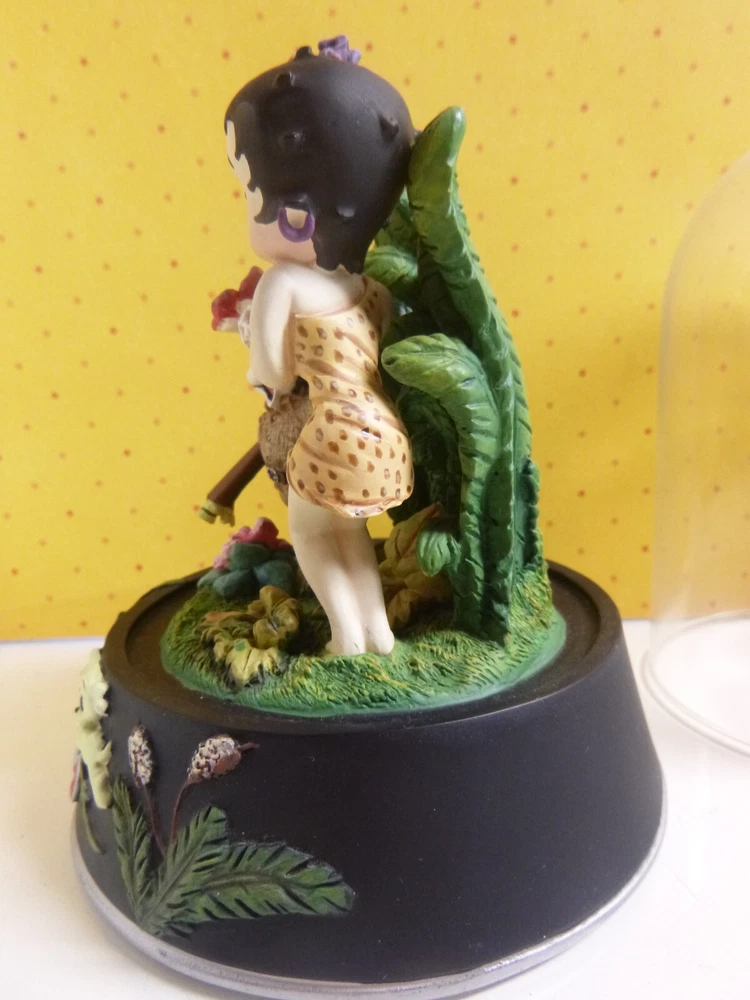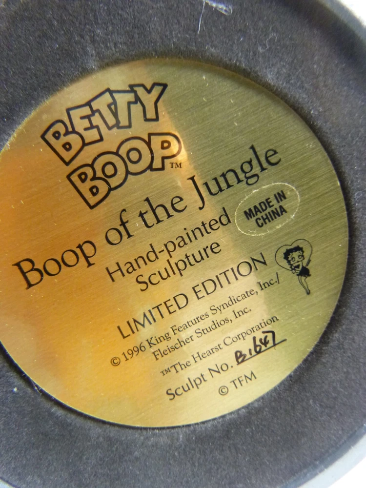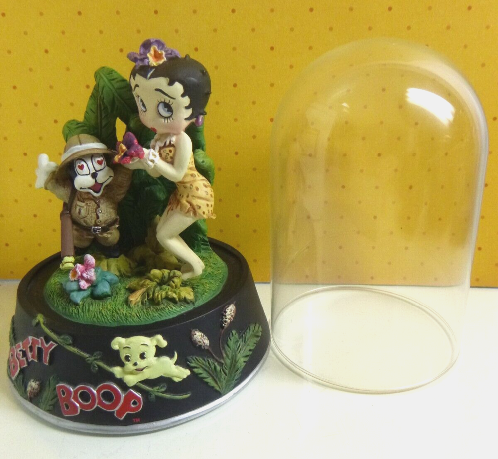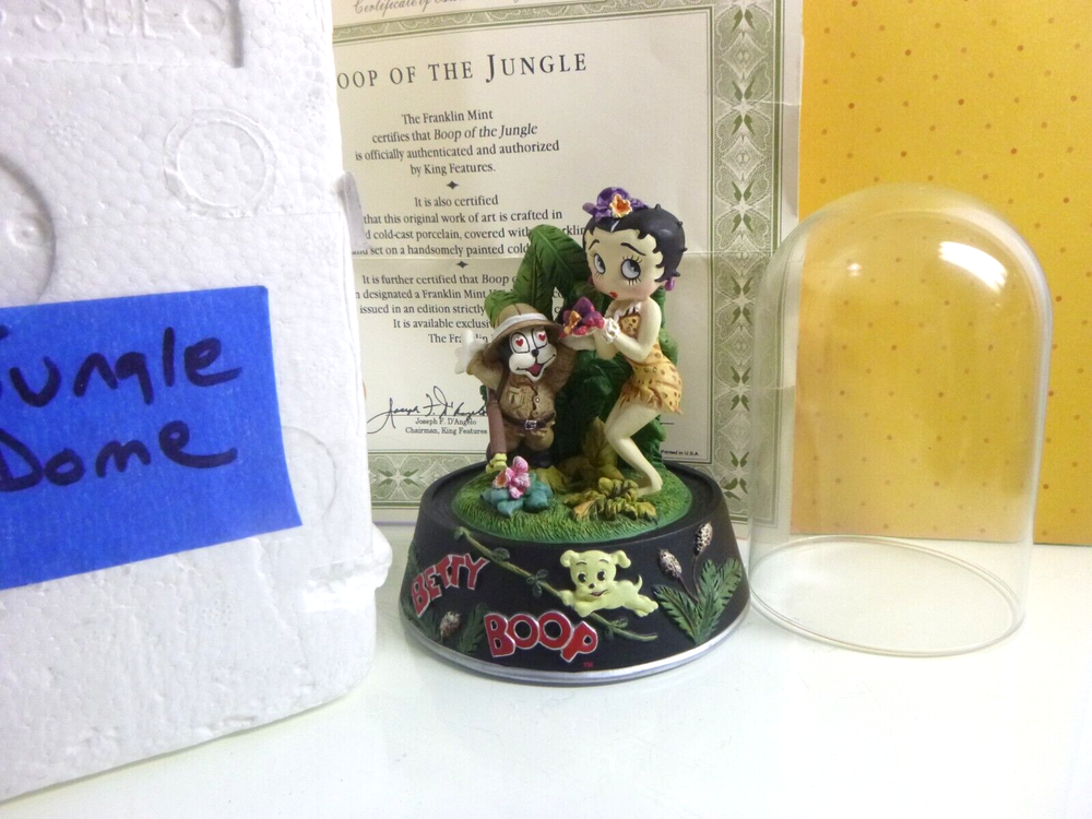 This is a pre-owned Betty Boop figurine called "Boop of the Jungle". Comes in original styrofoam box with dome and COA. COA has some rips along the edges of the paper. No cracks or chips. Non-smoking home. Figurine 5" tall. Has a glass dome- which is removeable.