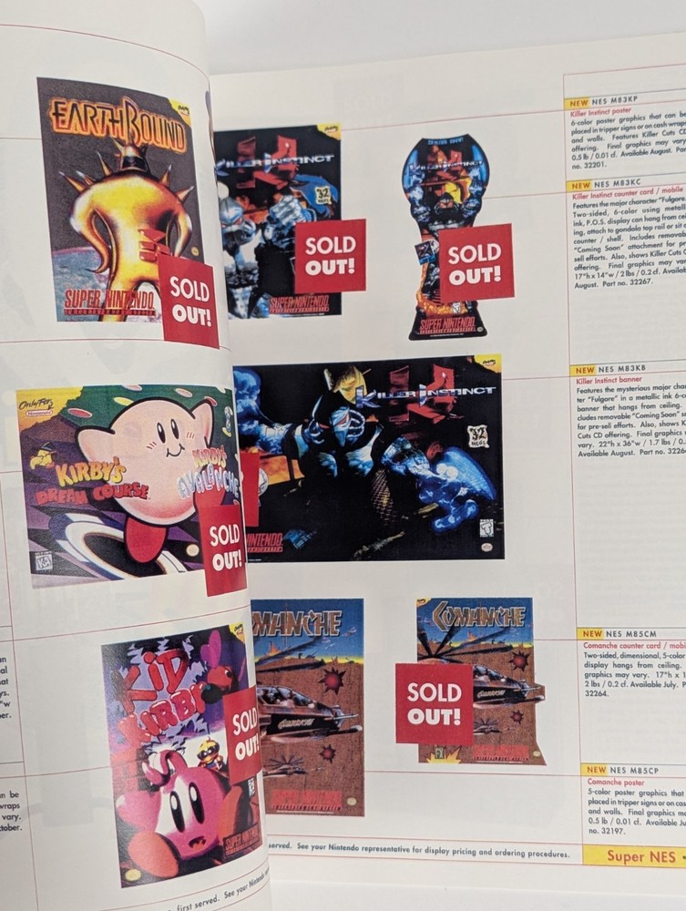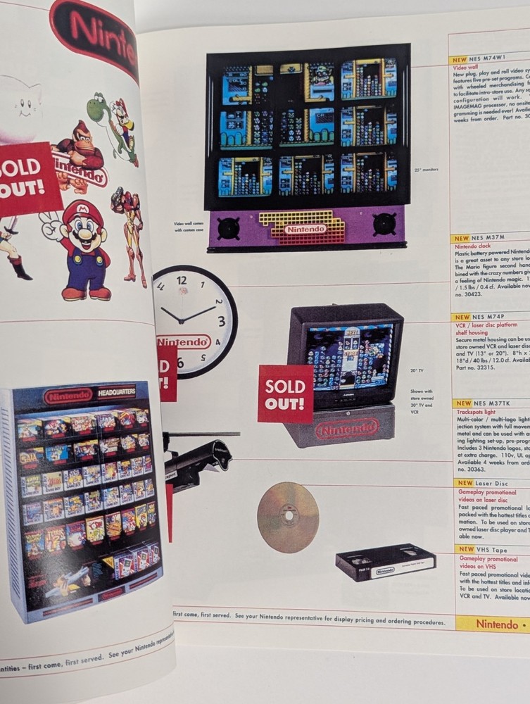 1996 Nintendo Employee Merchandising Catalog Source Book Employees. A couple pages only. But all the merchandising catalogs are the same with just a few pages but they're completely full of all the amazing store displays and promotional items that you can purchase if you were a retailer back in 1995 and now 1996. This book is a very unique book compared to other merchandising catalogs with short displays in them It's like they took a 1995 catalog and slapped a new logo of the new 1996 on it. It mentions that most of the displays are sold. I would suspect they did this because they ran out of time making the 1996 catalog. The catalog itself is not laminated. It looks to be more of a quick rush job. It still is a clean piece and properly made. I would suspect this is a very rare catalog to find to do how few were produced A lot of displays are marked sold out! The book has 8 pages inside.