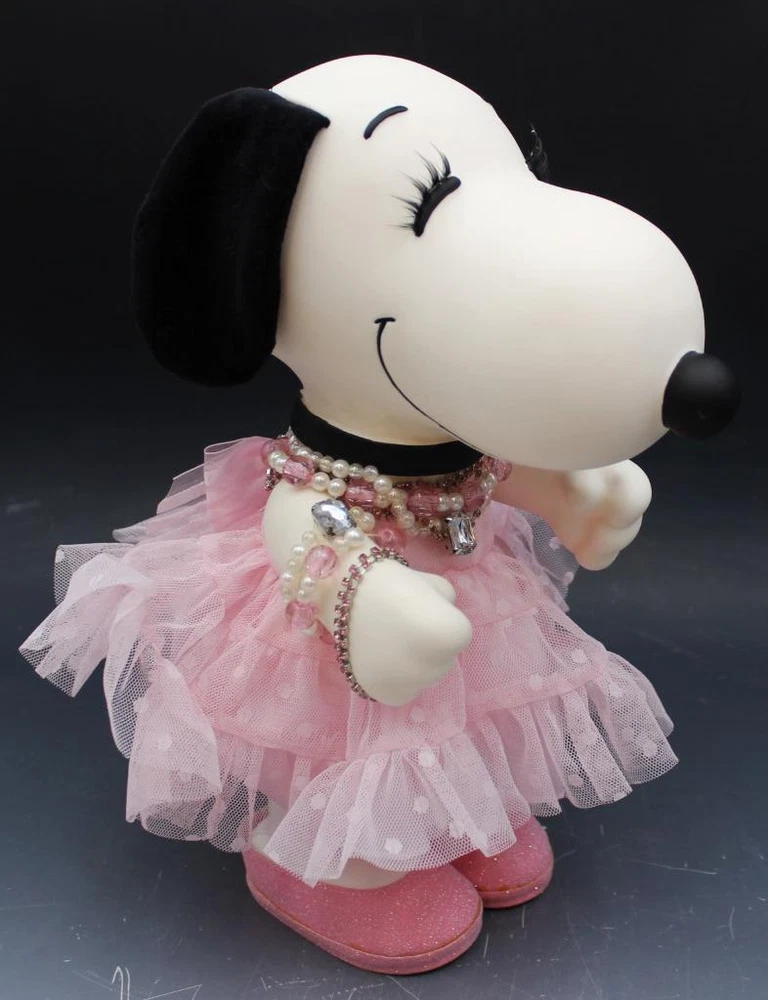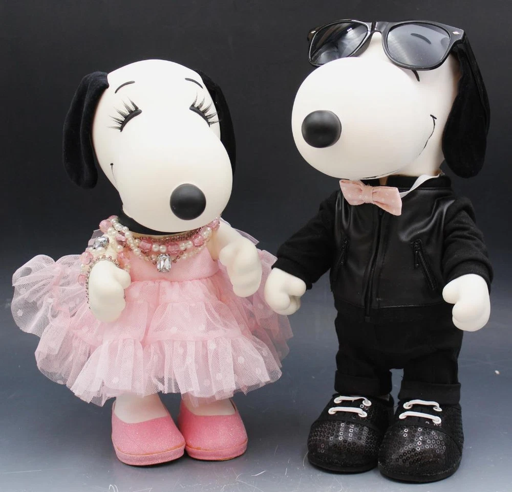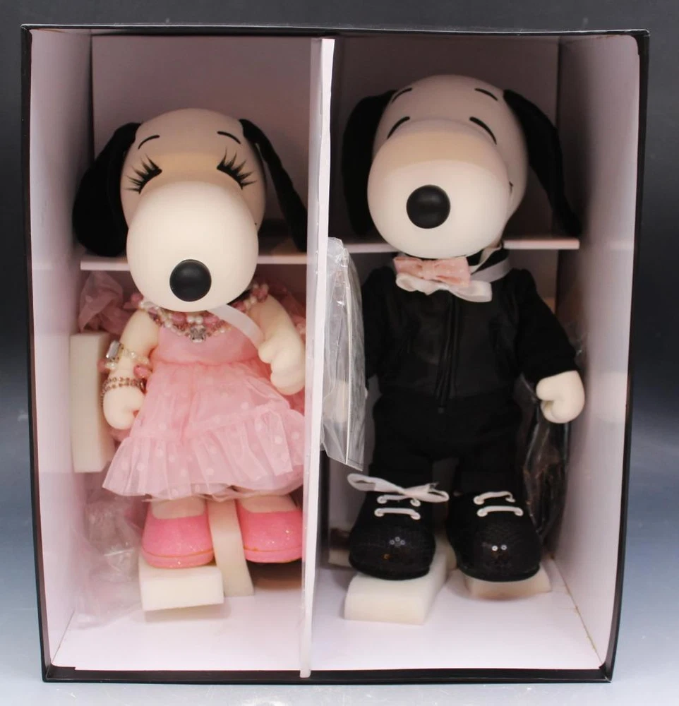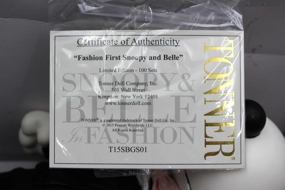 This listing is for a rare hard to find vintage limited release 2015 Fashion First Snoopy & Belle doll set by Tonner Doll Co. The set includes Snoopy and Belle dolls and is limited to 100 pieces. Snoopy measures about 13 inches tall and has a white skin tone, black velvet ears, and his signature smile. His outfit consists of a black jacket and pants, a white long sleeve shirt, a pink & white polka-dot bow tie, white socks, black sequin shoes with white laces, and very cool black sunglasses. Belle measures about 12 inches tall also has a white skin tone, black velvet ears, a charming smile to match Snoopy’s, plus a pink hair bow. Belle’s ensemble boasts a pink polka-dot tulle dress, pink petticoat with attached panties, a pink faux pearl, rhinestone and bead multi-strand necklace, faux pearl, rhinestone and bead bracelets, and playful pink glitter canvas shoes. They are in excellent original condition with their fitted box and their Certificate of Authenticity. Please see many photographs as they are an important part of the description. Visit My eBay Store for other antique and vintage items, and Add me to your Favorite Sellers. Rare 2015 Peanuts Fashion First Snoopy & Belle Tonner Doll Set Limited Edition Rare 2015 Peanuts Fashion First Snoopy & Belle Tonner Doll Set Limited Edition Click images to enlarge Description This listing is for a rare hard to find vintage limited release 2015 Fashion First Snoopy & Belle doll set by Tonner Doll Co. The set includes Snoopy and Belle dolls and is limited to 100 pieces. Snoopy measures about 13 inches tall and has a white skin tone, black velvet ears, and his signature smile. His outfit consists of a black jacket and pants, a white long sleeve shirt, a pink & white polka-dot bow tie, white socks, black sequin shoes with white laces, and very cool black sunglasses. Belle measures about 12 inches tall also has a white skin tone, black velvet ears, a charming smile to match Snoopy’s, plus a pink hair bow. Belle’s ensemble boasts a pink polka-dot tulle dress, pink petticoat with attached panties, a pink faux pearl, rhinestone and bead multi-strand necklace, faux pearl, rhinestone and bead bracelets, and playful pink glitter canvas shoes. They are in excellent original condition with their fitted box and their Certificate of Authenticity. Please see many photographs as they are an important part of the description. Visit My eBay Store for other antique and vintage items, and Add me to your Favorite Sellers . Shipping anywhere in the US via FedEx Ground with full insurance is free. All International shipping is with through the eBay Global Shipping Program. If there are any issues with your purchase please message us prior to opening a case and we will do all that we can to help the situation to the best of our ability. We try to maintain a high status of excellence through helping our customers with any issues that may arise. Thank you, pg123 Pictures sell! Auctiva offers Free Image Hosting and Editing. 300+ Listing Templates! Auctiva gets you noticed! The complete eBay Selling Solution. Track Page Views With Auctiva's Counter