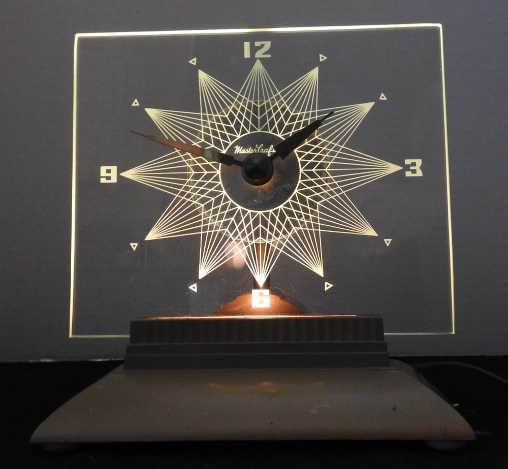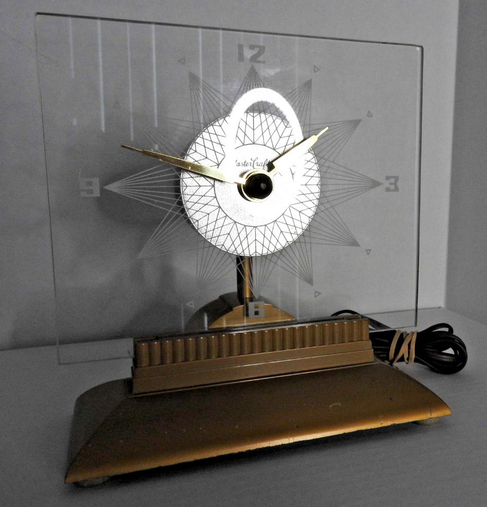 Here we have up for sale an ORIGINAL 1950's MasterCrafters Atomic Eternalight Desk Clock. Clock runs well with its original cord. Light switch works as it should also. Looks really cool when lit. Measures 8 1/2" x 8 1/2". Glass is perfect. Base is nice too but does have a couple of minor paint chips. Clock is in VERY GOOD+ overall condition and ships for FREE. Thanks for viewing.....Triple K