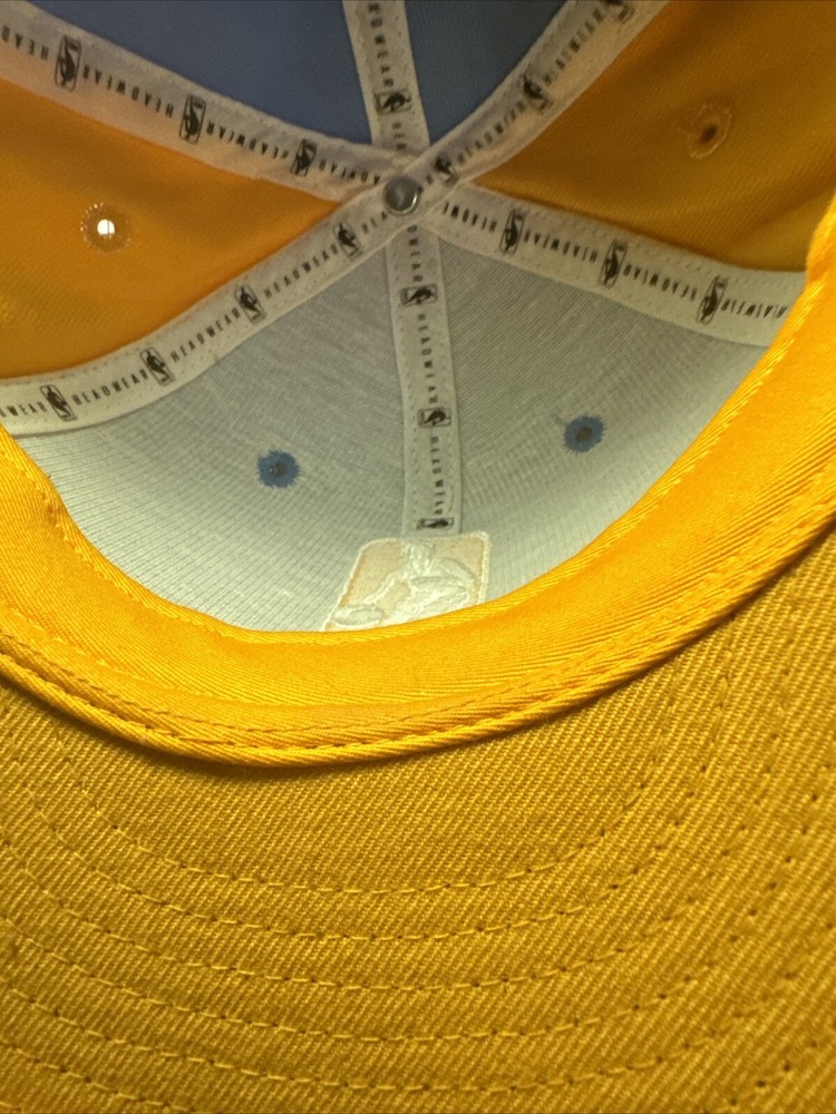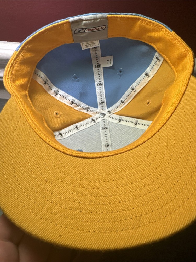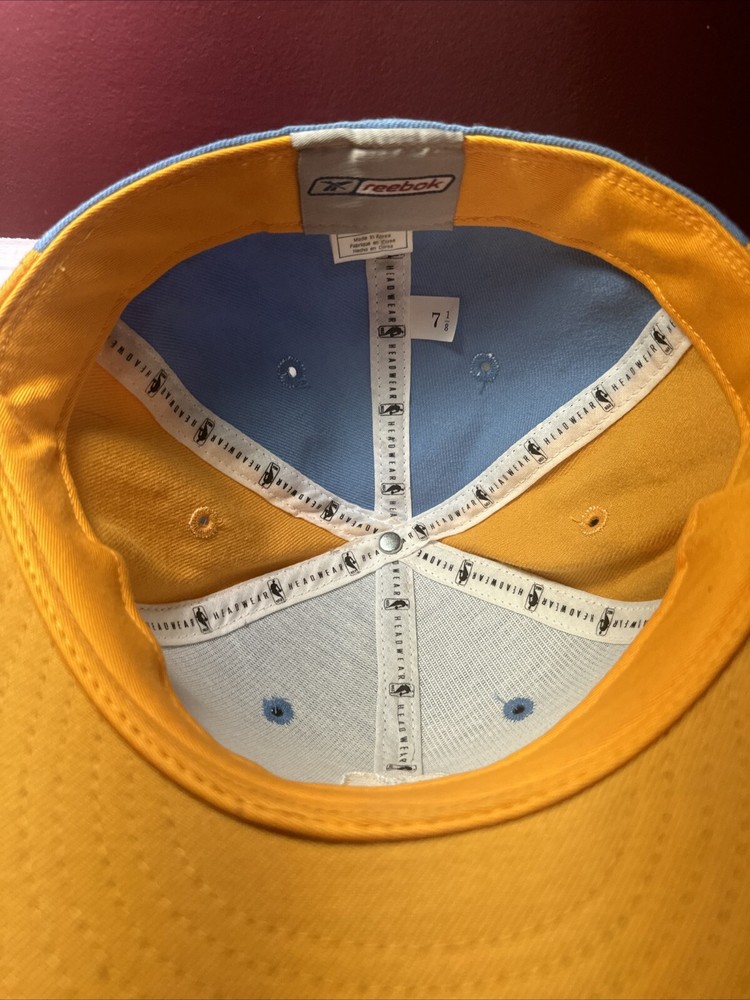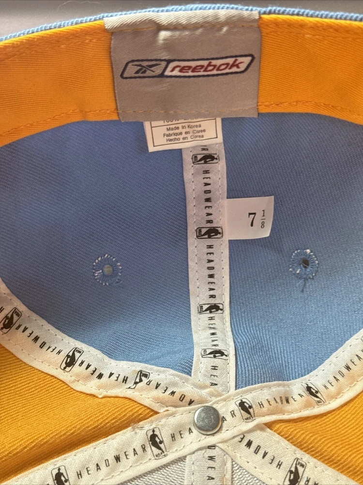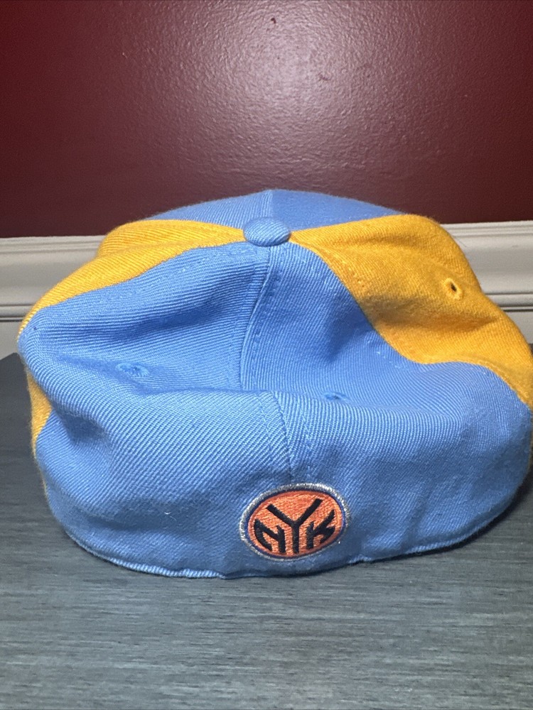 Get your hands on this rare vintage NBA NYK fitted cap hat in light blue, perfect for any basketball fan. Made by Reebok, this cap features the iconic NYK team logo and is size 7 1/8. The yellow and blue color combination is a must-have for any NYK enthusiast. This cap is the perfect addition to any vintage jersey collection and is a great way to show off your love for the National Basketball Association. Made in Korea, this cap is a unique and stylish piece of fan apparel that will surely turn heads. Don't miss out on this opportunity to add a piece of NYK history to your collection.
