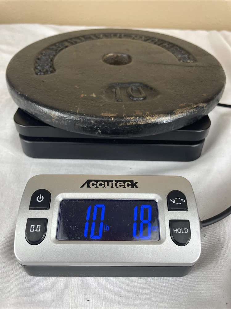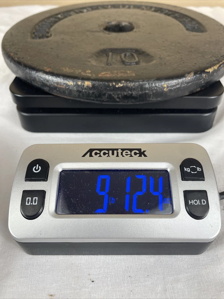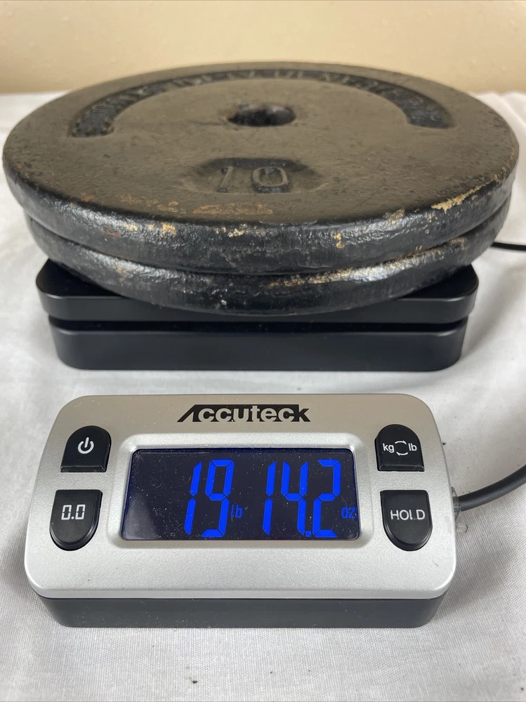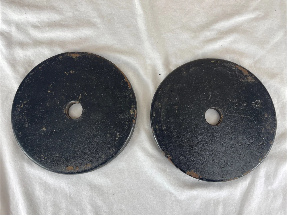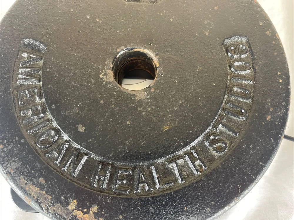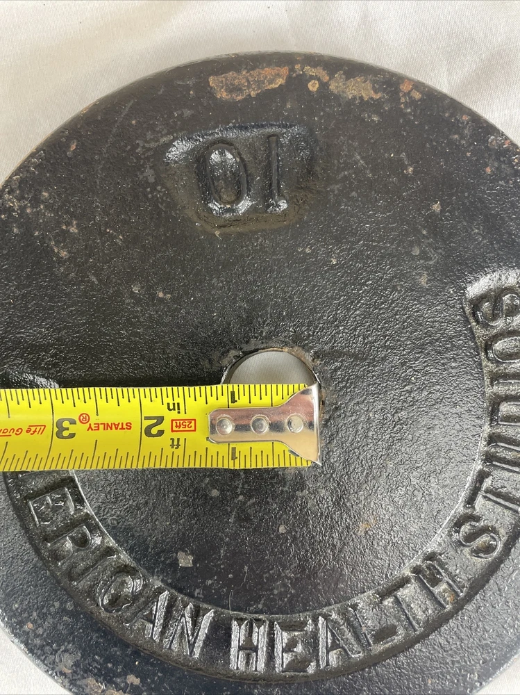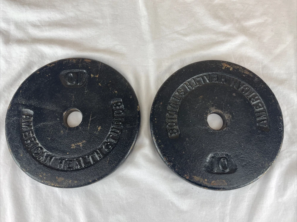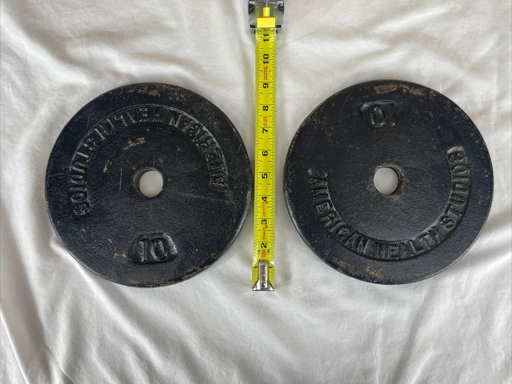 2x 10 pound standard weight plates from one of the earliest chain fitness centers American Health Studios (1950’s).