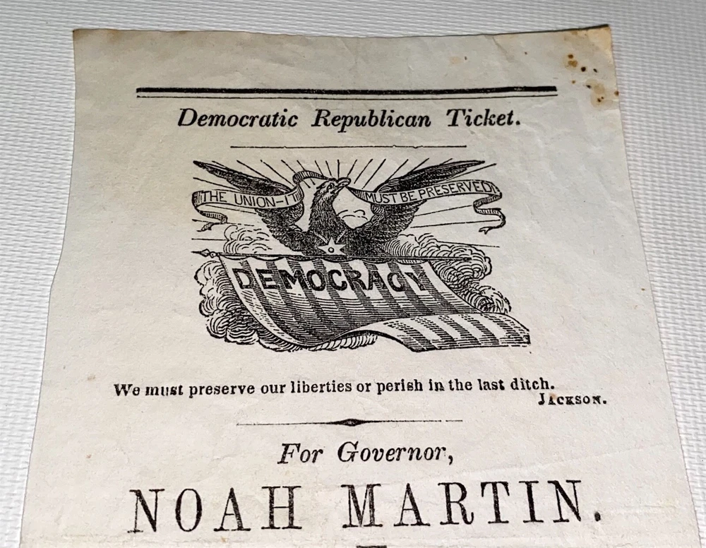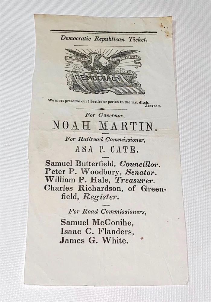 UP FOR SALE: Rare Antique American Democratic Republican New Hampshire Governor Ticket! 1852! Fantastic Antique Victorian American Pre - Civil War Political Ticket! Democratic Republican Ticket "We Must Preserve Our Liberties or Perish In the Last Ditch." - Jackson For Governor - Noah Martin Info: "Noah Anthony Martin was born in Epsom, New Hampshire on July 26, 1801, the son of shoemaker Samuel Martin and Sally (Cochrane) Martin. He apprenticed under Pembroke and Deerfield doctors before attending Dartmouth Medical College. He graduated in 1824, and began his medical practice in Somersworth. He later practiced in Pembroke, and then settled in Dover. In 1825, Martin married Mary Jane Woodbury, the daughter of Dr. Robert Woodbury of Barrington. They were the parents of two daughters, Elizabeth A. and Caroline M. Martin served as a State Representative in 1830 and 1832, as a State Senator in 1835 and 1836, and in the House again in 1837. In addition to being involved in several medical, agricultural, historical, and genealogical societies, Martin was president of the Strafford County Savings Bank (1844–1852), board of directors member of the Dover Bank (1847–1855), and board of directors member of the Strafford Bank (1860–1863). In 1852 Martin was elected Governor of New Hampshire, the first of two from Dover, and he served two one-year terms, June 3, 1852 to June 8, 1854. Martin died in Dover on May 28, 1863, and is buried at Dover's Pine Hill Cemetery." (WIKI) Asa. P. Carte - Railroad Commissioner Samuel Butterfield, Councillor Peter P. Woodbury, Senator William P. Hale, Treasurer Charles Richardson, Register For Road Commissioners: Samuel McConihe Isaac C. Flanders James G. White A great piece of 19th the Century American Political Ephemera! Actual item pictured! Item comes as seen and as is! Please see all photos! Shipping includes insurance & tracking for both buyer and seller's protection! If you have any questions, please do not hesitate to ask! Thanks for stopping in! Scantic Antiques