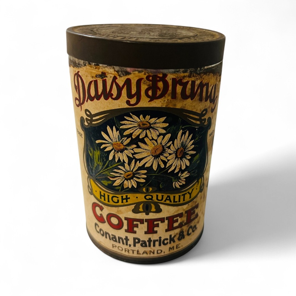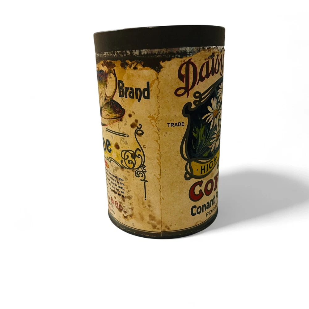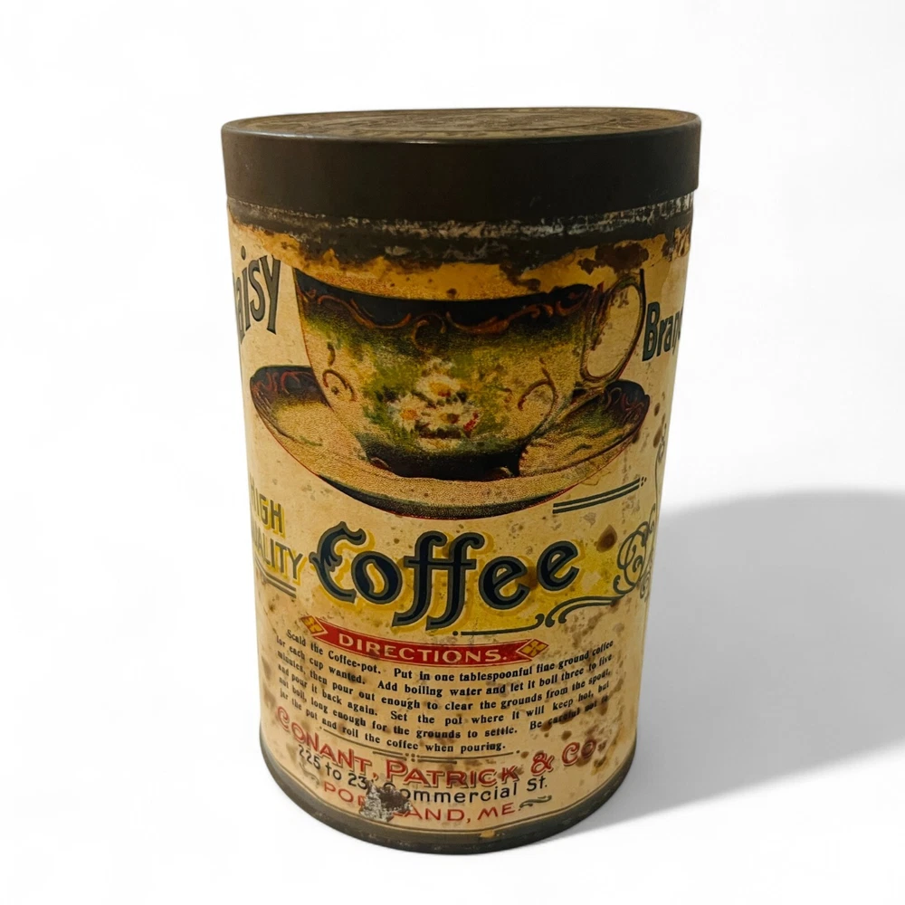 This is a rare antique coffee tin from the Daisy Brand, distributed by Conant, Patrick & Co. of Portland, Maine. Likely dating back to the early 1900s, this cylindrical tin features a beautifully illustrated teacup and saucer graphic and ornate typography advertising “High Quality Coffee.” Instructions for brewing are printed in red on the front label, with charming period directions such as “Scald the coffee-pot” and “Pour out enough to clear the grounds.” The tin stands approximately 6 inches tall and shows expected signs of aging, including oxidation near the top rim and general surface wear. Despite the aging, the piece retains its historical charm and vibrant design. Perfect for collectors of vintage coffee tins, antique advertising, kitchen decor, or Maine-based memorabilia. This tin was acquired from a private antique coffee collector and remains a one-of-a-kind display piece Bonus Inclusion: This listing includes the original promotional coupon that came with the tin. The coupon offered customers a premium aluminum sauce pan set in exchange for tea and coffee coupons—an excellent glimpse into early 20th-century American advertising and loyalty programs.