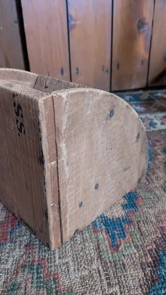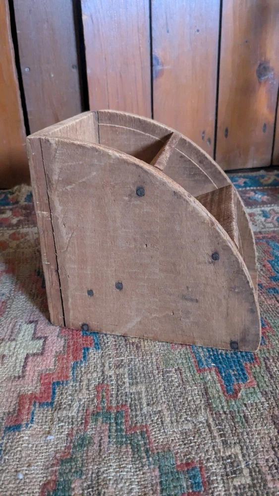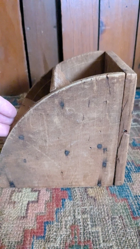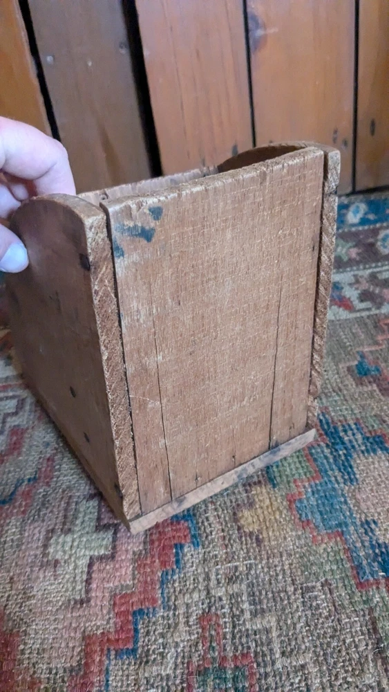 Offering this antique wood handmade small bag holder. Measures 7.5" L x 7" T x 5.5" W. This piece has a nice attic style surface. Made from an advertising piece. Has smooth edges from age and use. Great display piece to hold paper bags or mail if in your home. Perfect size for about anywhere. Thanks for looking.