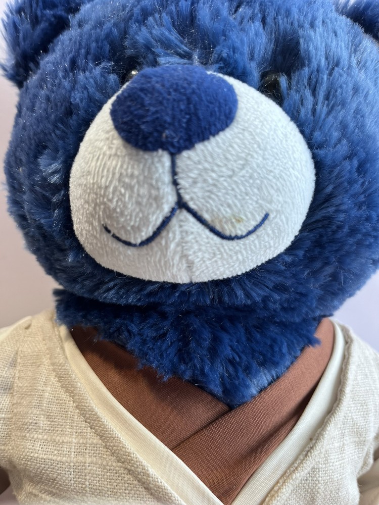 This is a rare blue Jedi plush bear from Build-A-Bear Workshop's Star Wars collection. The bear has black eyes and is dressed in a Jedi costume, making it perfect for all Star Wars occasions. It is part of the Build-a-Bear franchise and is a unique addition for any Star Wars fan. Clothing included as seen in pictures Small smudge above mouth.