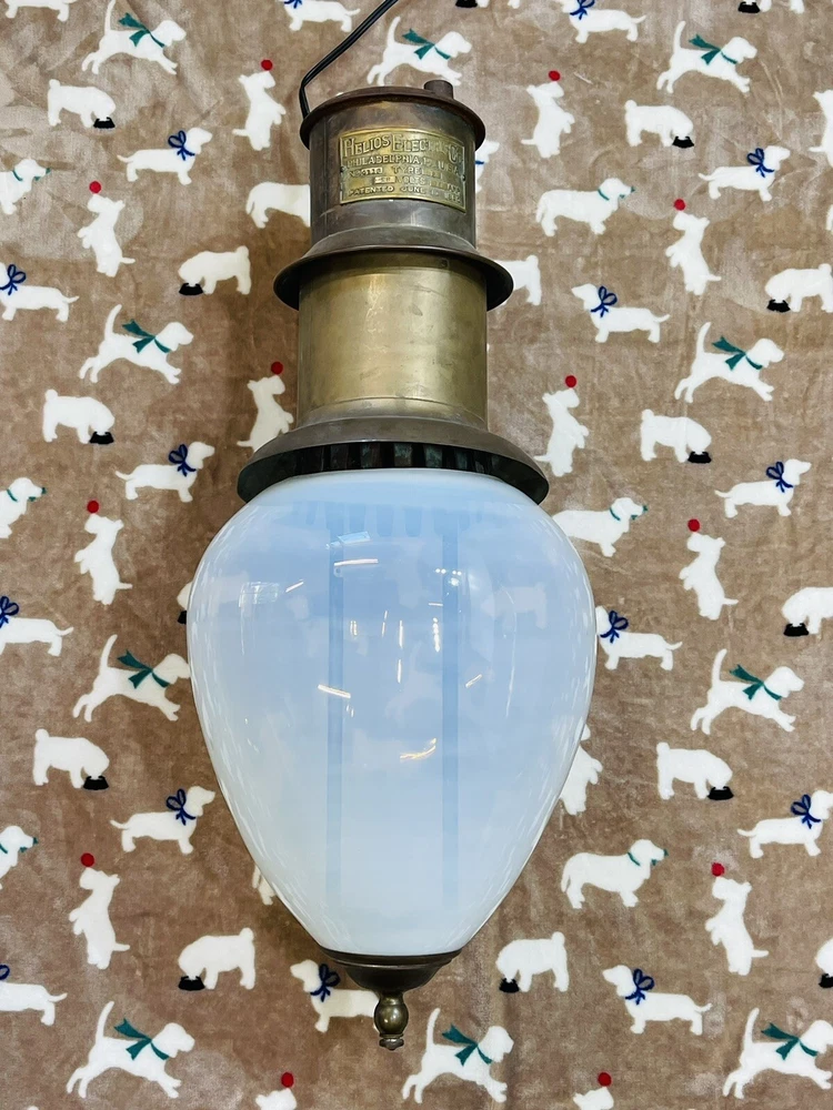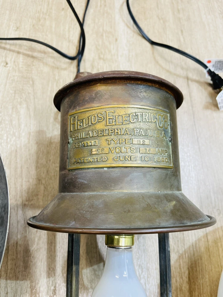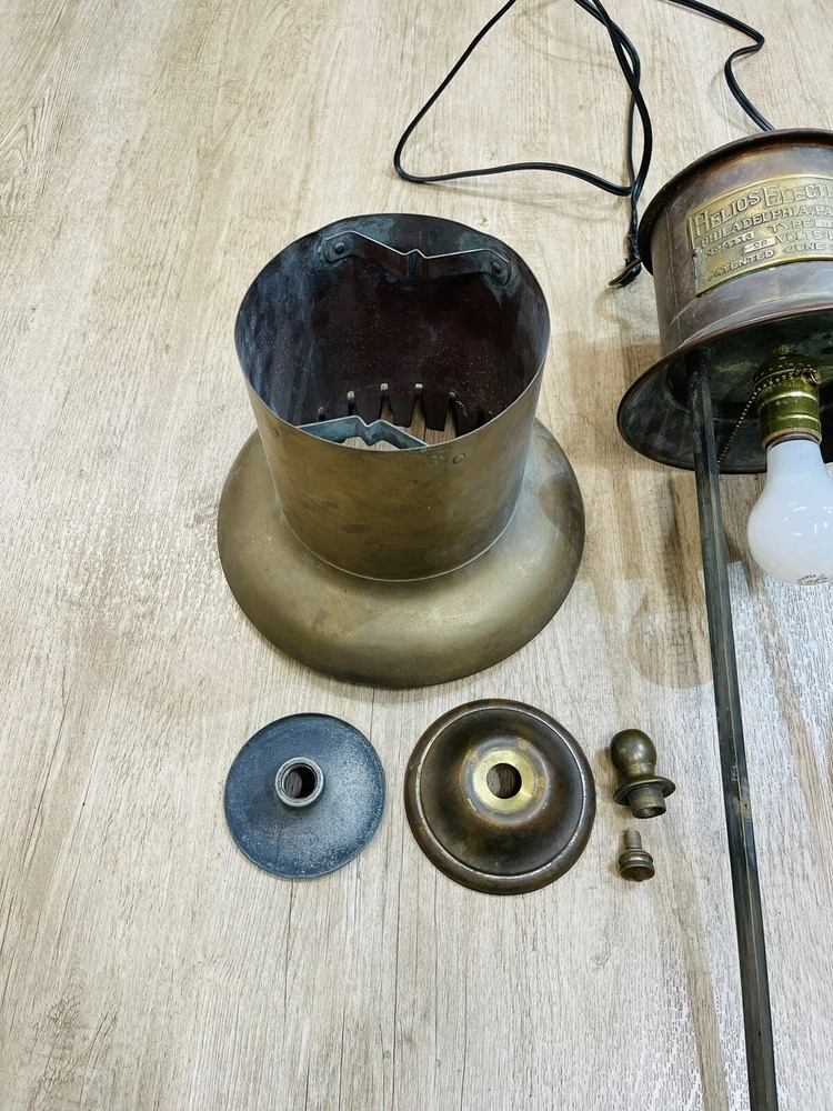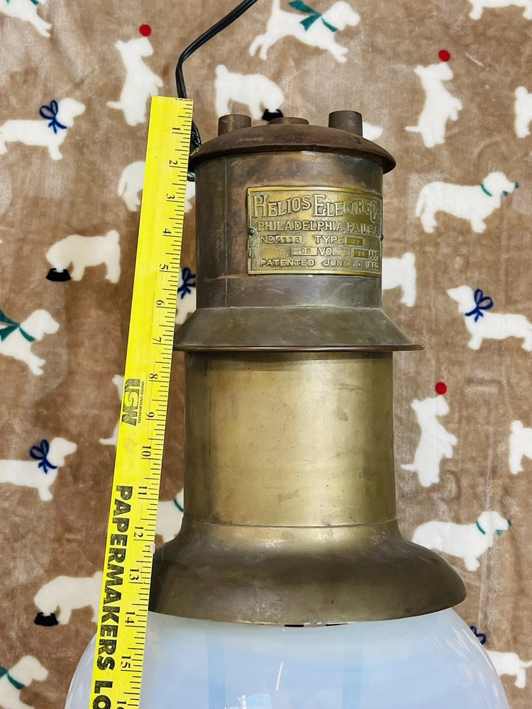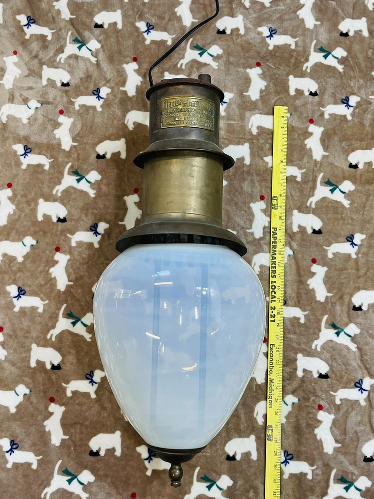The rare Helios electric company now philco, arc lamp measures 30 inches with a smoke glass globe that measures 15 inches high with a diameter at the largest point of 13 inches around. There are no chips or cracks, just some original casting imperfections in the glass. The our plant has been converted into electric, but will need to be professionally redone. It is in antique unrestored condition . It will be professionally packed and shipped while being insured with signature confirmation. If you have any questions, feel free to send a message.
