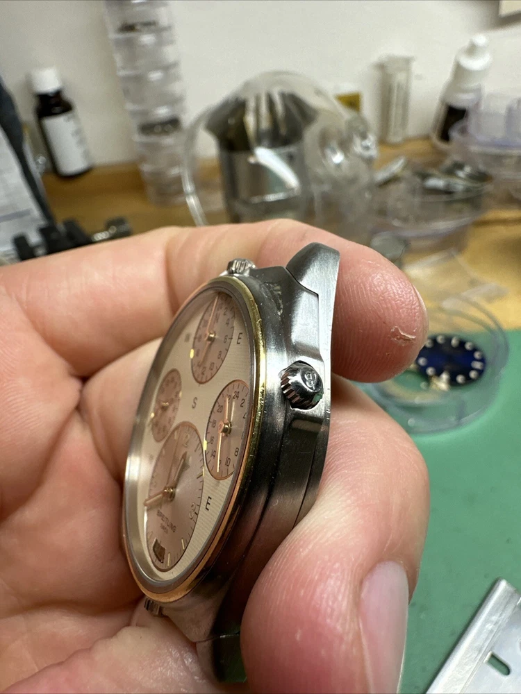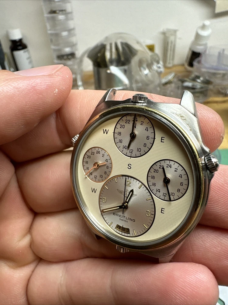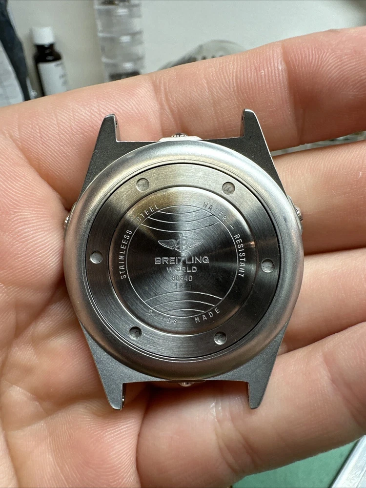This rare Breitling World Time Pilots Watch is a vintage timepiece designed for men with a 39mm stainless steel case and a two-piece strap. The watch features a round, multicolor dial with Arabic numerals, subdials, and a date display. The fixed gold bezel adds a touch of elegance to the overall design. The watch is made in Switzerland and runs on quartz movement (battery). It also includes features such as world time, unidirectional case, and a screwback case. This watch is perfect for collectors or anyone who appreciates the classic design of a vintage timepiece. Watch isn’t running, not sure how to open it to replace batteries. Watch is pretty much mint, hasn’t been worn very much. Watch only Questions let me know