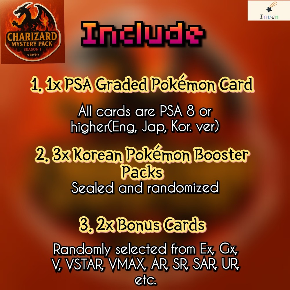 Your trusted Korean Pokémon goods specialist – INVEN 🔥 Charizard Mystery Pack(Season 1) 🔥 1x Graded PSA Card + 3 Booster Packs + 2 Bonus Cards Who will uncover the Ultimate Charizard slab? Discover the thrill of collecting with our premium mystery pack. Each pack includes: 🎴 1x PSA Graded Pokémon Card – all cards are PSA 7 or higher(Eng, Jap, Kor. ver) 🧊 3x Korean Pokémon Booster Packs – sealed and randomized ✨ 2x Bonus Cards – randomly selected from Ex, Gx, V, VSTAR, VMAX, AR, SR, SAR, UR, etc. 🔥 Approximately 5% of packs include a premium Charizard PSA slab worth up to $600! ✅ 3 booster packs included per mystery box — increasing the guaranteed base value! 💥 All high-tier hit cards are exclusively Charizard PSA-graded slabs . No other Pokémon featured as hits. 🧡 About 2/3 of all graded PSA cards feature Charizard , while the remaining 1/3 include other popular Pokémon such as Pikachu, Umbreon, Gengar, and more. Each mystery pack is carefully hand-packed and distributed at random. Perfect for collectors who enjoy surprises, risk, and big potential rewards. 🤫 Psst... some lucky buyers might find a Pokémon keychain secretly tucked inside — just our little way of saying thank you! 💝