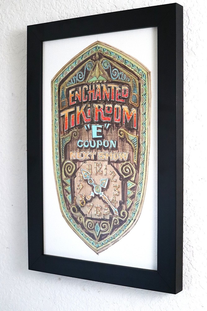 Own a piece of Disney history with this stunning and rare concept art Enchanted Tiki Room "E" Coupon Next Show Clock art. A true collector’s treasure, this framed canvas giclée is exclusive to Disney Parks and showcases the timeless artistry behind the iconic attraction. Artist: Unknown Type: Giclée & Iris Print on Canvas Canvas Dimensions:19 1/4" H x 11 3/4" W Framed Dimensions:22 3/4"H x 14 3/4" W Condition: Excellent overall, with a few small scuffs to the frame This extraordinary piece is perfect for Disney enthusiasts, collectors, or anyone who appreciates unique and magical artwork. Don’t miss your chance to add this exclusive Disney Parks item to your collection!