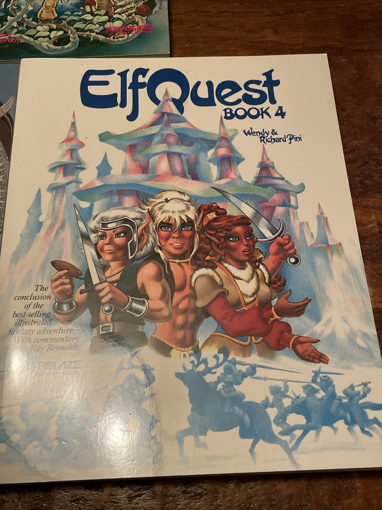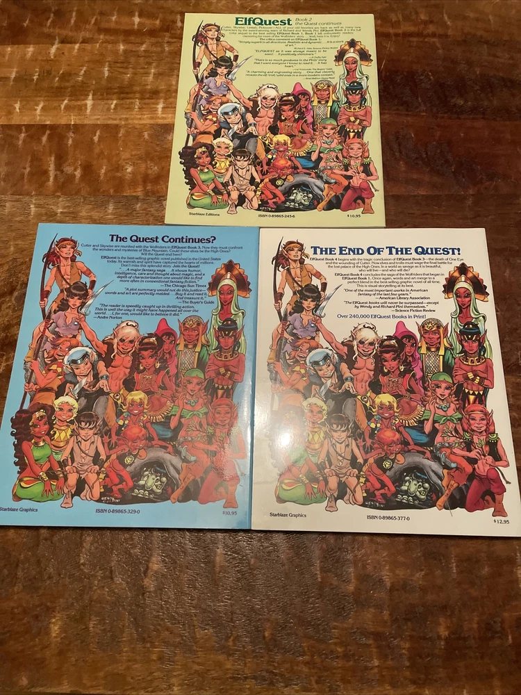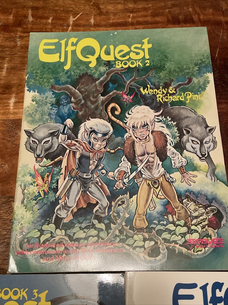 The product is a set of Elfquest graphic novels, specifically books 2, 3, and 4 from the Starblaze Editions series, published in 1982, 1983 & 1984. Created by Wendy and Richard Pini, the graphic novels feature the character Cutter and fall under the genres of adventure, fantasy, and comics. The softcover books are part of the Elfquest series, set in the Bronze Age era of US Comics and published by Starblaze Graphics. This rare collection is a valuable addition for fans of the Elfquest series and collectors of graphic novels. - No rips, tears or stains- Volume 3 & 4 are first printings - books 2 & 4 have a mark on the fronts - see pictures