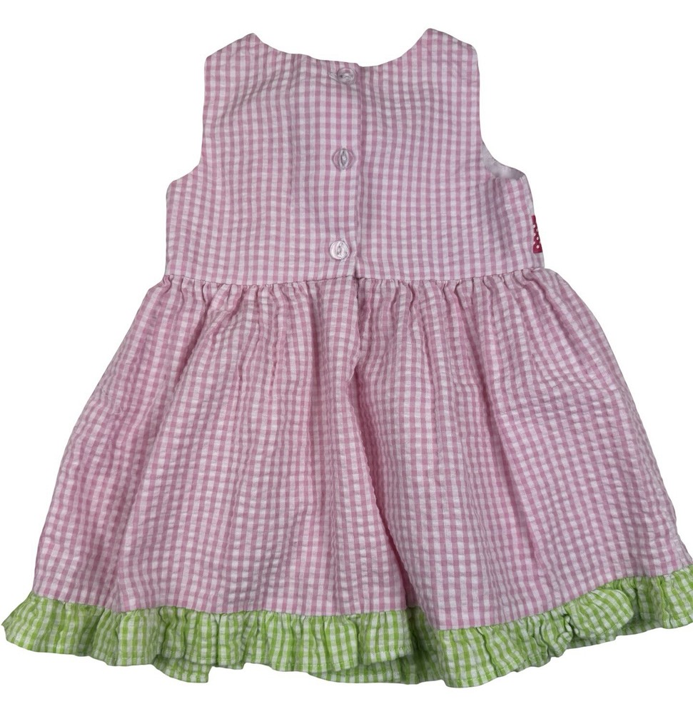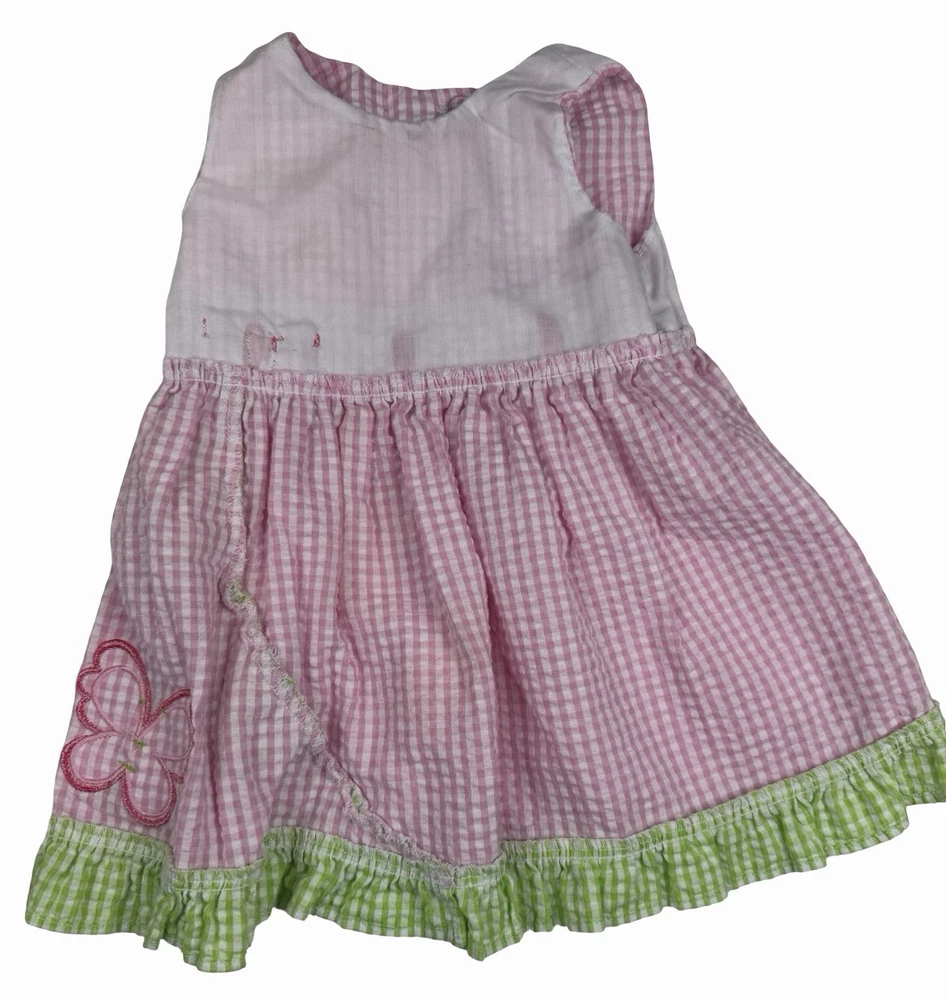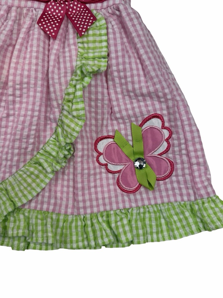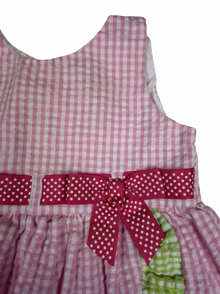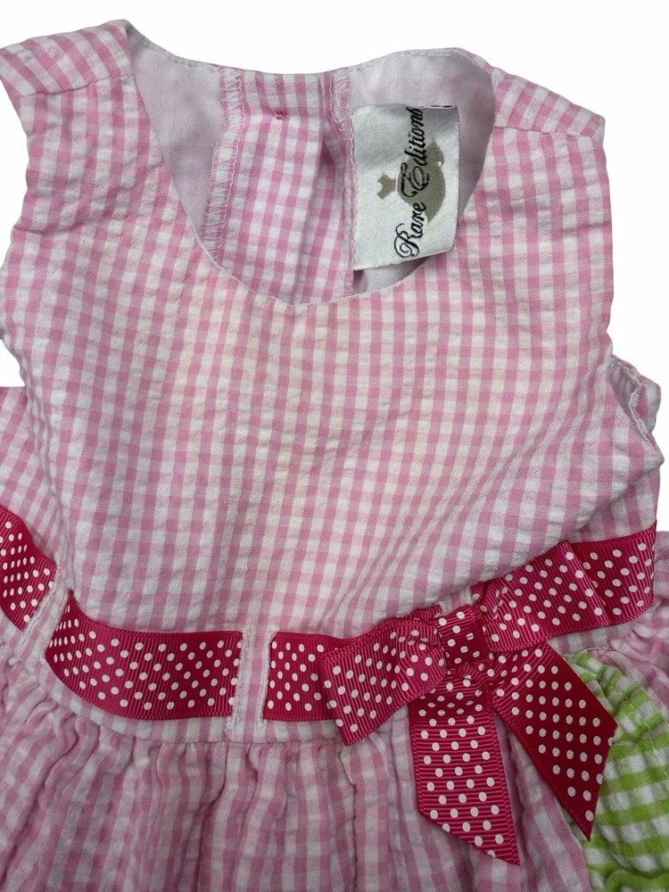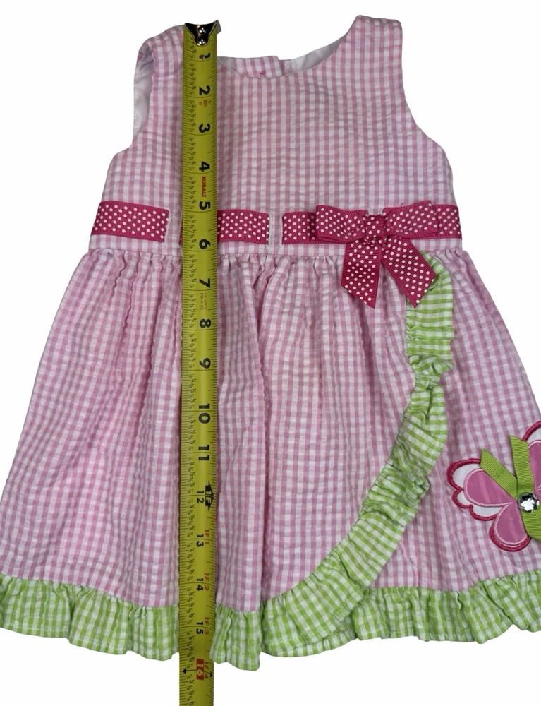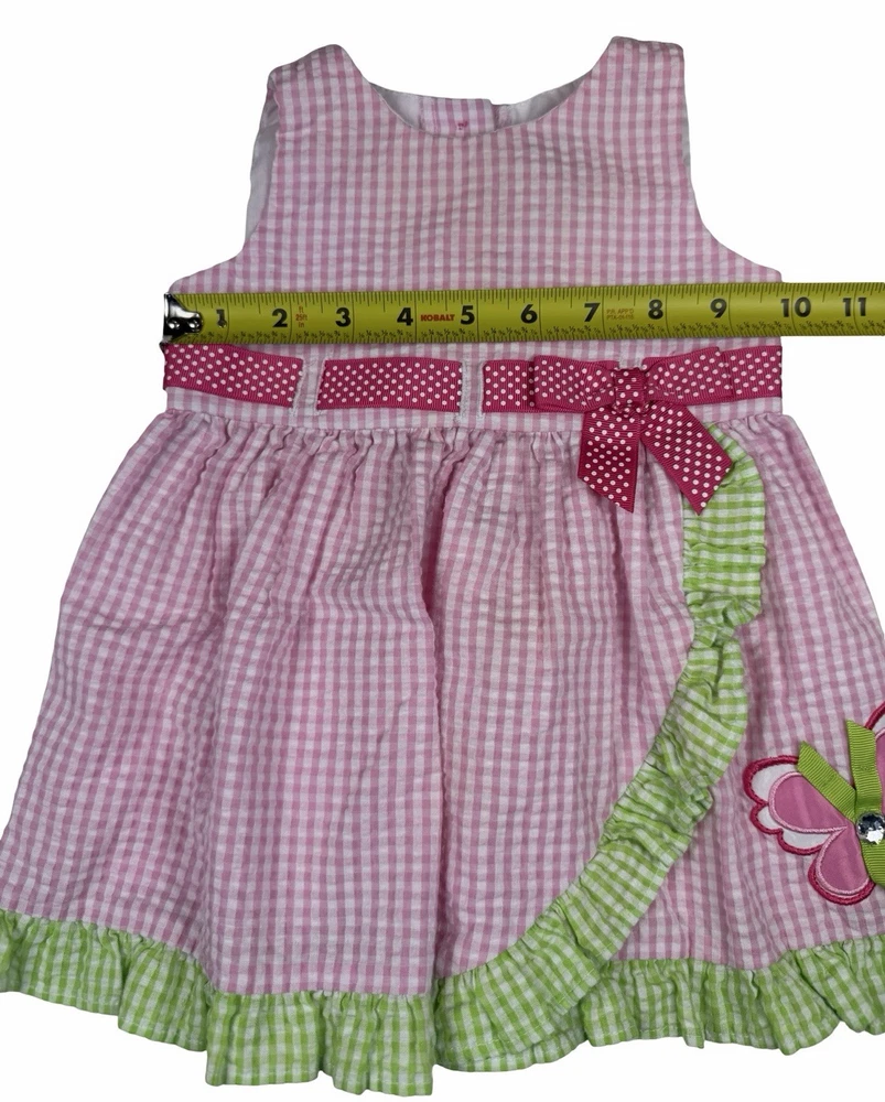 Adorable Rare Editions pink gingham toddler dress with colorful spring details. This charming dress features a decorative polka dot ribbon belt with bow, green gingham ruffle trim, and a butterfly appliqué with rhinestone accent, giving it a sweet boutique-style look. Perfect for Easter, spring photos, church, parties, or special occasions. Features • Brand: Rare Editions • Pink gingham pattern • Butterfly appliqué with rhinestone detail • Decorative polka dot ribbon belt and bow • Green gingham ruffle trim • Button closure in back Size Size tag is missing. Based on measurements, the dress appears to fit approximately 12–18 months. Please compare measurements to ensure proper fit. Measurements (laid flat): • Pit to pit: 10 inches • Length (shoulder to hem): 15.5 inches Condition Good pre-owned condition with normal wear consistent with use. Freshly laundered but may retain a faint detergent scent from previous washing/storage. Please review all photos carefully for full condition details.