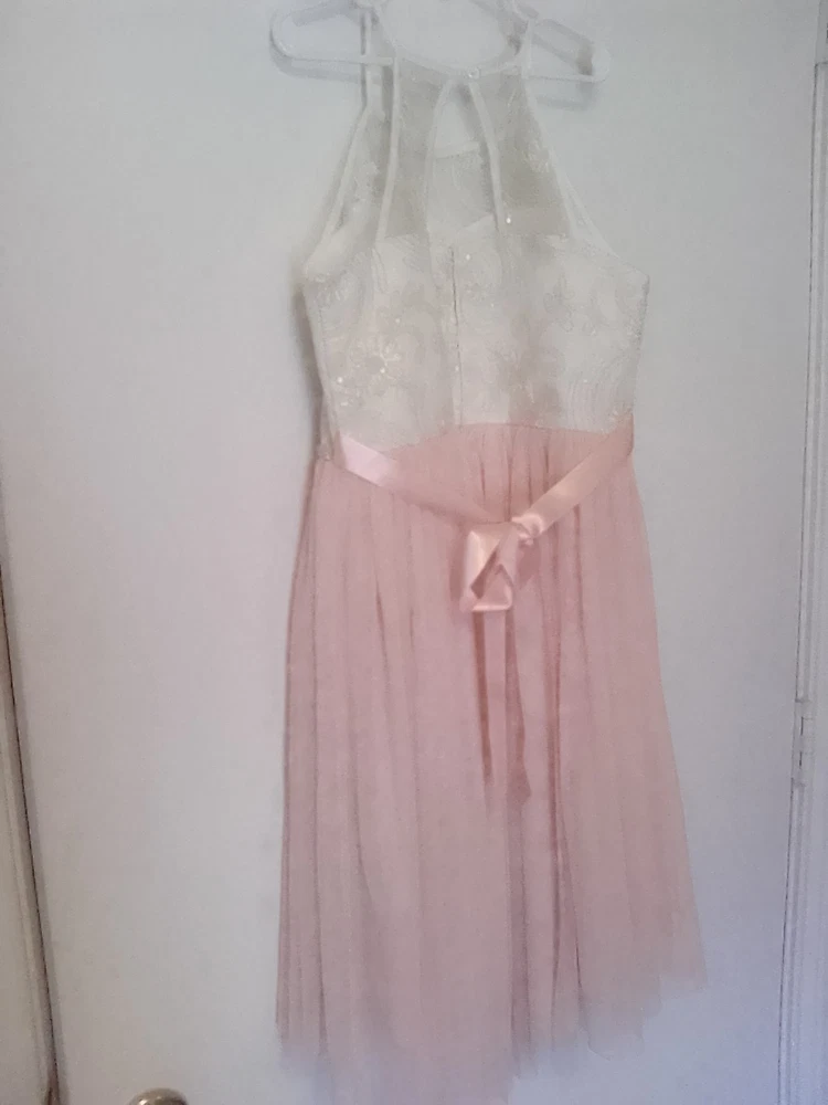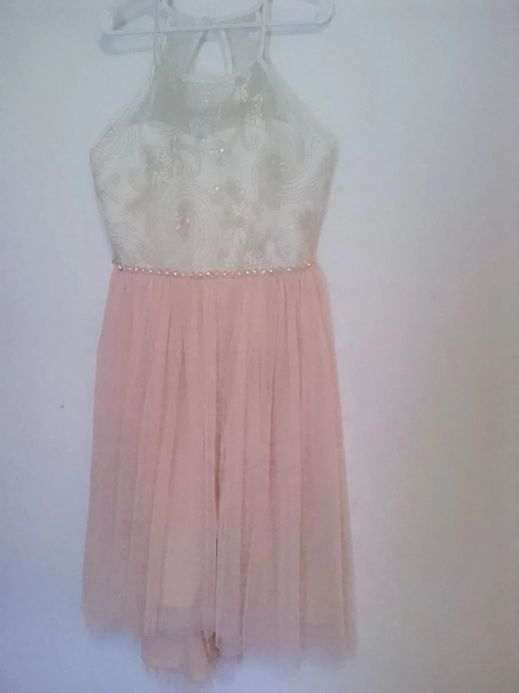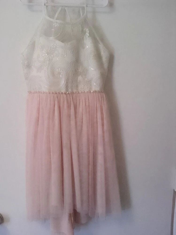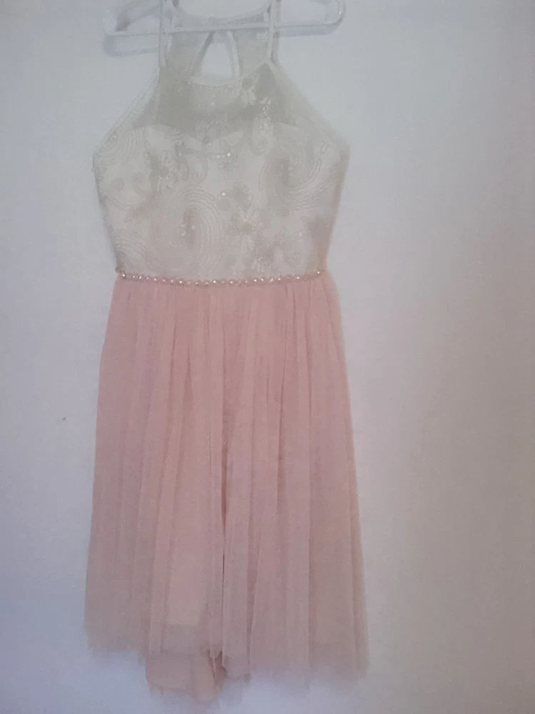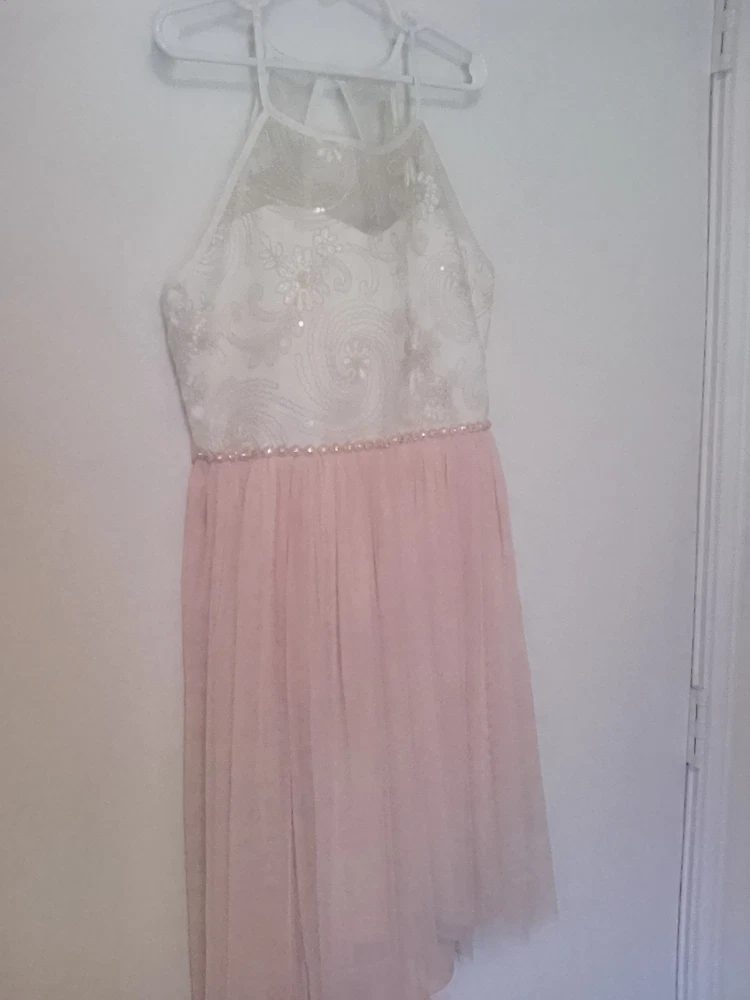 The Rare Editions Halter Sequin Rhinestone Bling Tie Back Pink Girls Dress in size 10 is a stunning formal dress perfect for a wedding or special occasion. Made of knit fabric with a stretch fit, this A-line dress features a strappy sleeve design, studded accents, and rhinestone detailing for added sparkle. The knee-length dress in a beautiful pink color adds a touch of fairy-like charm to any young girl's wardrobe. Made of 100% polyester and designed by Rare Editions, this dress is sure to make a statement and turn heads at any event.