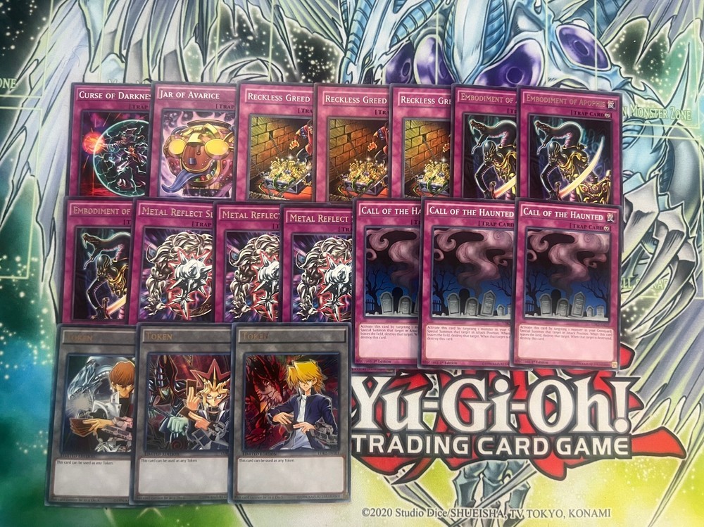 Hello! You are purchasing the deck list below, the cards will be English, real, and near mint to light play condition at worst. All decks are built with the lowest rarities for cards in mind to keep the price of the deck low and affordable for all duelists! Some cards may be in speed duel printing if this is the cheapest available copy of the card, but do not worry these are real cards and legal for tournament use! Purchase with confidence and safety! As an added bonus one pack of card sleeves will be included with your deck! Thanks again and good luck dueling! Now here's the decklist; Monsters: 1| Slifer the Sky Dragon 1| Obelisk The Tormentor 1| The Winged Dragon of Ra 1| Tragoedia 2| Hardened Armed Dragon 3| Nimble Manta 3| Baobaboon Spells; 1| Monster Reborn 1| Dark Hole 1| Book of Moon 1| Soul Charge 2| Smashing Ground 2| Mausoleum of the Emperor 3| Fiend's Sanctuary 3| Supply Squad 3| Mystical Space Typhoon Traps: 1| Jar of Avarice 1| Curse of Darkness 3| Call of the Haunted 3| Metal Reflect Slime 3| Embodiment of Apophis 3| Reckless Greed 3 Free Tokens featuring Yami Yugi, Joey, and Kaiba!